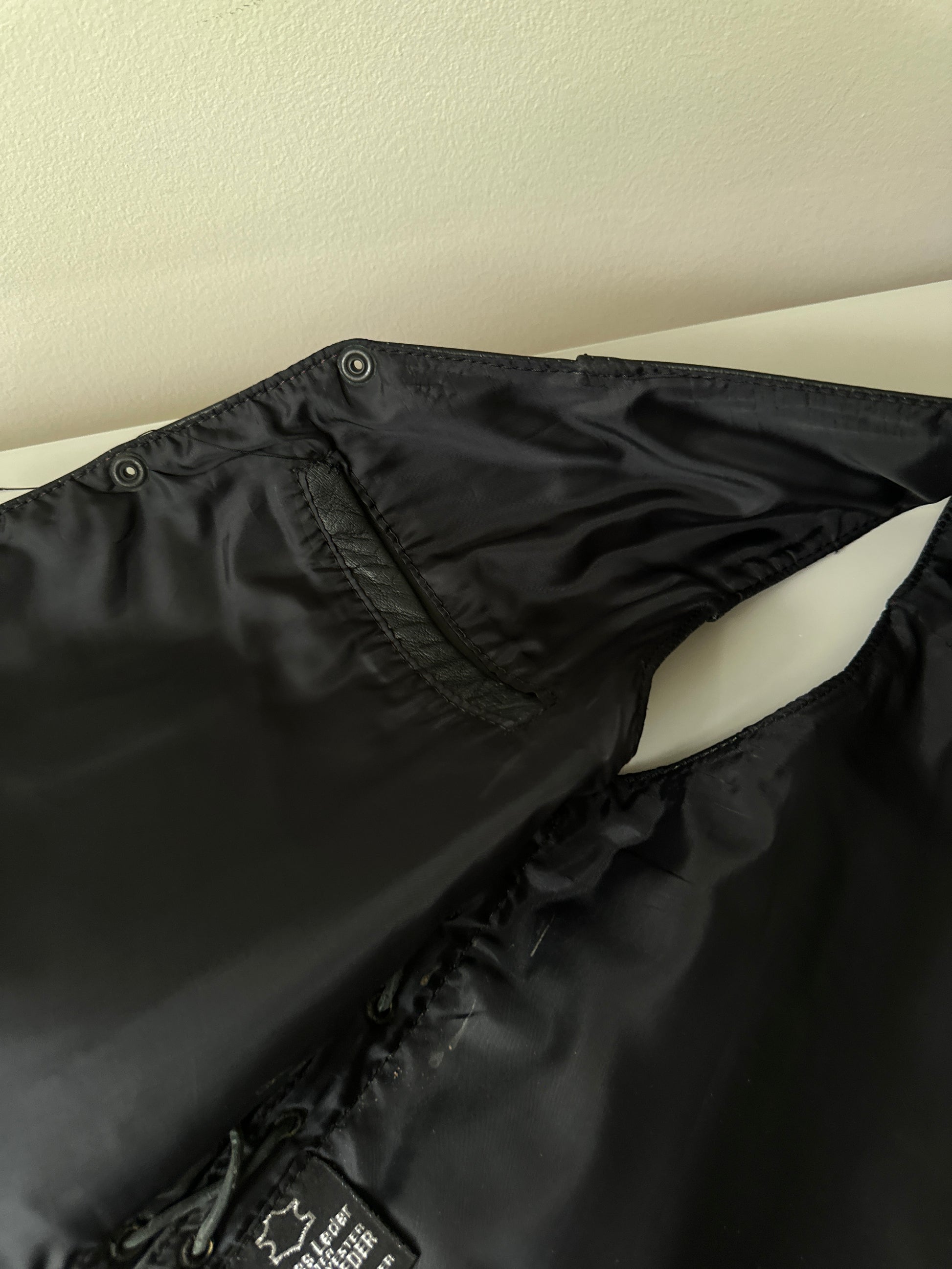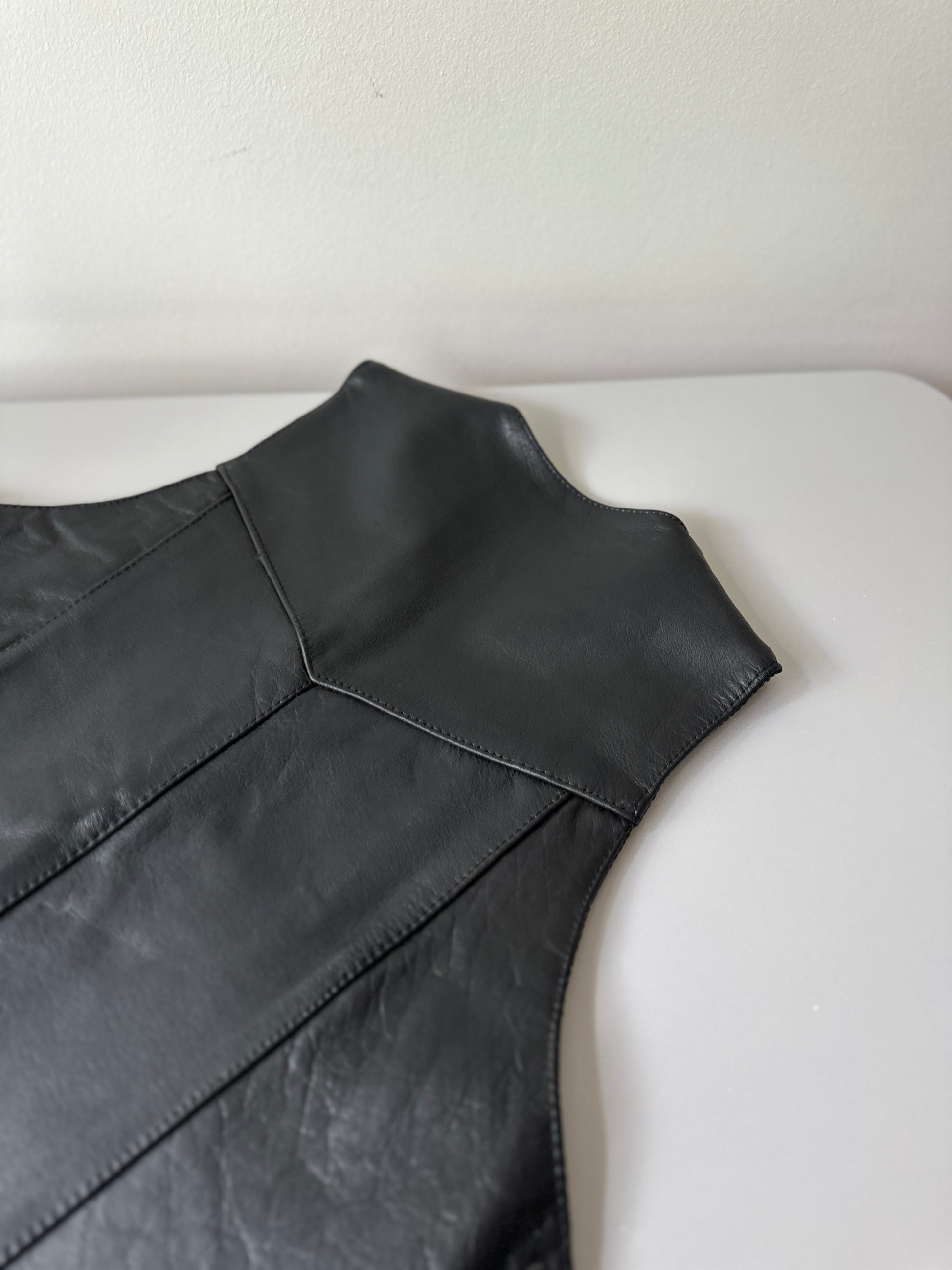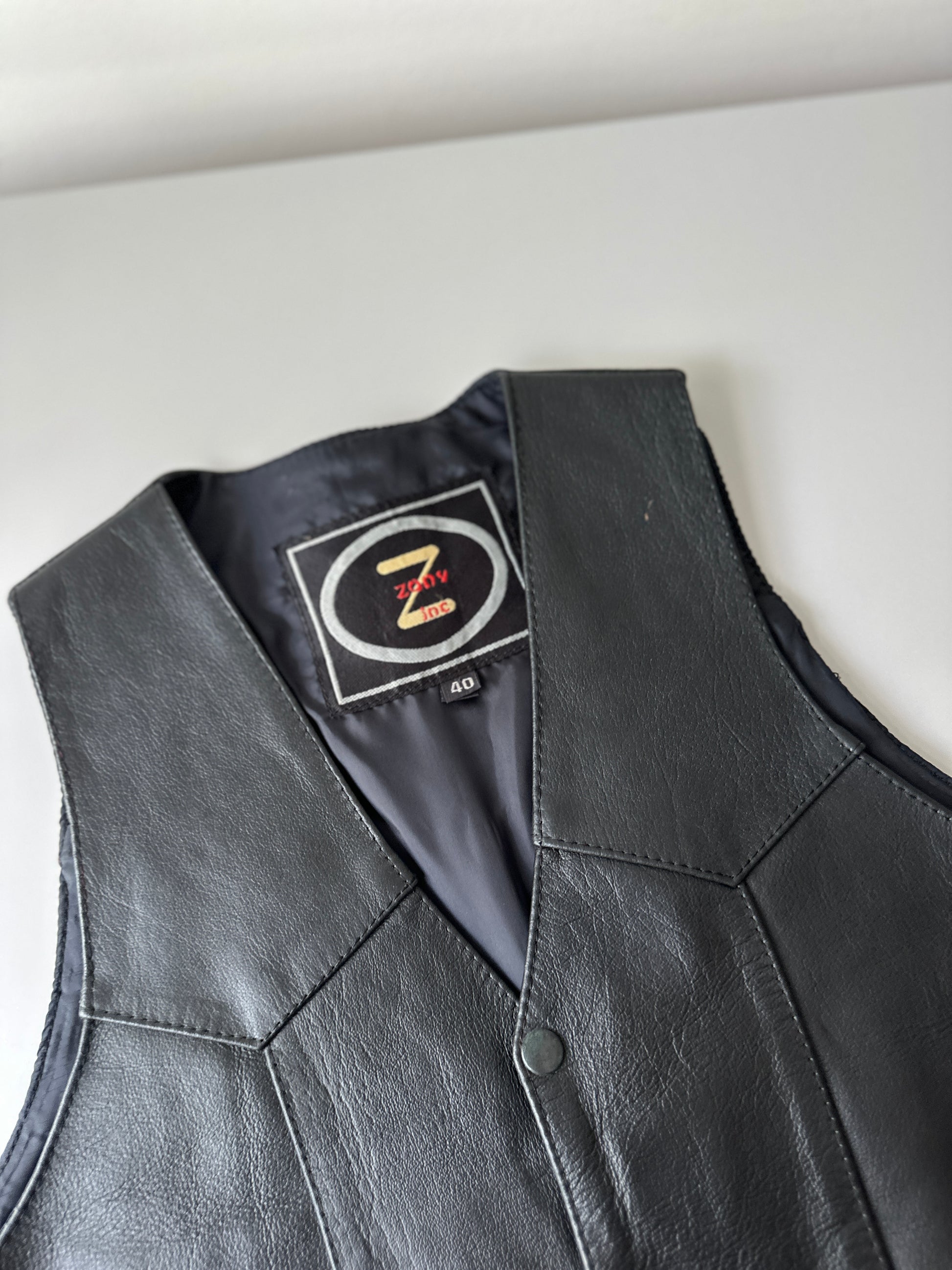 description. just your overall fantastic leather vest with cross tied sides and clip close button front