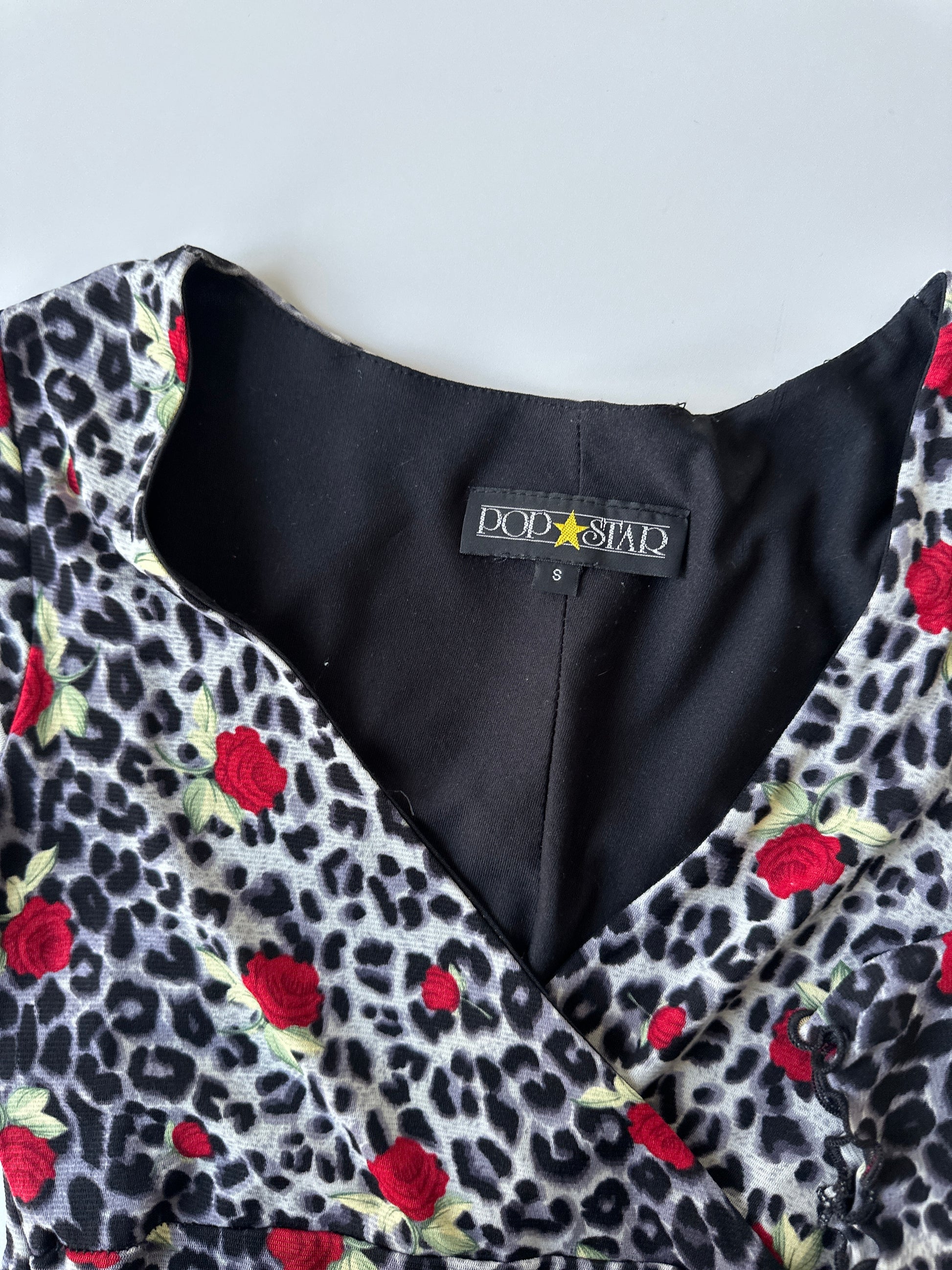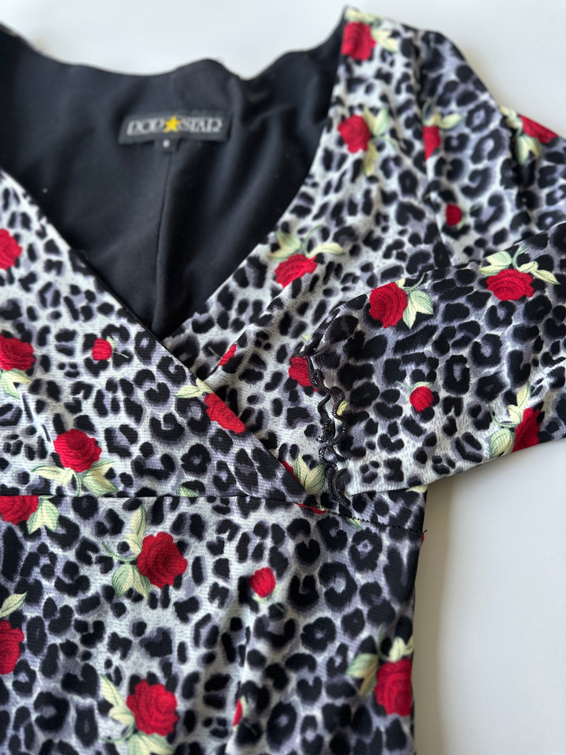description. its giving mob wife aesthetic!! it's such a fantastic dress, with a low cut cross over v neckline and mid length sleeve. the sheer stretchy fabric over a black lining, not to mention the fact that its grey scale leopard print with red roses all over it... what else could you ask for?