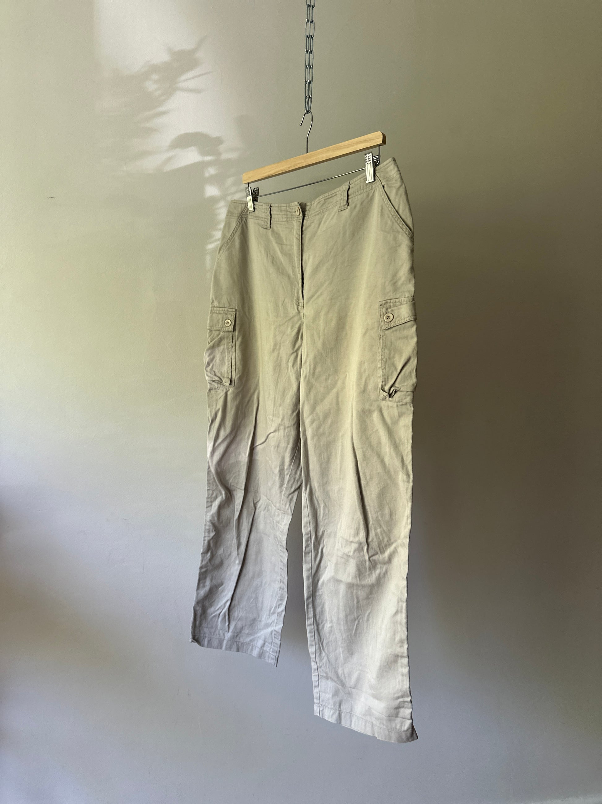 description. a light beige coloured long cargo pant with two side pockets on the thigh. these can be worn high waisted or on the hips depending on your measurements. the style is very much in trend over the past year or so, but I don't think these will ever date