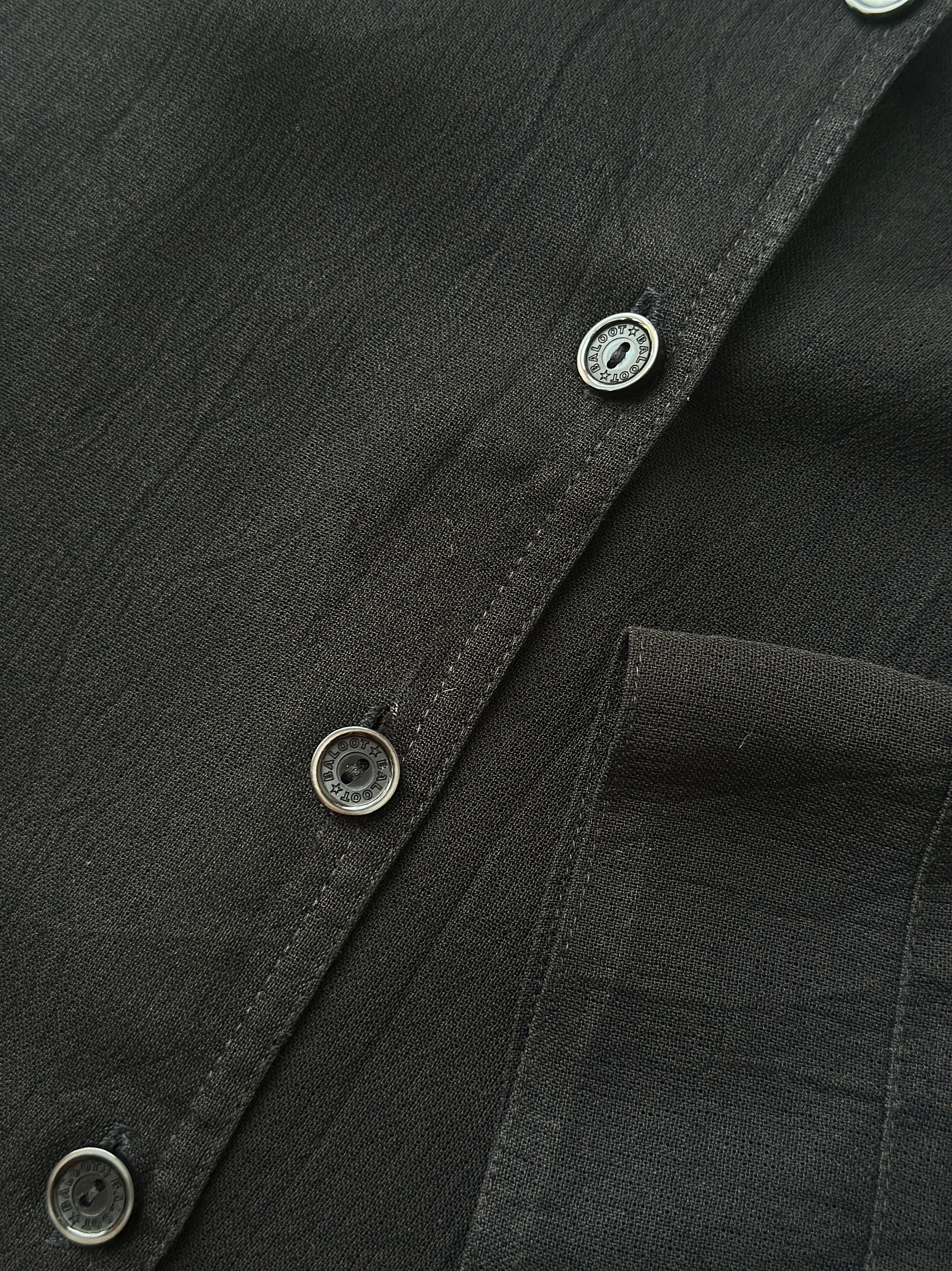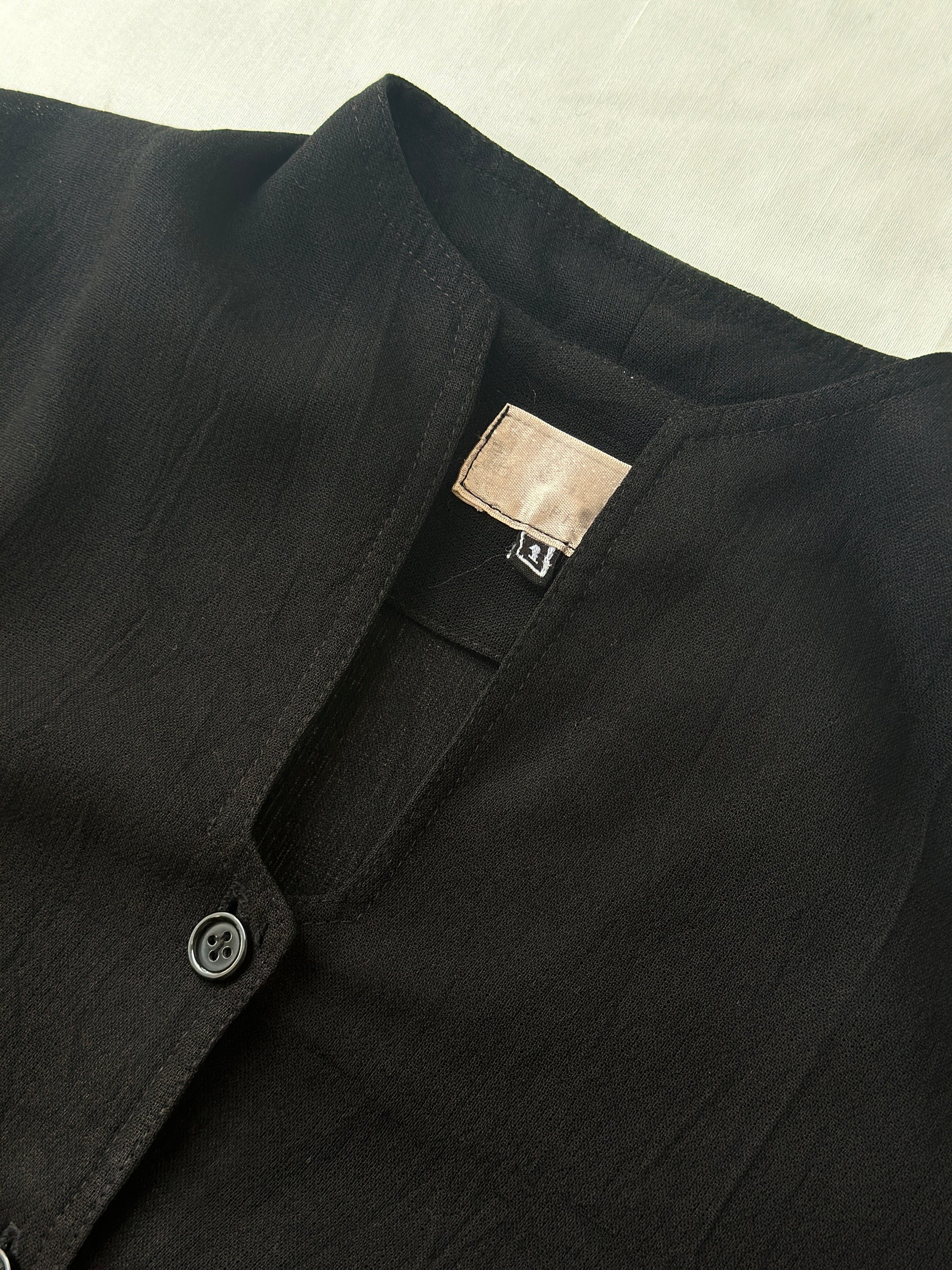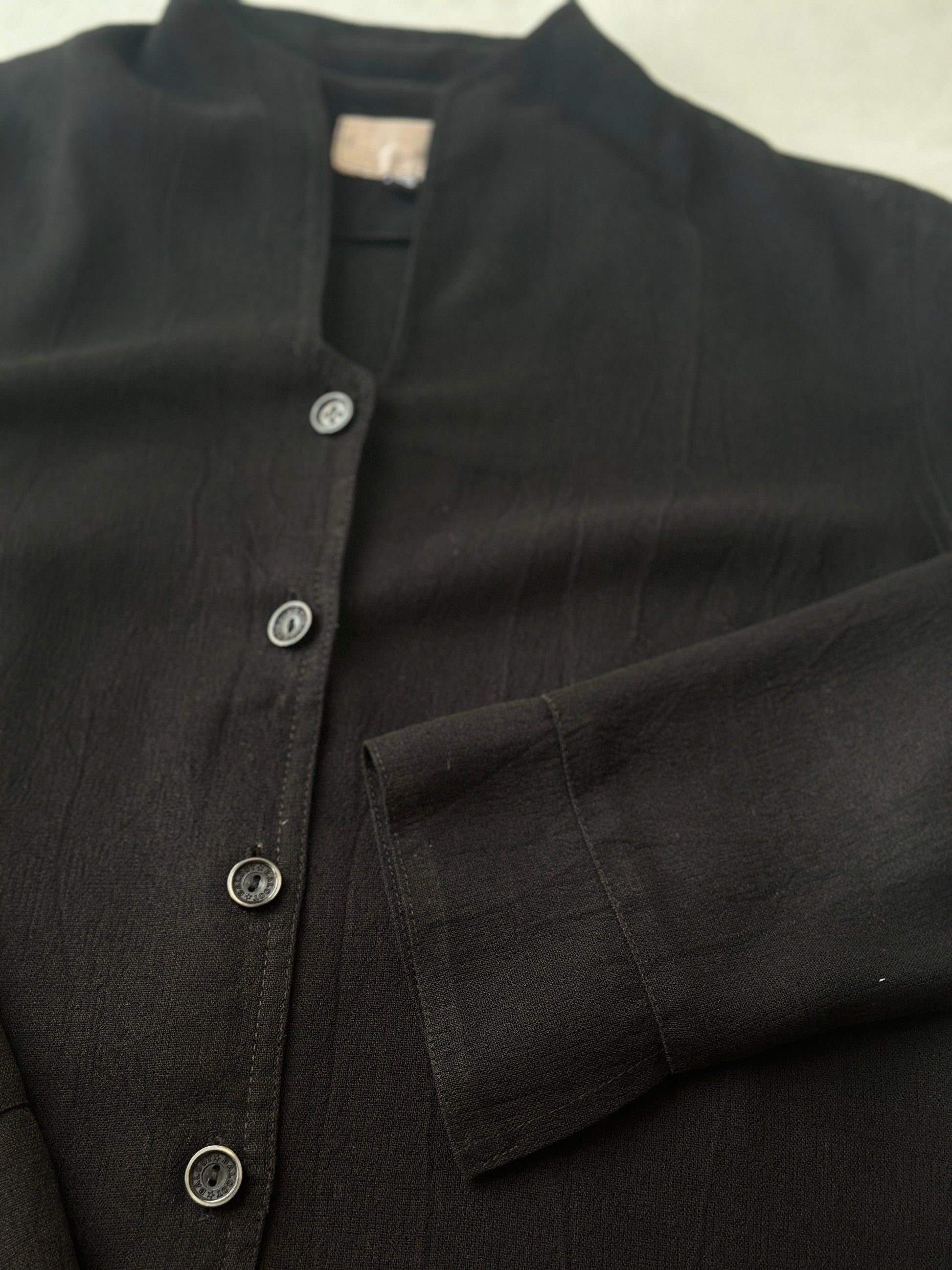 description. the jacket/throw-over has extremely light weight and see-through material, no collar but the shape of the neckline is unique, the length comes down mid-thigh/knees depending on how tall you are. the buttons are pretty cool with the brand name on them