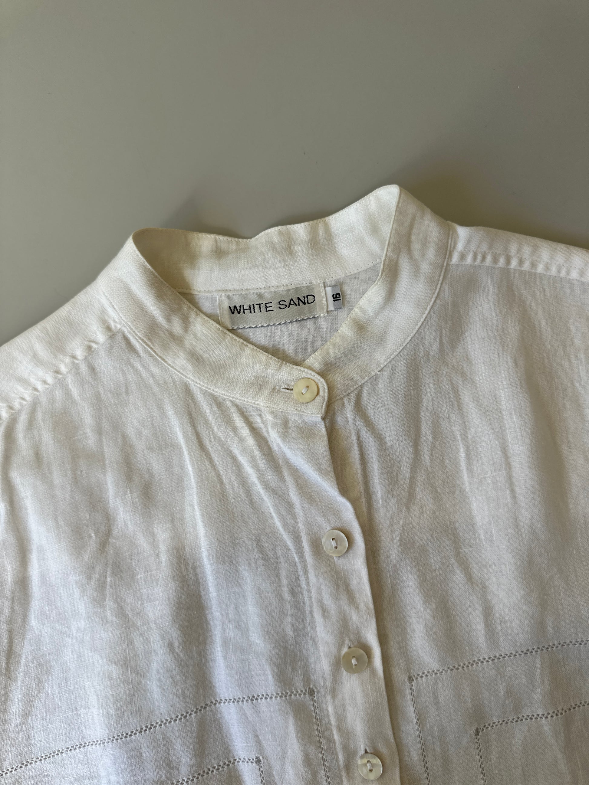 description. a fantastic white linen button up with no collar, hole pattern on the front and long slits up the sides