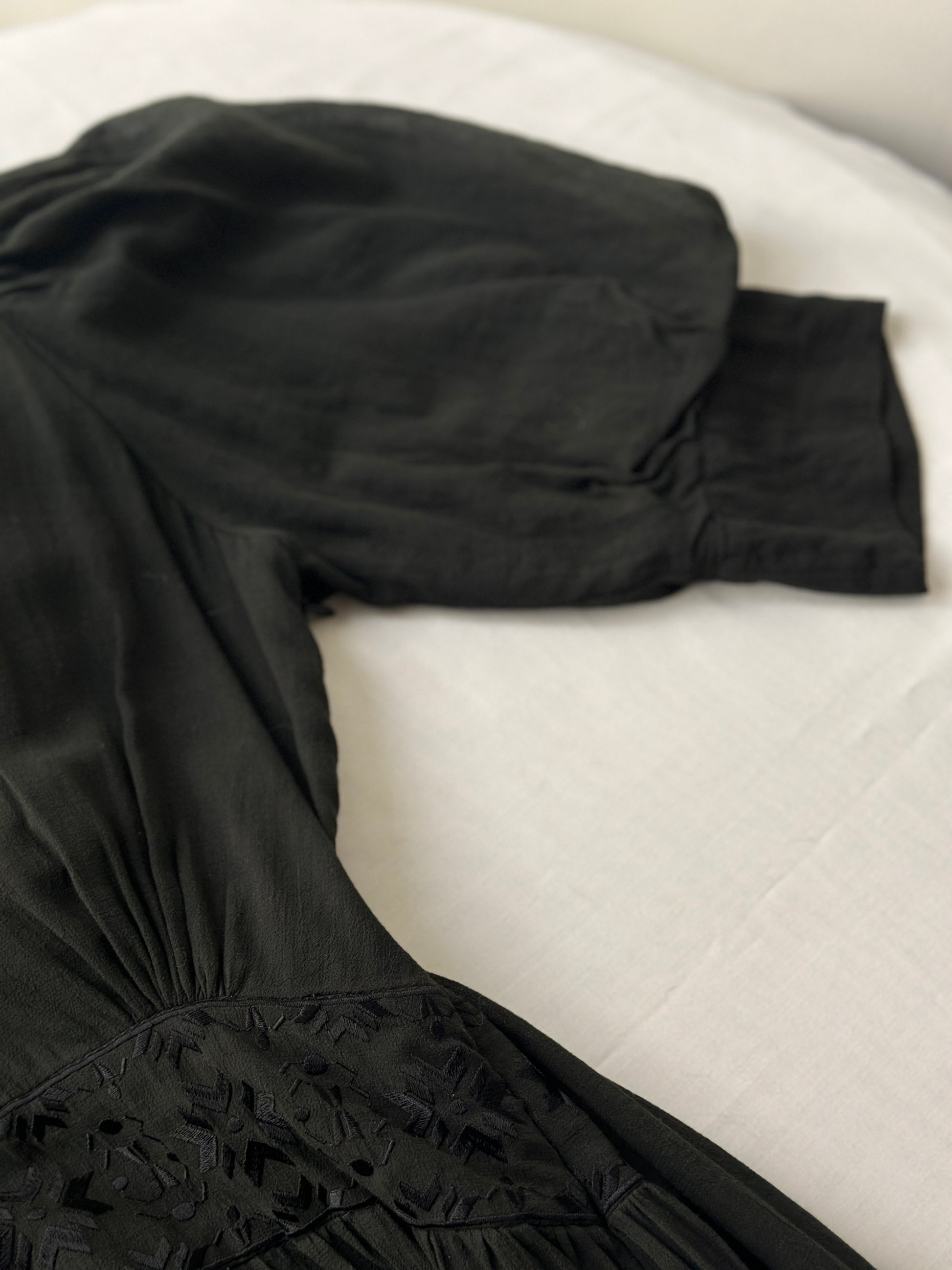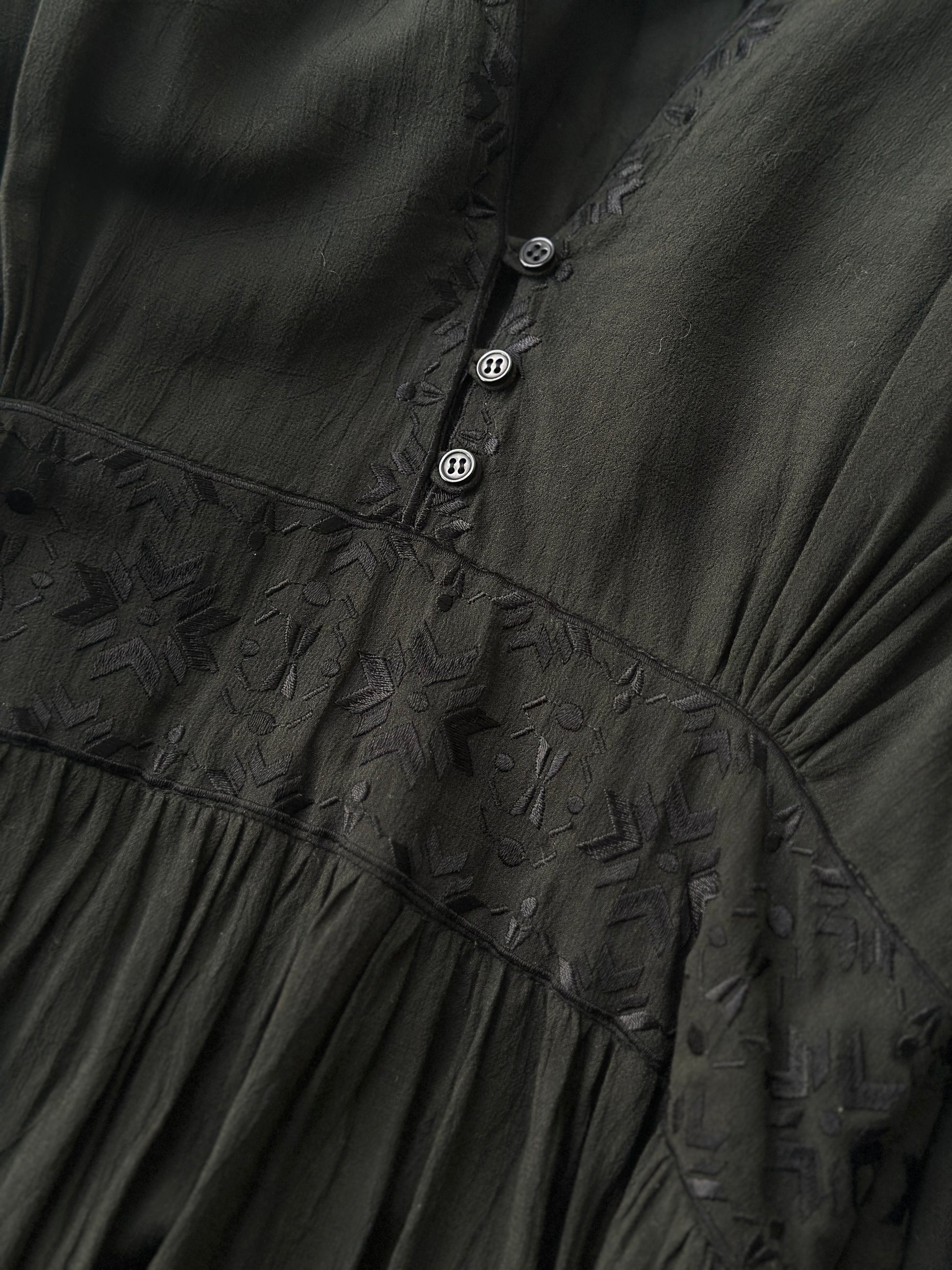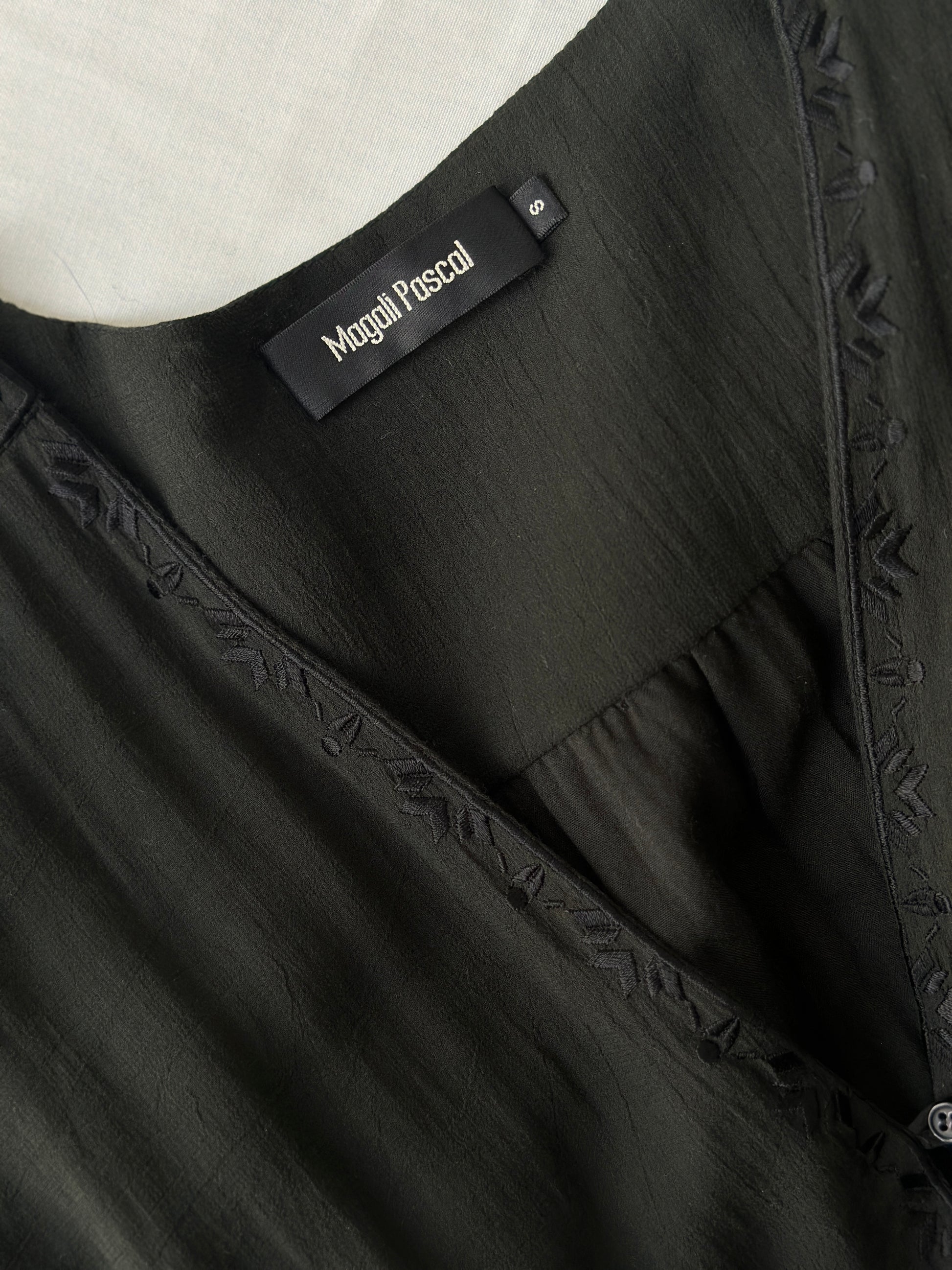 description. beautiful embroidered black cotton Magali Pascal dress, the length is mid calf with a puffed sleeve and three button up front. currently modern Magali Pascal dresses retail between $200-$700
