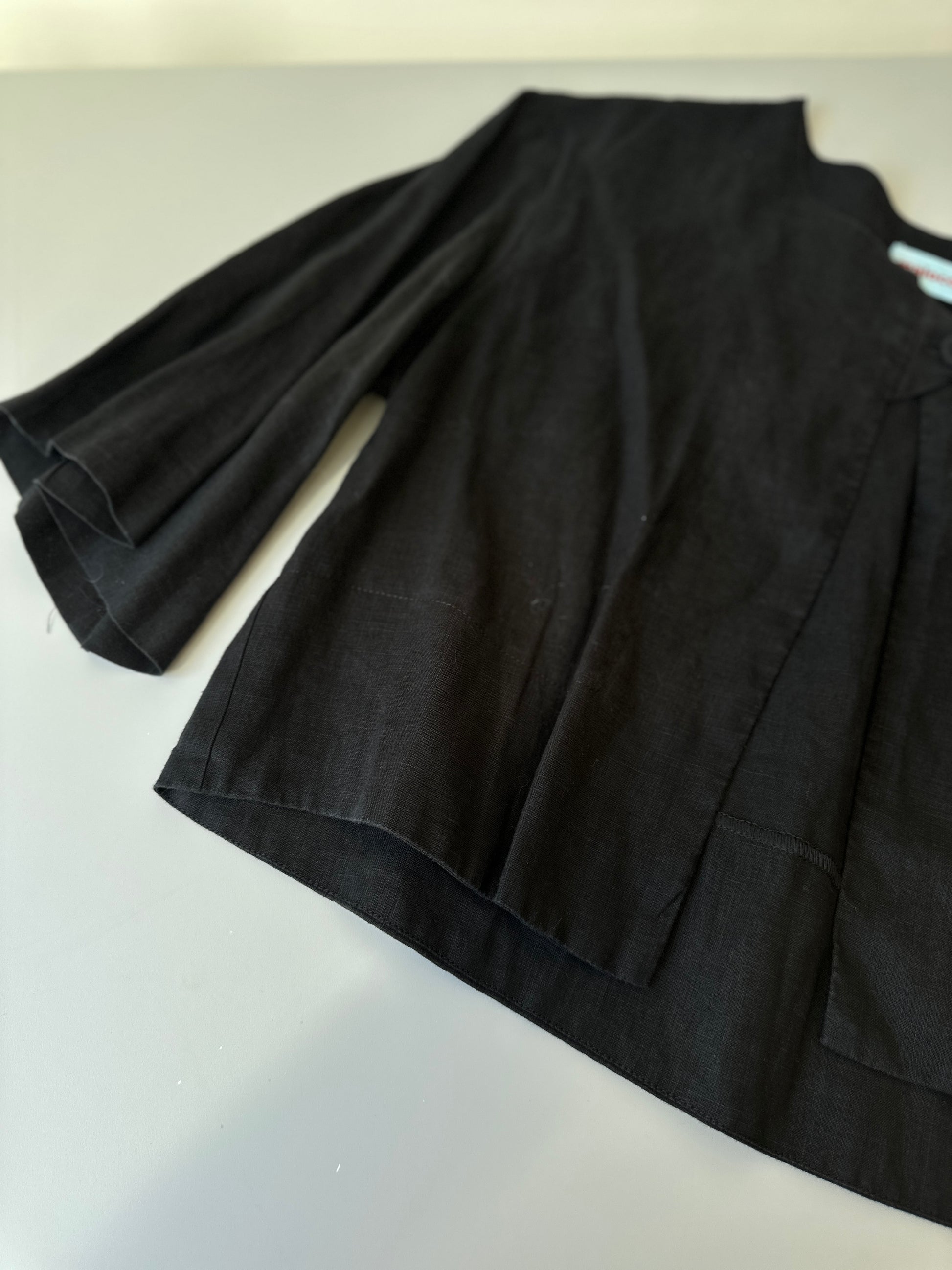 description. a great addition to the closet. cropped, linen, mid length sleeve top with a single button close right under the neckline