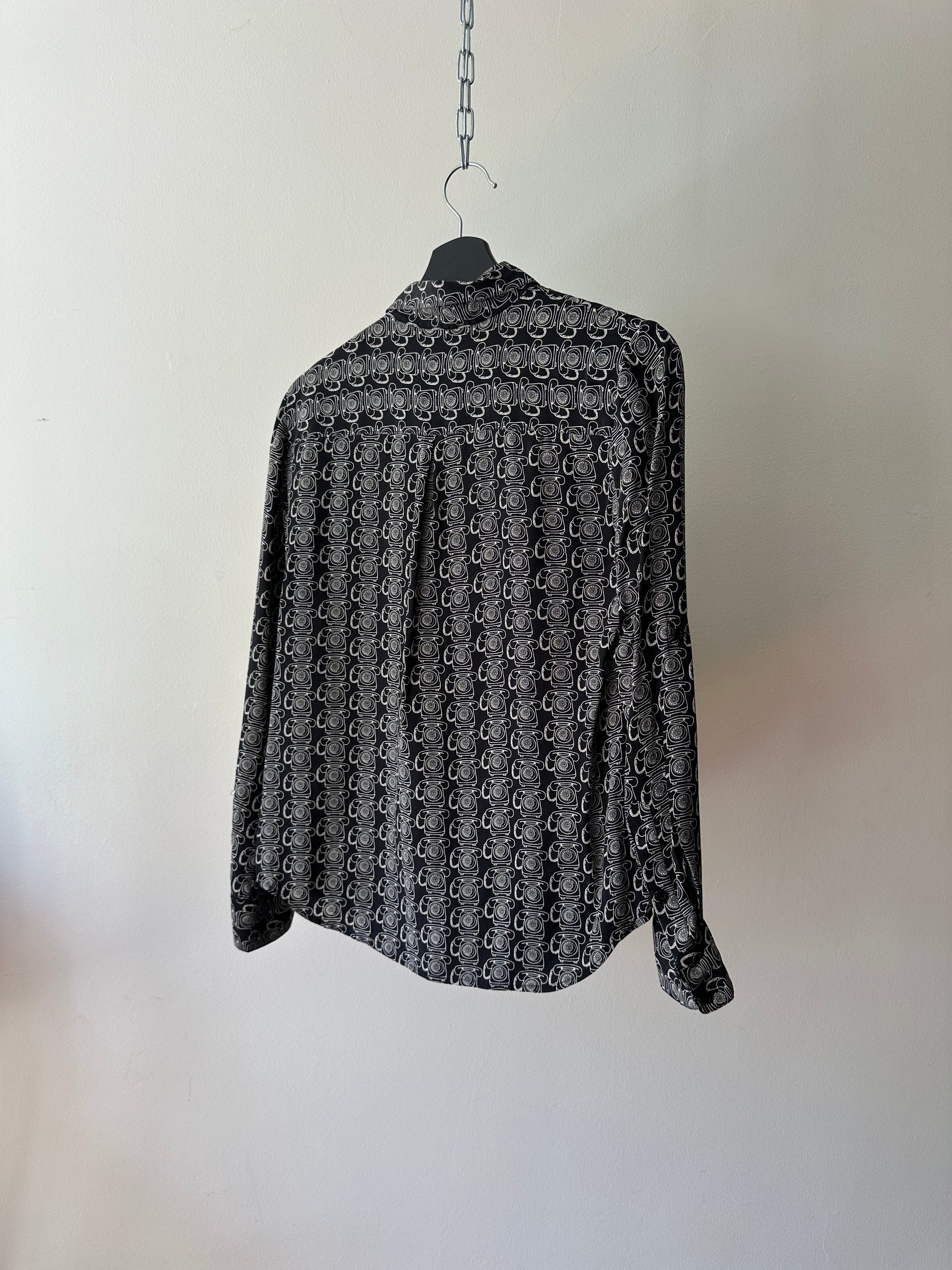 description. sorry but this is the COOLEST pattern, telephones??? pure silk button up with two front pockets and branded buttons