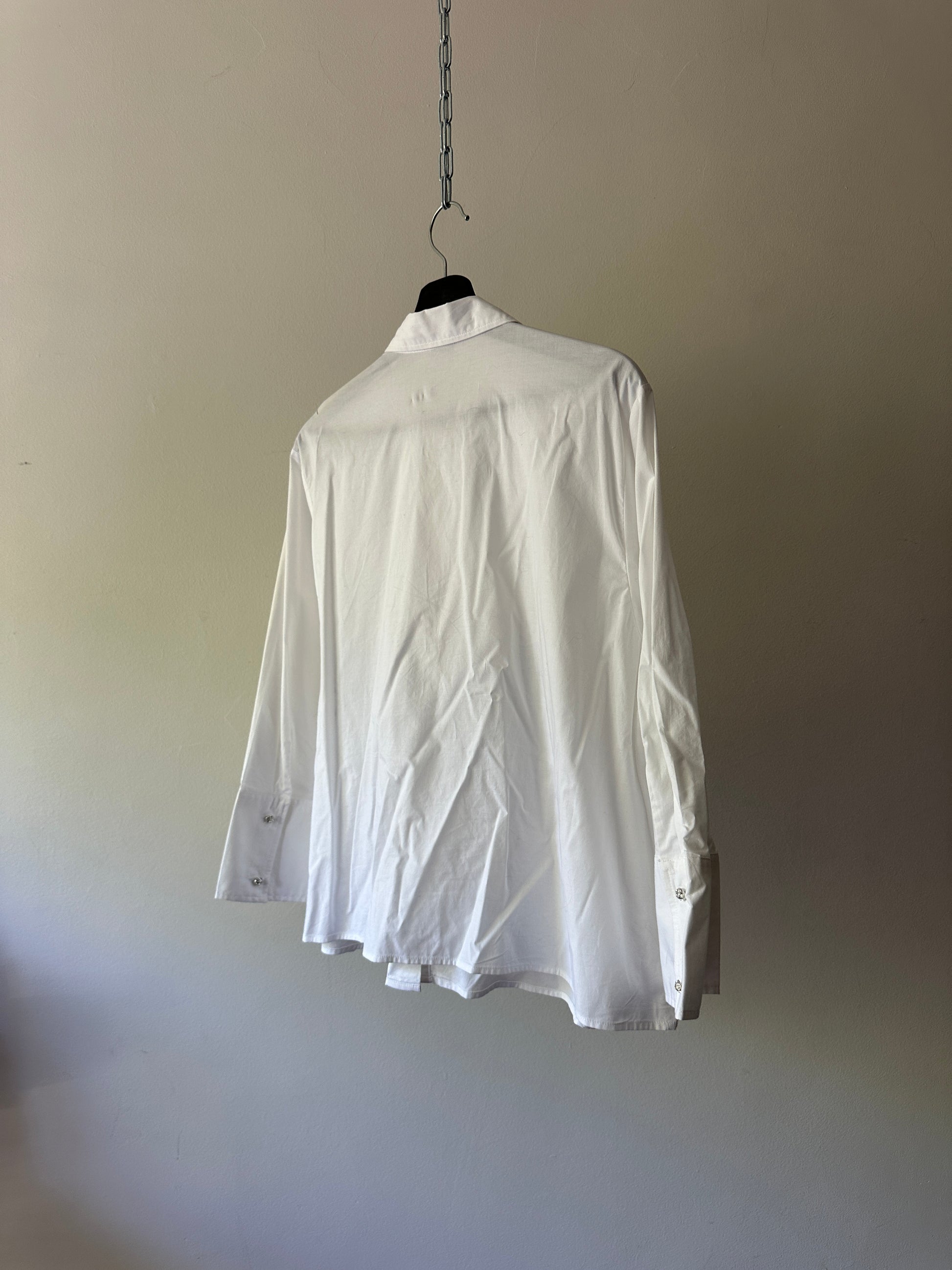 description. a very funky collared shirt that is great for the office, or a night out with the gals. the rectangle mirror clustered details on the front are so special but I'm obsessed with the buttons! it has a wide square fit, and is a nice light cotton fabric