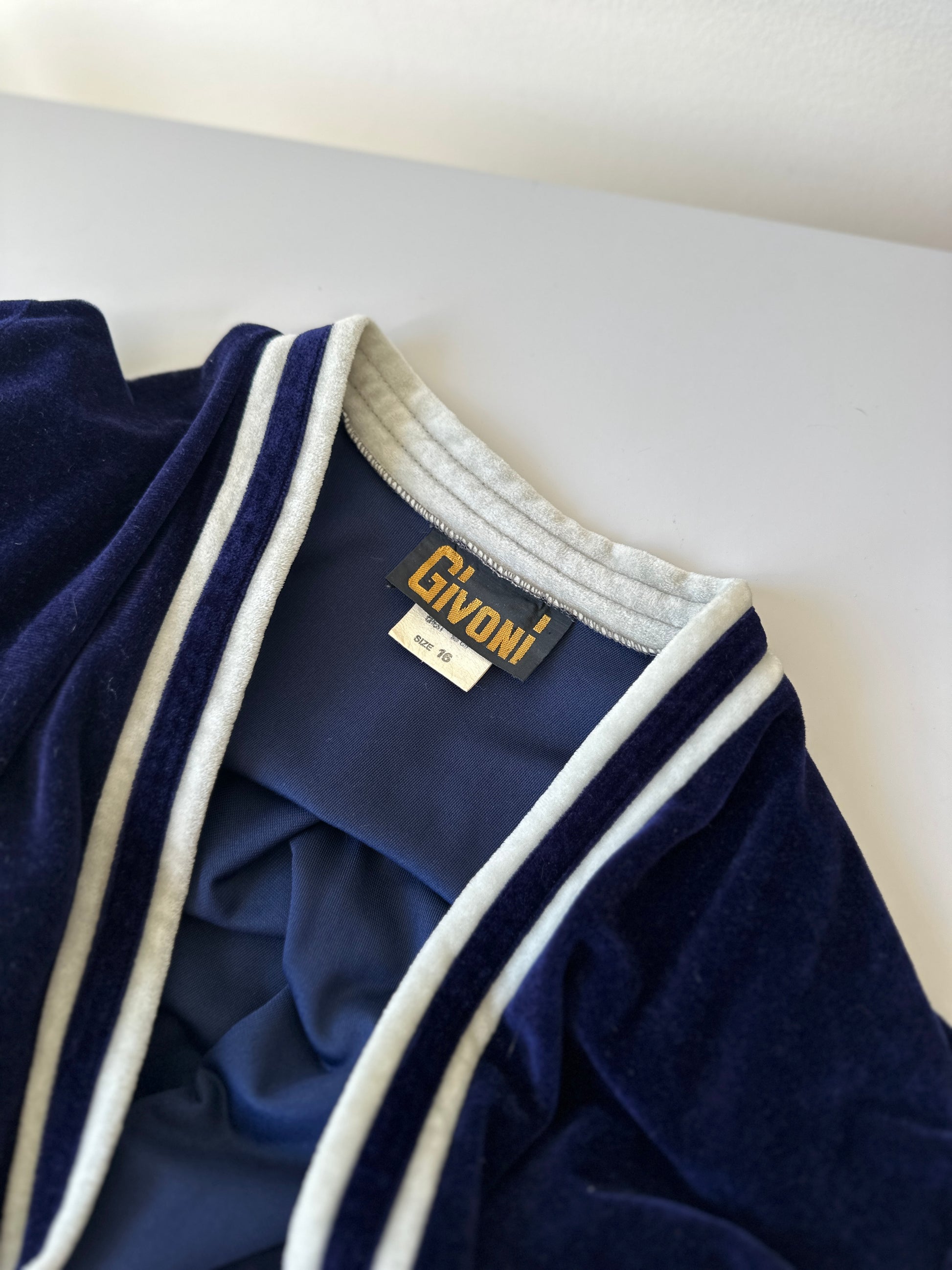 description. one of our STUNNING navy blue velour dressing gown with a white double stripe along the inner hem and collar, comes with the original tie too
