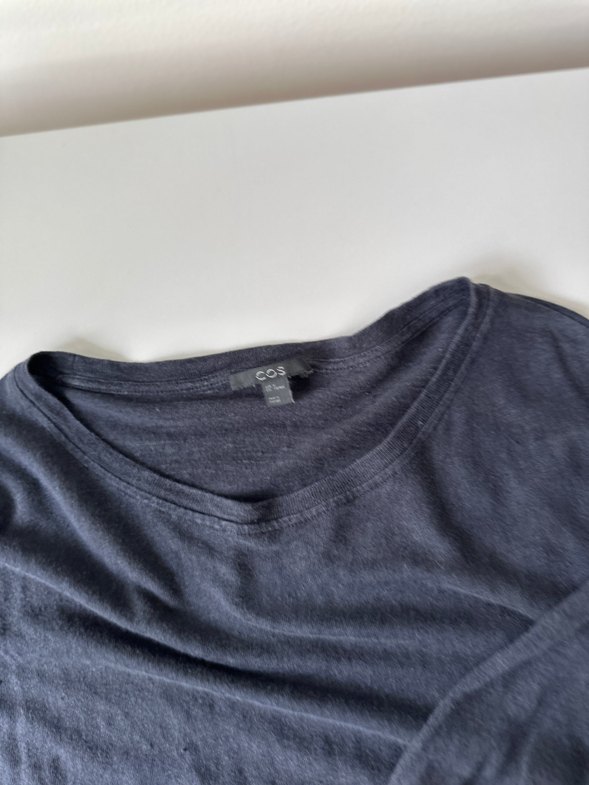 description. a simple navy blue lightweight linen cardigan with cuffed sleeves and a straight hemline