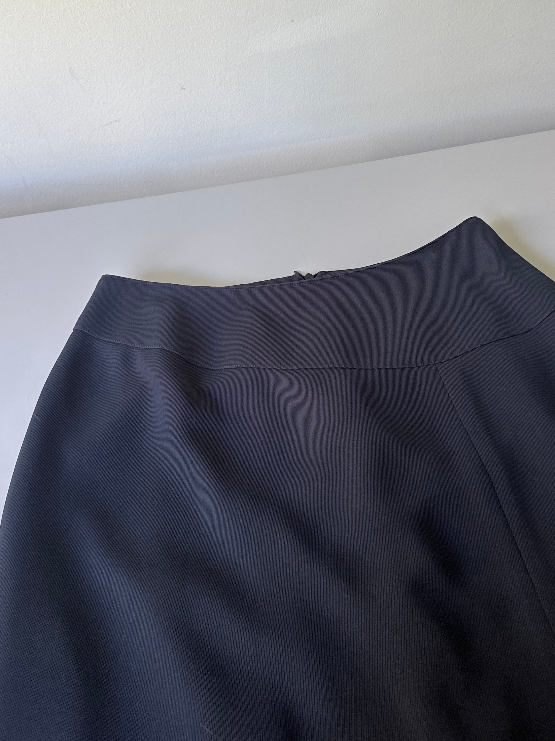 description. a beautiful long line straight skirt, navy in colour with a slight grey/dusty shade. there's a large leg slit on the front, and the waistband is shaped in a sweet diagonal making it a perfect 90s piece. Australian made.