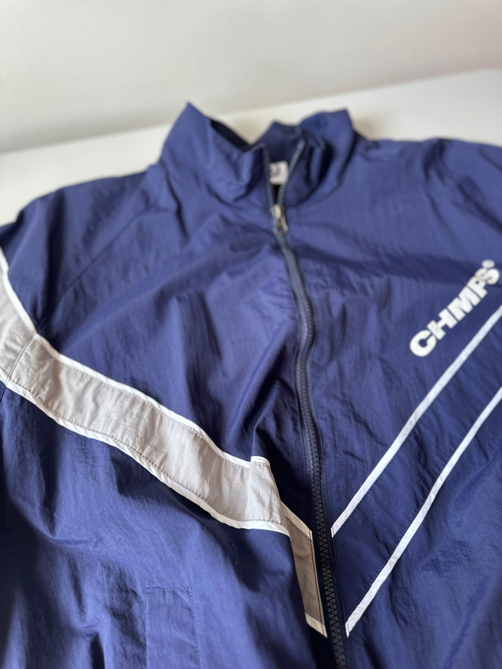 description. a cool Korean brand, this windbreaker is super cool. a navy colour with V shape coming down into the middle of the zipper, it's giving 80s track and field