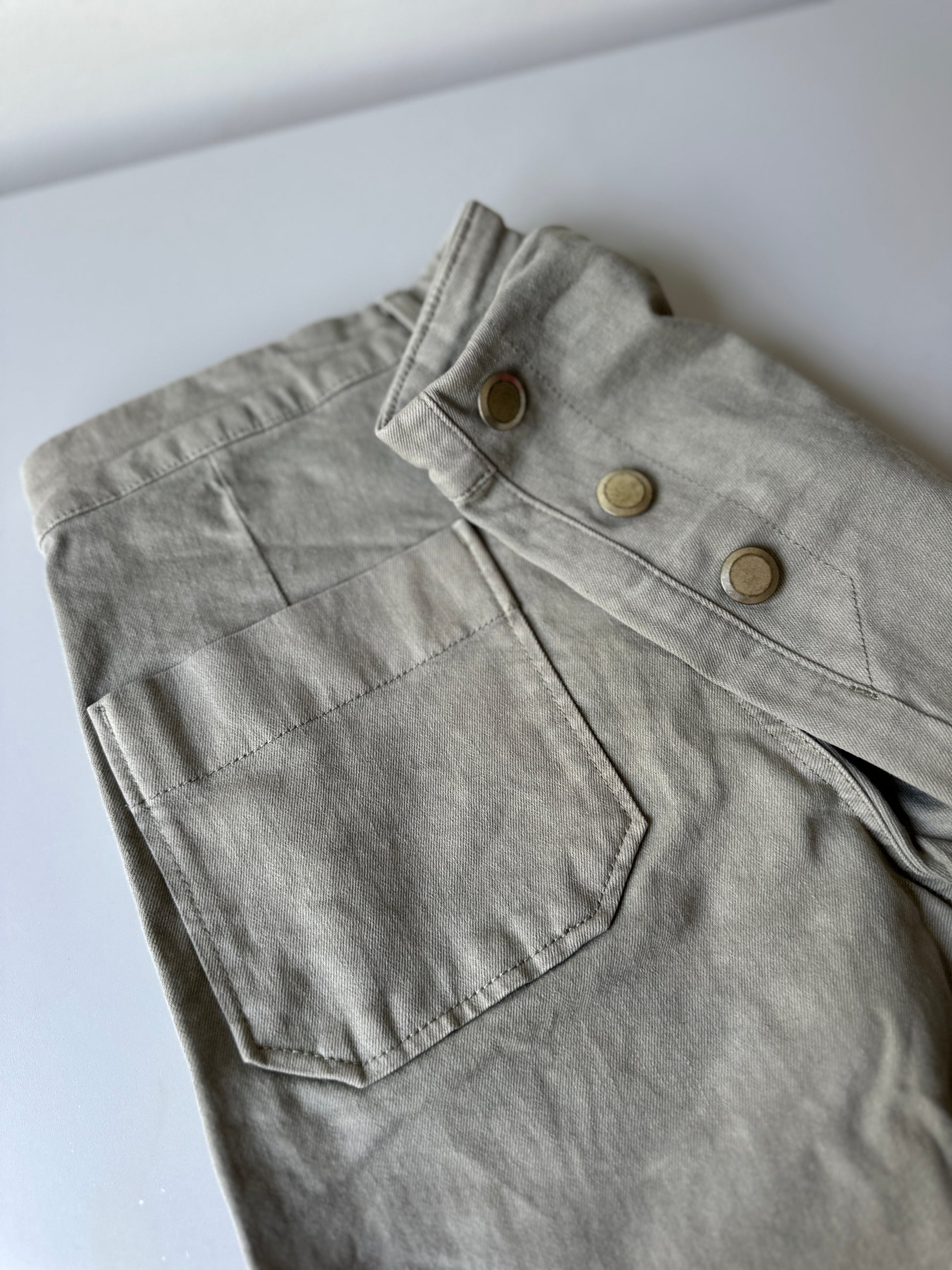 description. a very very cool pair of high waist jeans. with the silver button details on both sides of the hips, a wide leg flare and stretch to the fabric, top it all off with the funkiest light faded olive colour way. these babies need a new home!