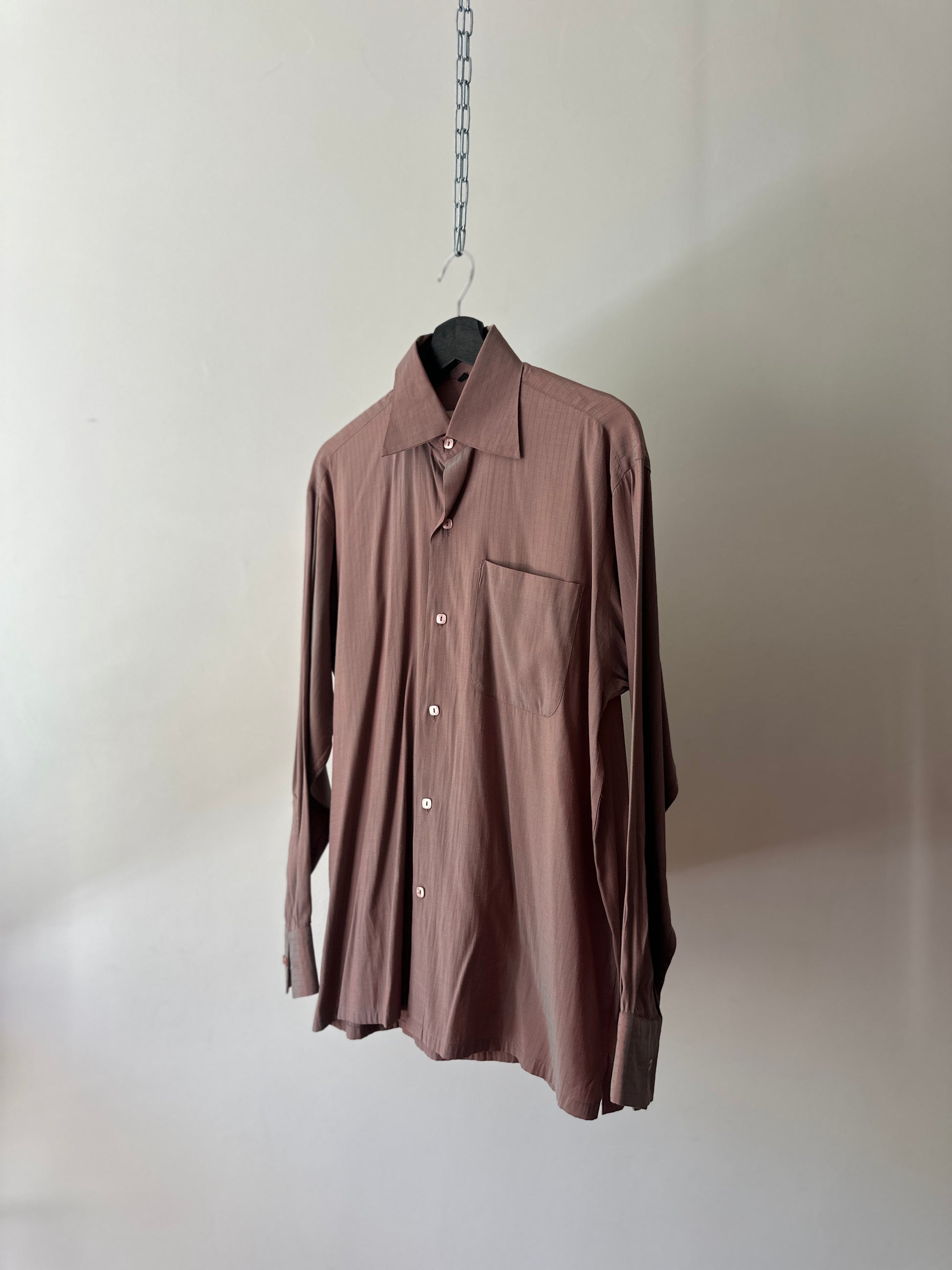description. soft red/pink and green undertone opaque dress shirt, vintage tag logo multimillion with a front pocket on the left chest and unique square buttons