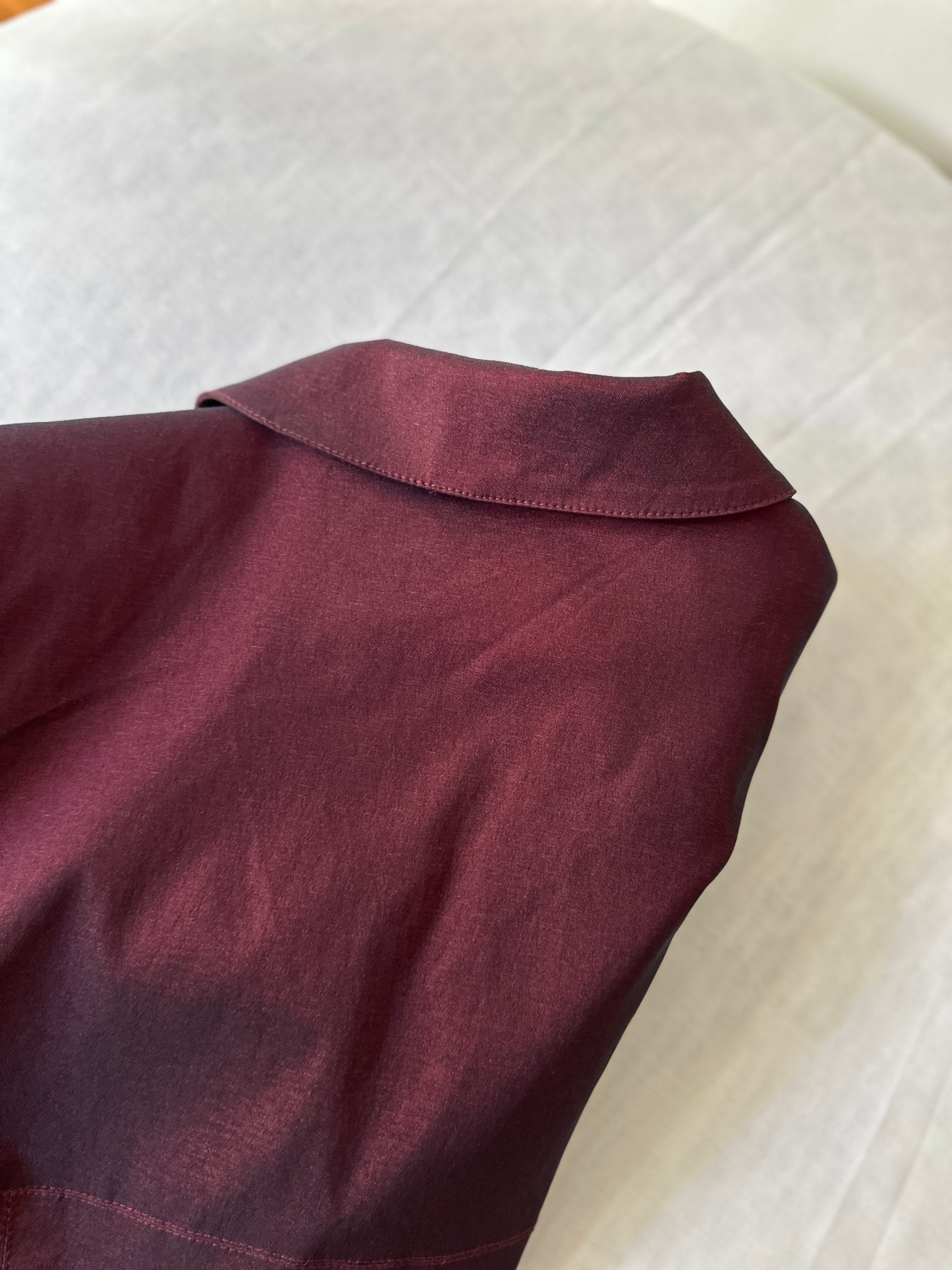 description. I adore this jacket, and there is a pair of pants that pair so so well with it they almost should have come in a pair. the opaque red moves with the body and light when it hits the fabric. this is a perfect piece for anyone who wants to make a statement, and look good while doing it- go get the pants if they are your size and please send me pictures of them together