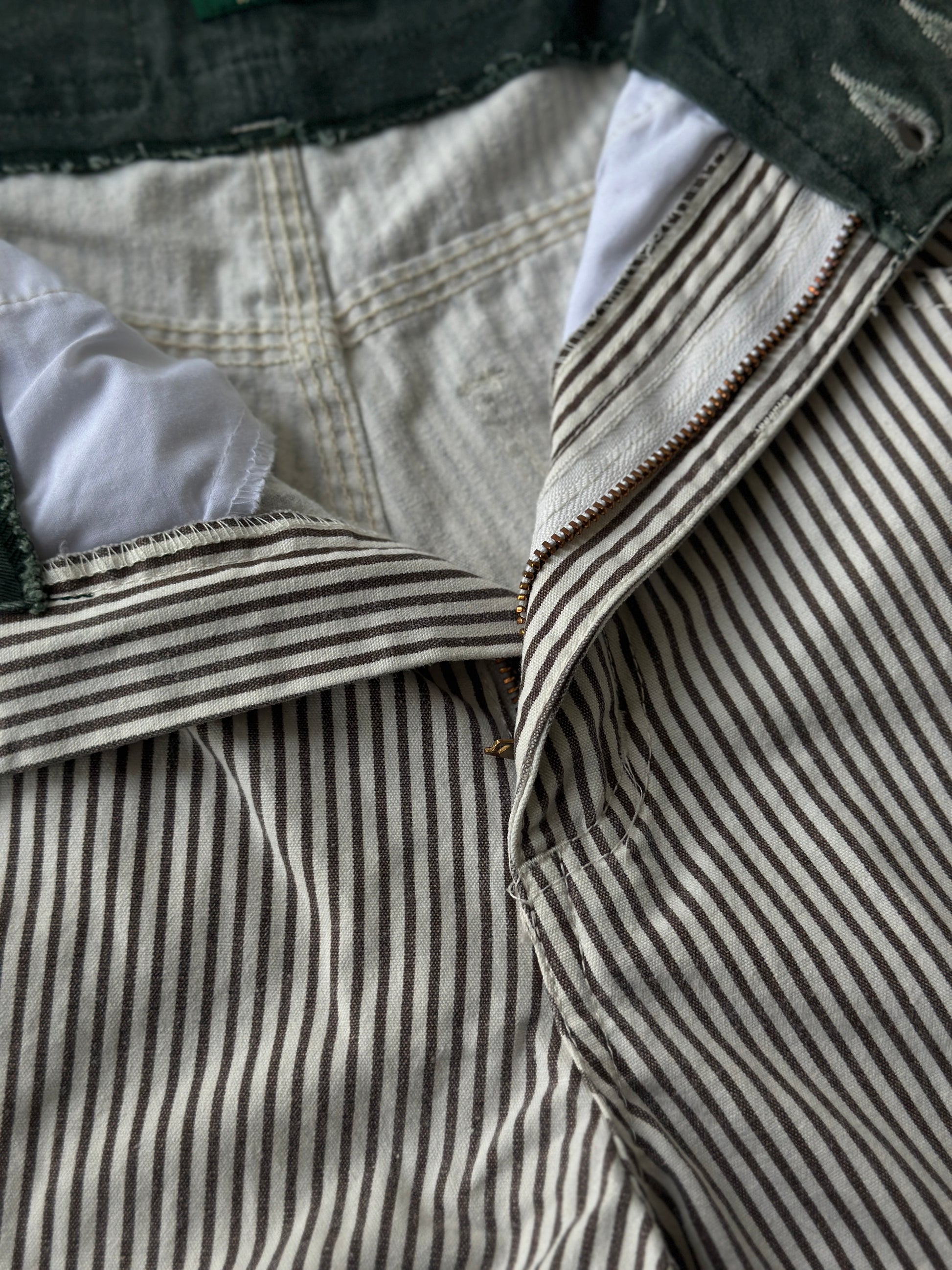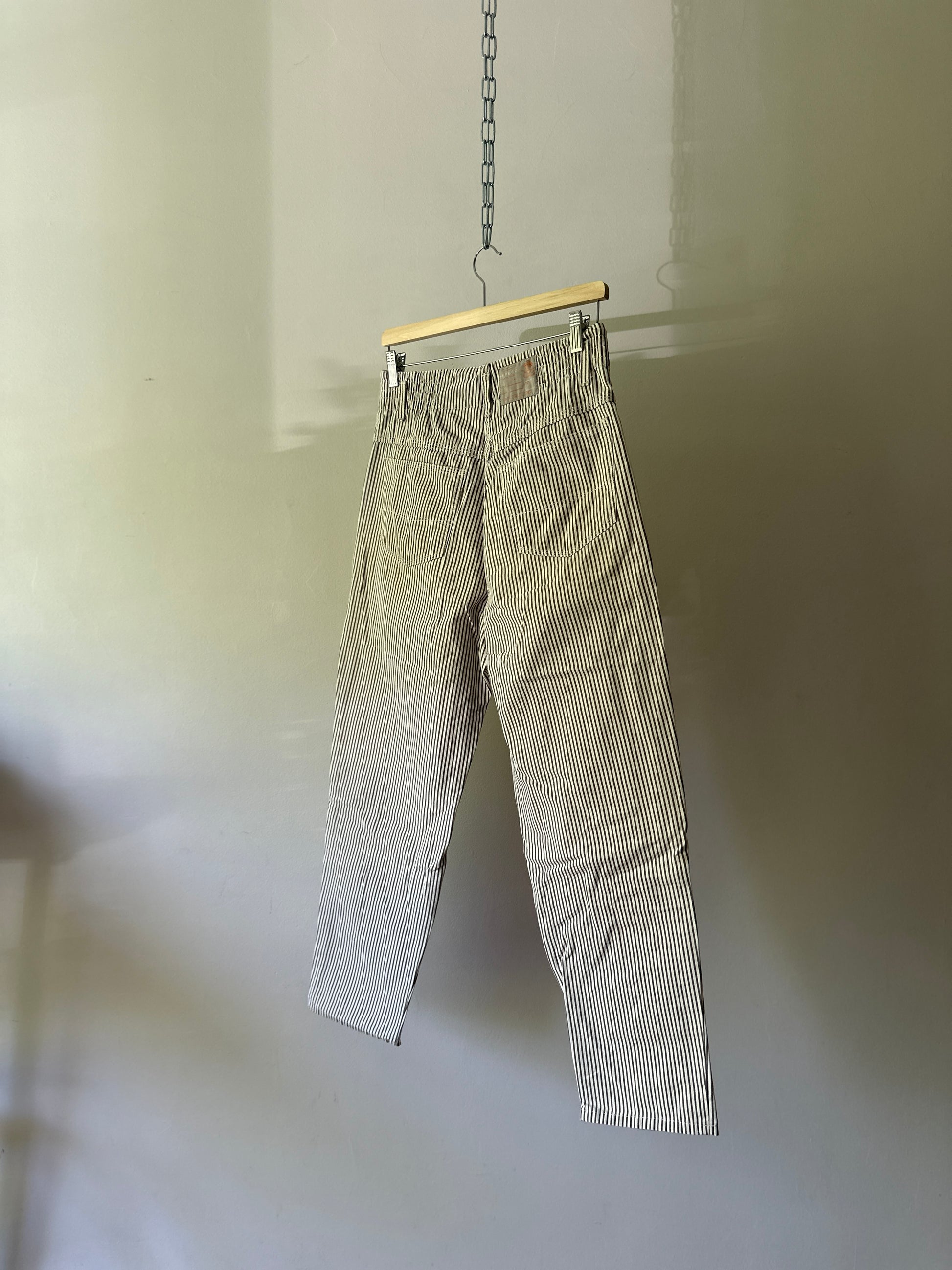 description. fantastic vintage gaucho shaped jeans, black and white pin stripe however faded with wear so stripes the black stripes are more deep grey. the waist is scrunched elastic however worn so there is no stretch