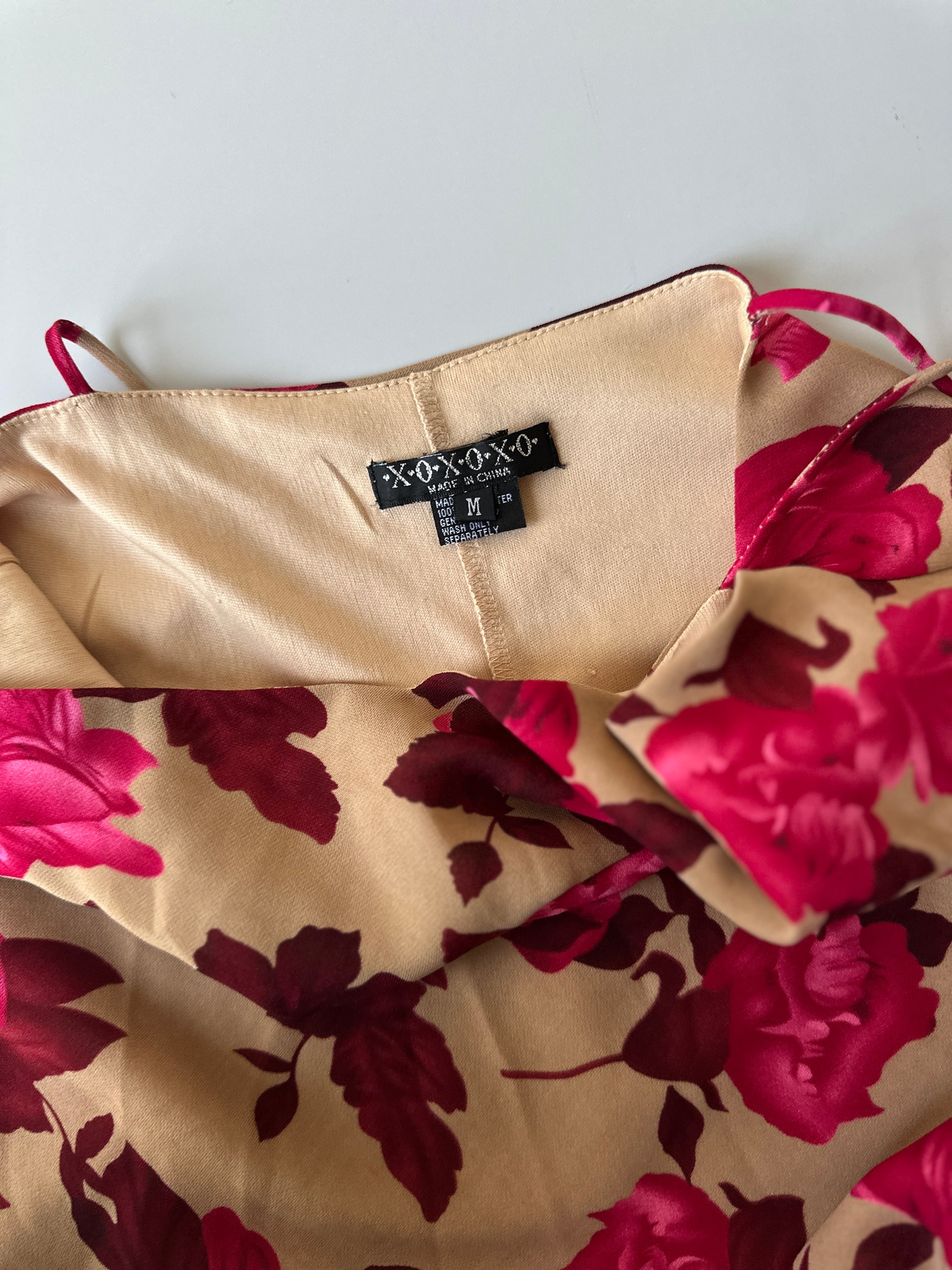 description. the CUTEST floral dress. with a being background and vibrant pink and maroon rose pattern over the entire dress, this is perfect for any event.