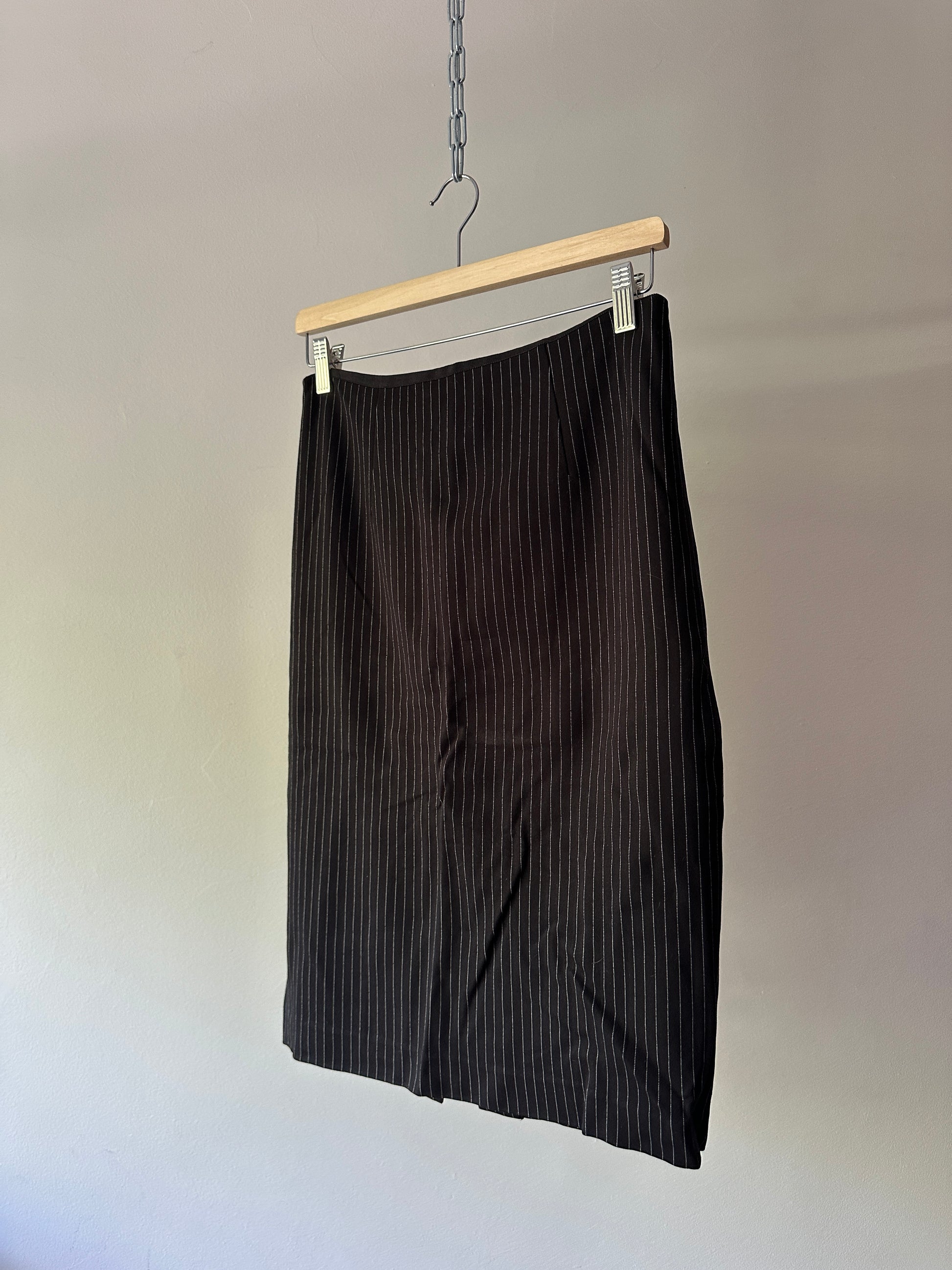 description. a great black and white pinstriped pencil skirt, with a slit stretch to the fabric. perfect for your office/corporate closet aesthetic