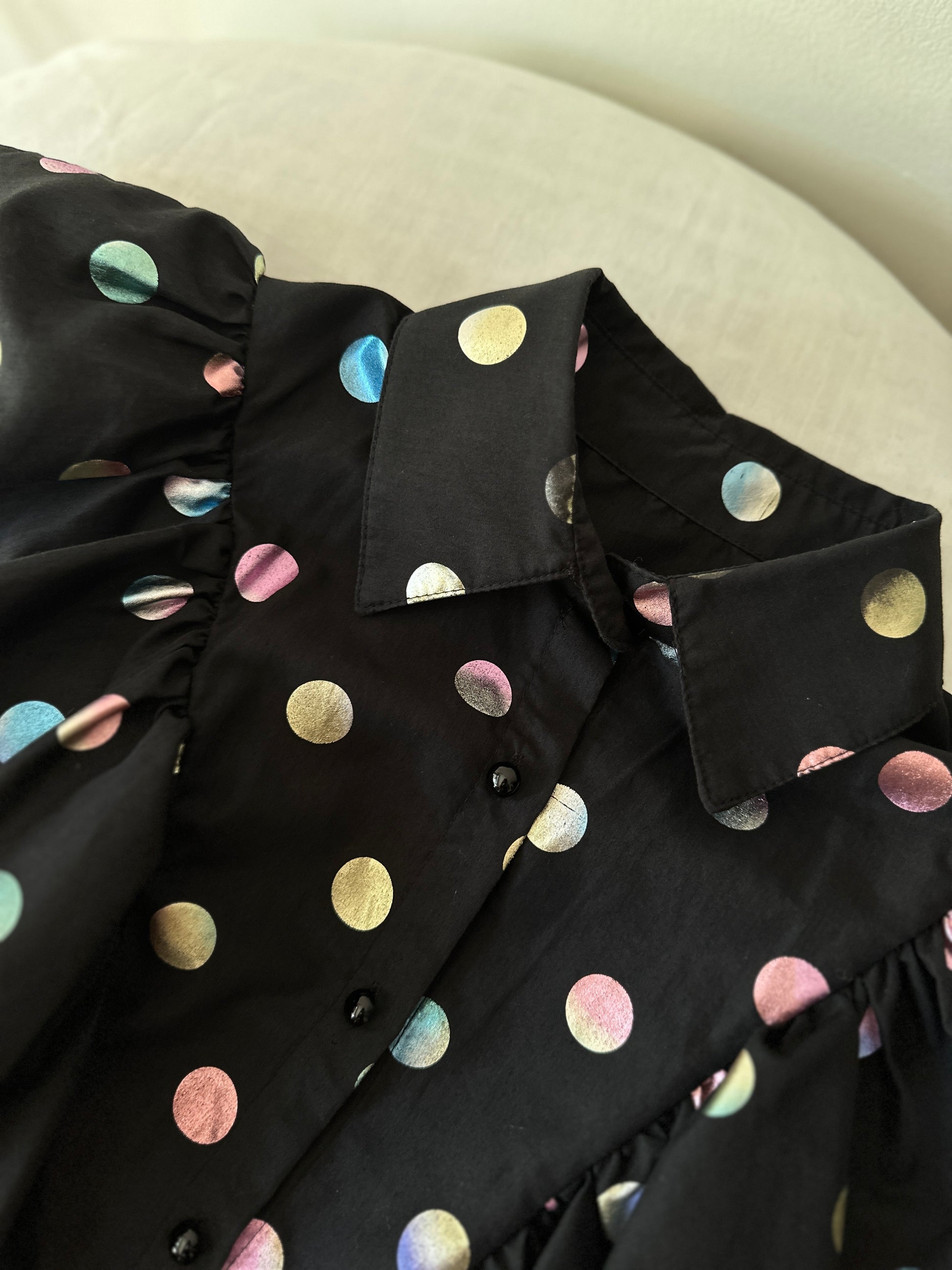 description. one of a kind short sleeve blouse, with THE most fantastic ruffle sleeve details and iridescent polka dots over the entire shirt. you can wear this piece buttoned all the way to the collar, OR wear it as a vest over a funky band shirt- whatever your style or hear desires. this is a great addition to your working closet