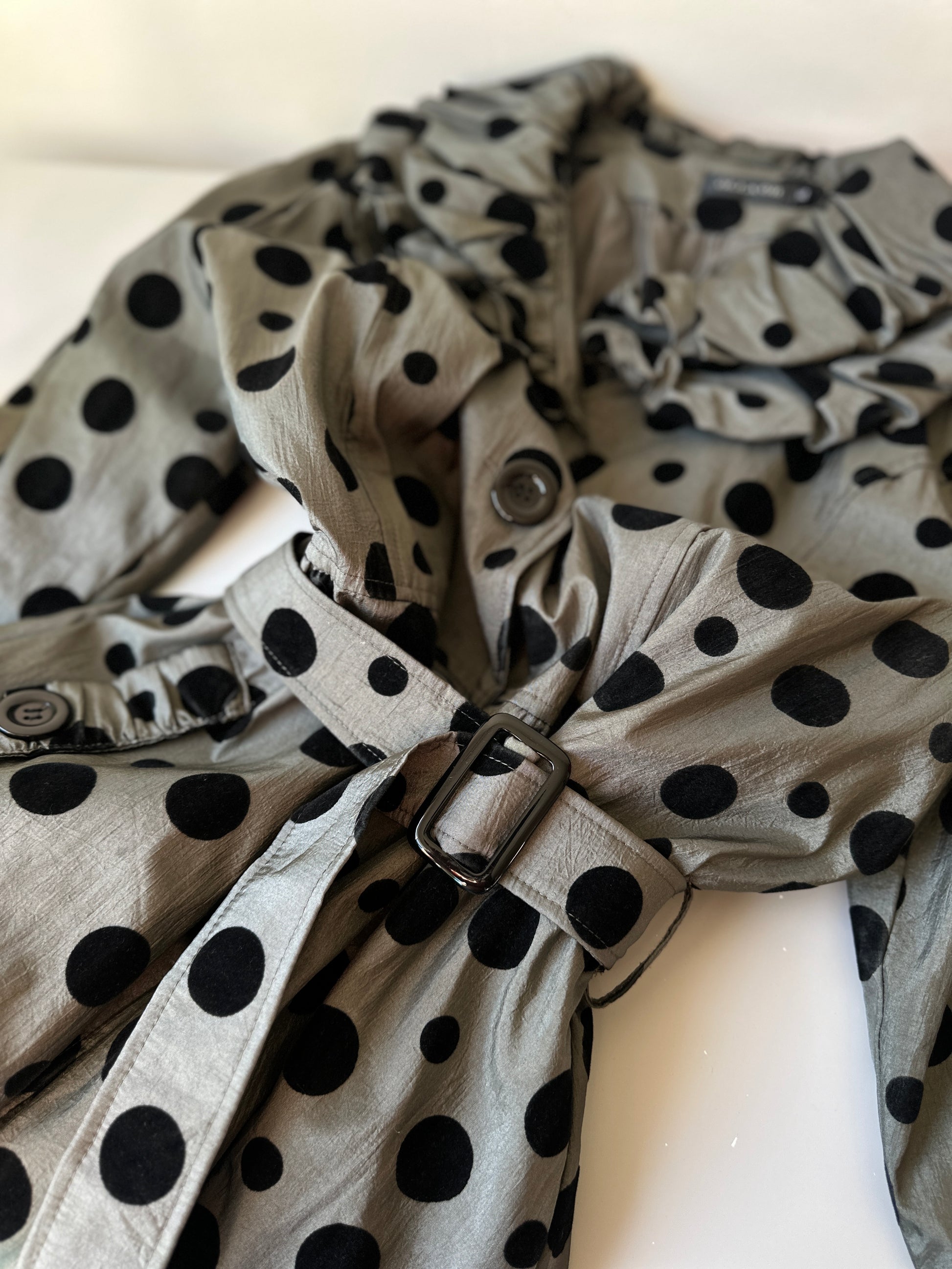 description. I love love love this piece, it's from my personal closet however I never wear it so we need to find it another home. the double collar is ruffled, plus a little ruffle on the pocket, the hem has a puff to it so it flares out while on, AND all of the polka dots are velvet while the grey material has a slight opaque to it. finishing it off with super large black buttons and a buckle waist tie, this is THE cutest jacket or dress!.