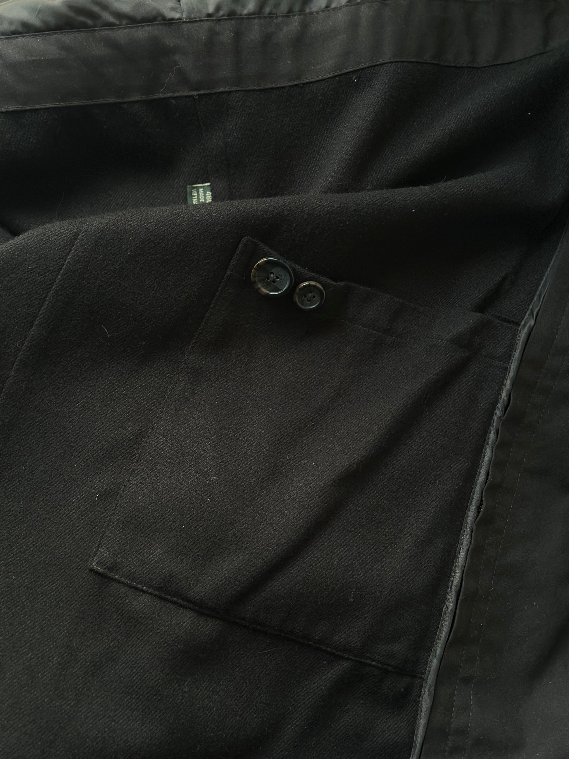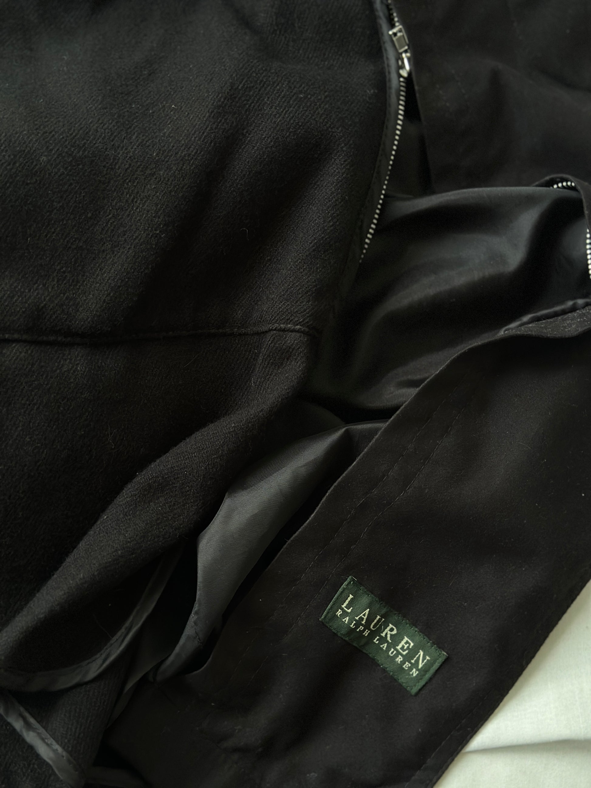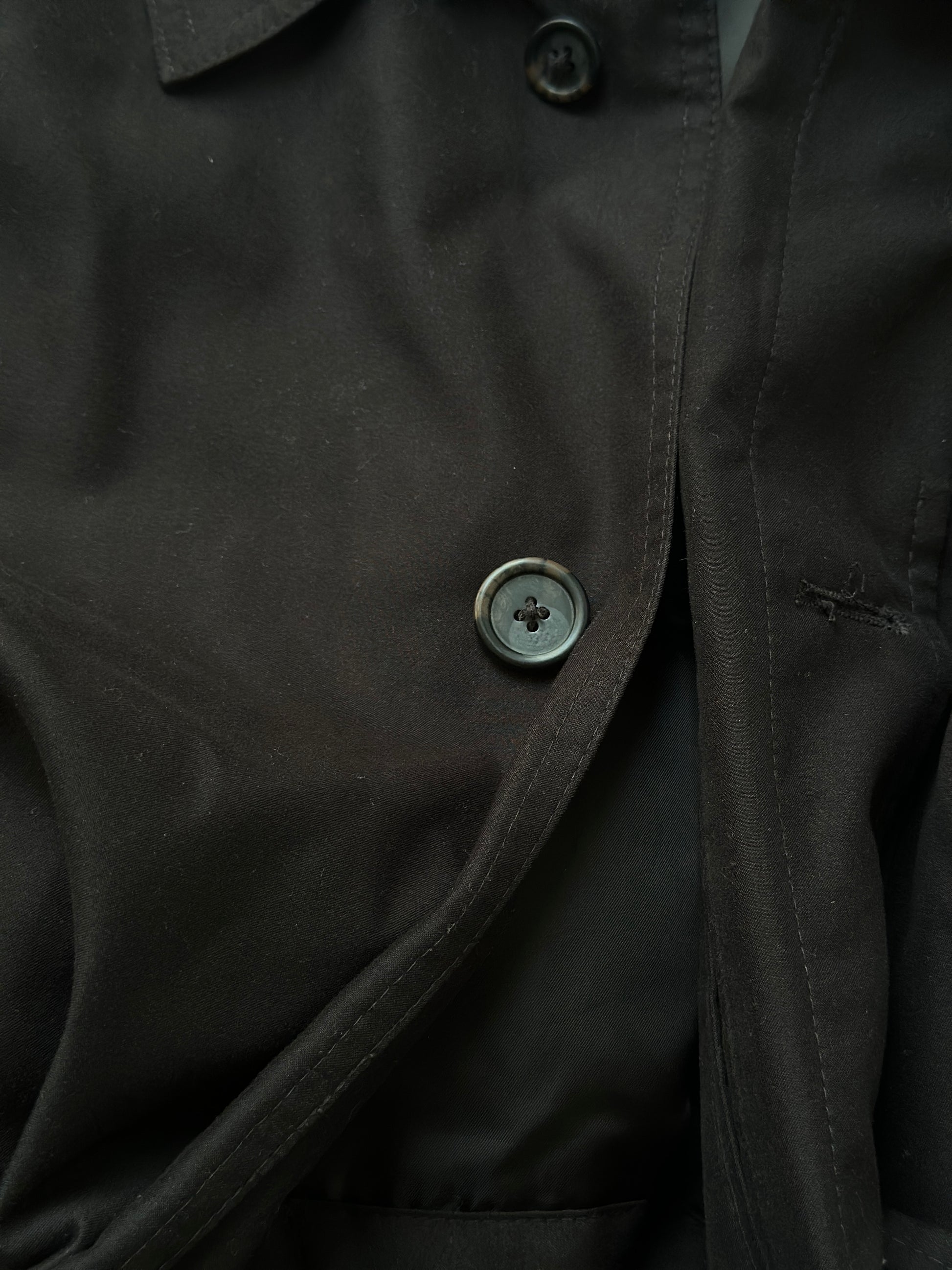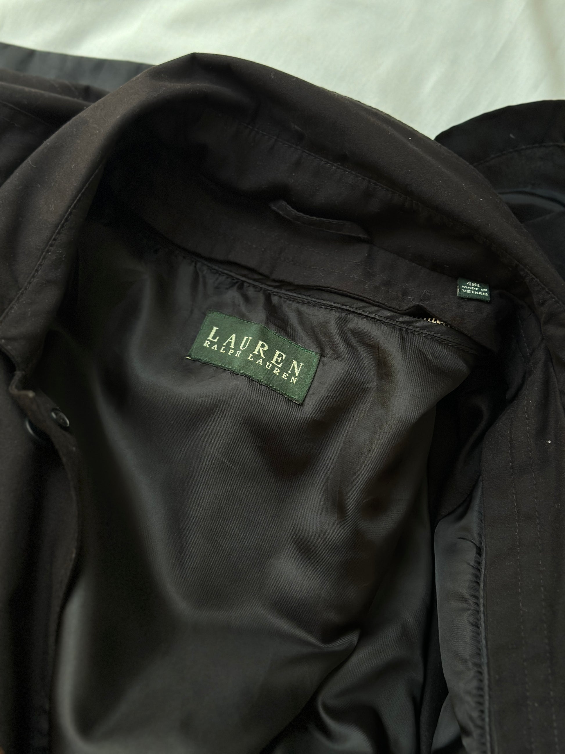 description. this Ralph Lauren tench coat has the most beautiful silhouette, it fans outwards as it nears the bottom. there is an additional removable liner inside the jacket for the colder climates, there is a missing waist tie, and some replaced buttons, however the coat overall in fantastic condition
