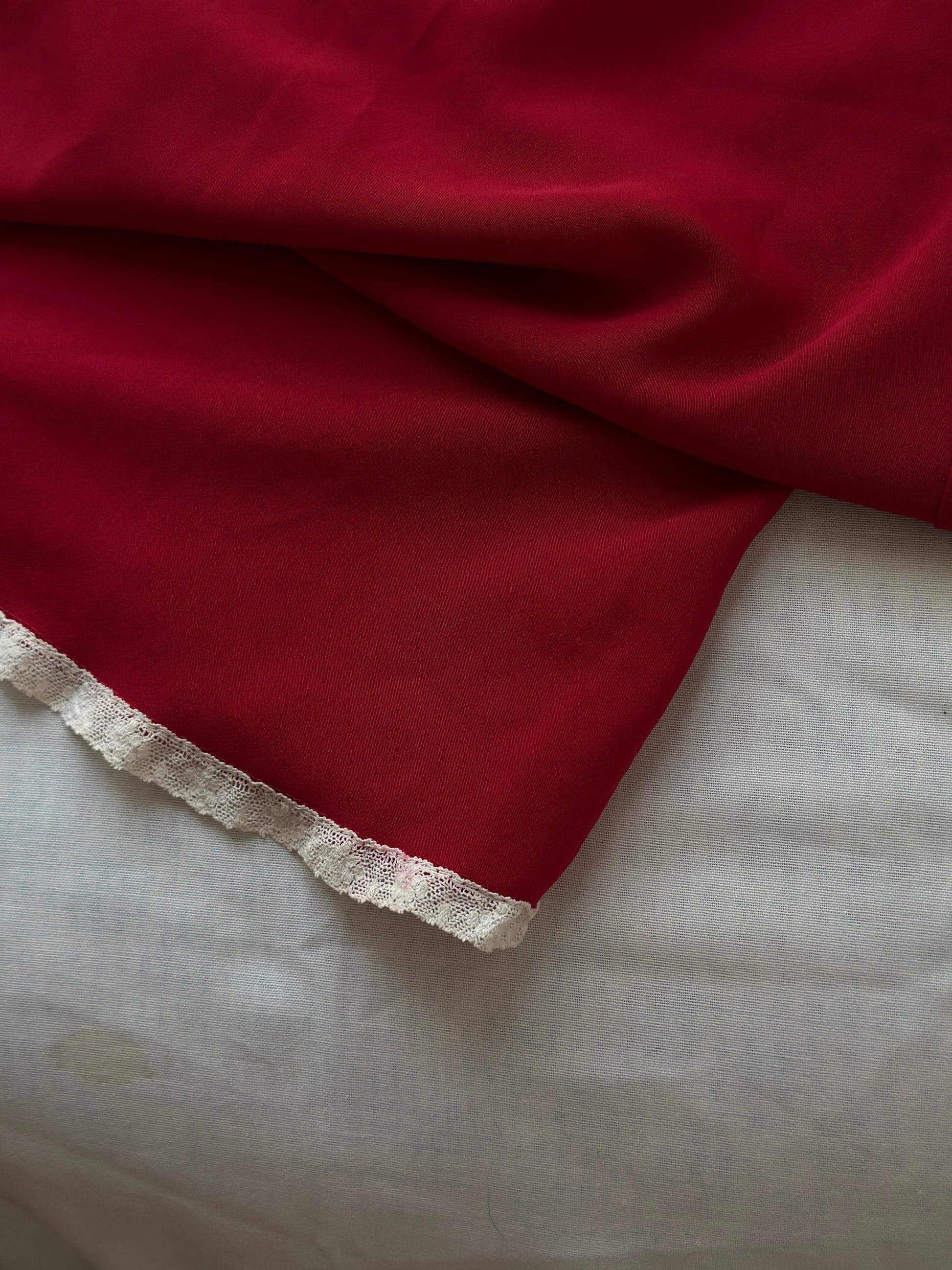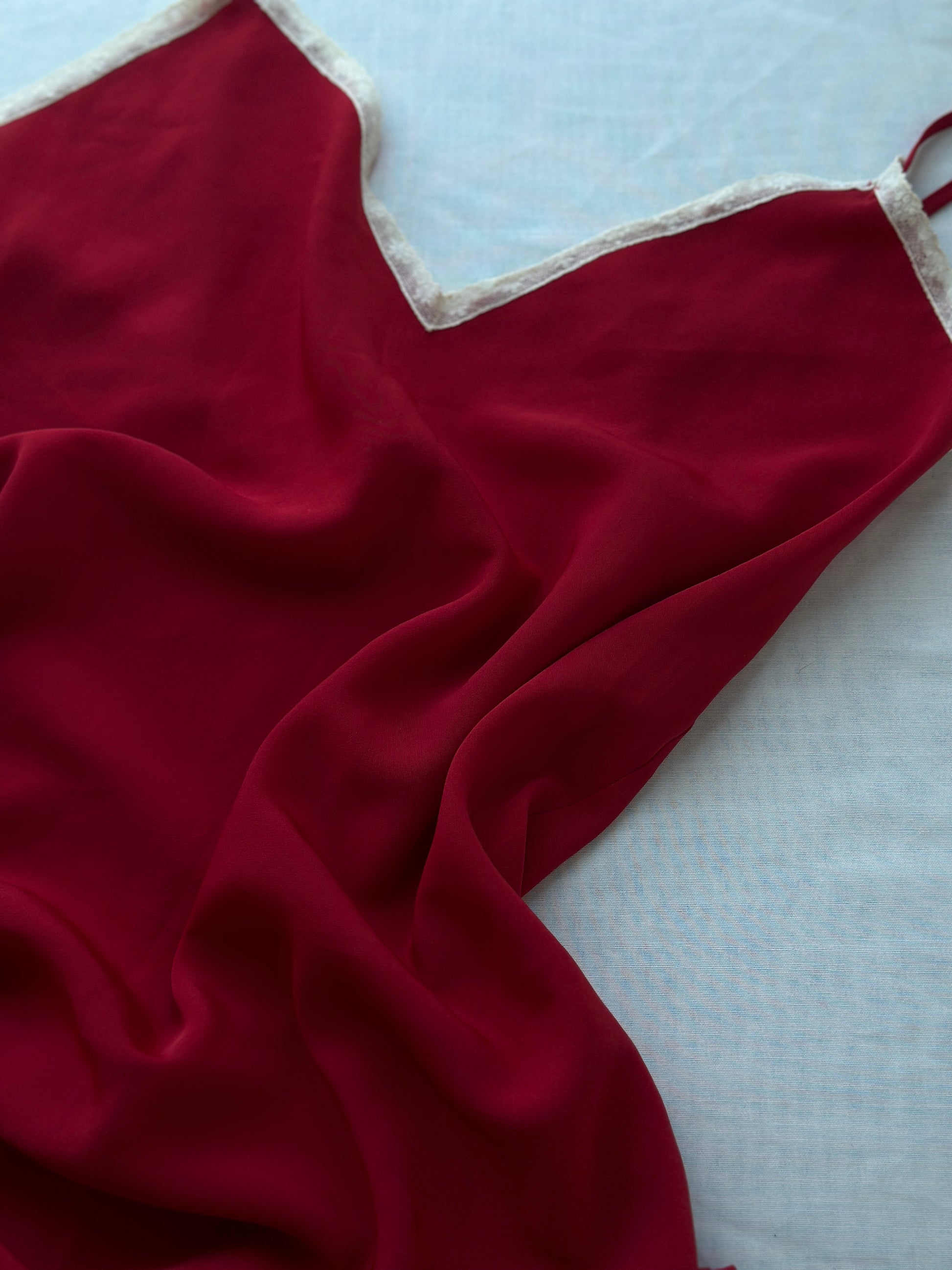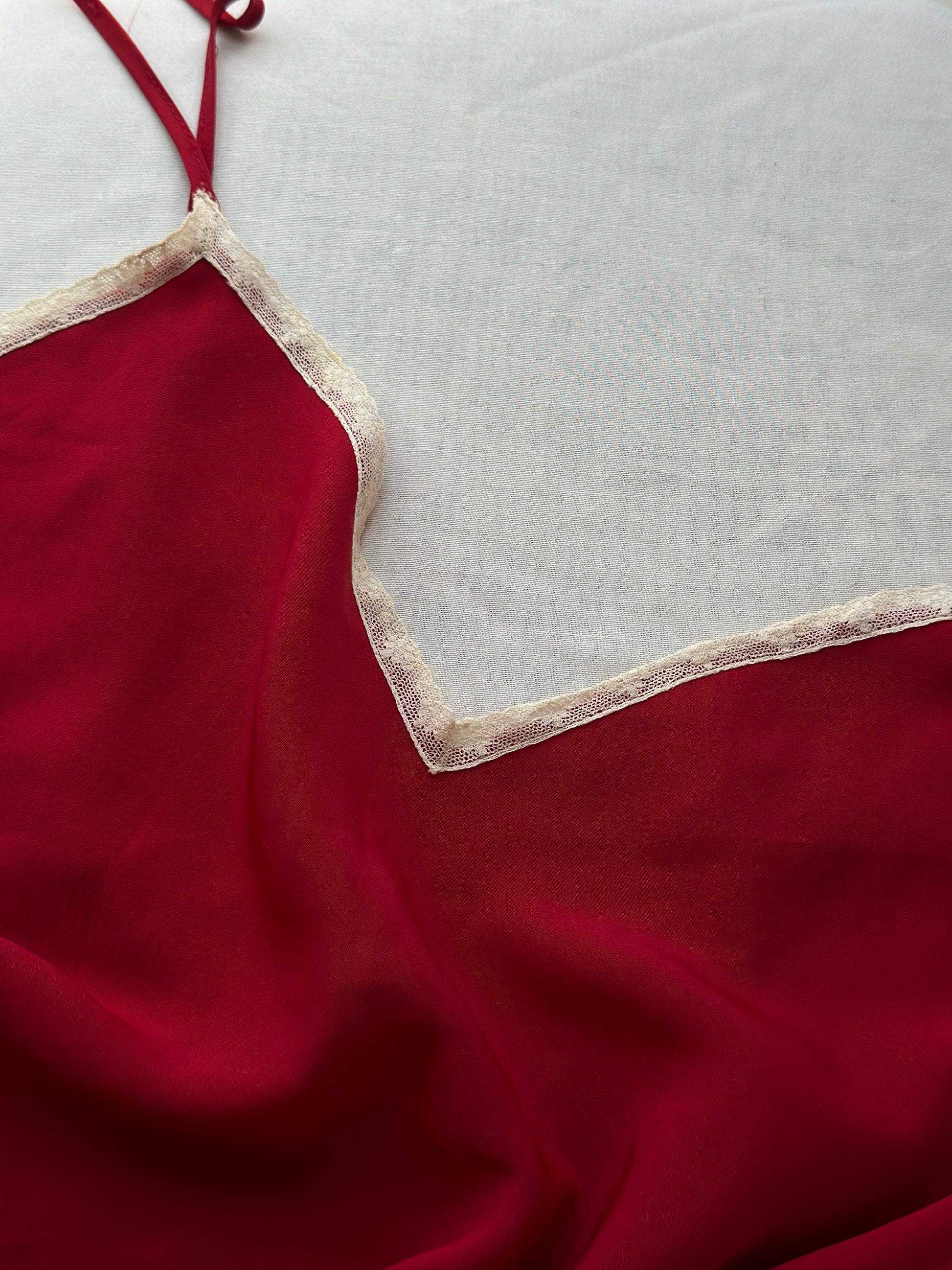 description. a stunning deep red Calin Klein night slip that is cut on a bias and will flow so delicately on your body. the white lace details keep it just a little simple, but the back dips into a low v and accentuates the spine, adding a simple element of sexiness