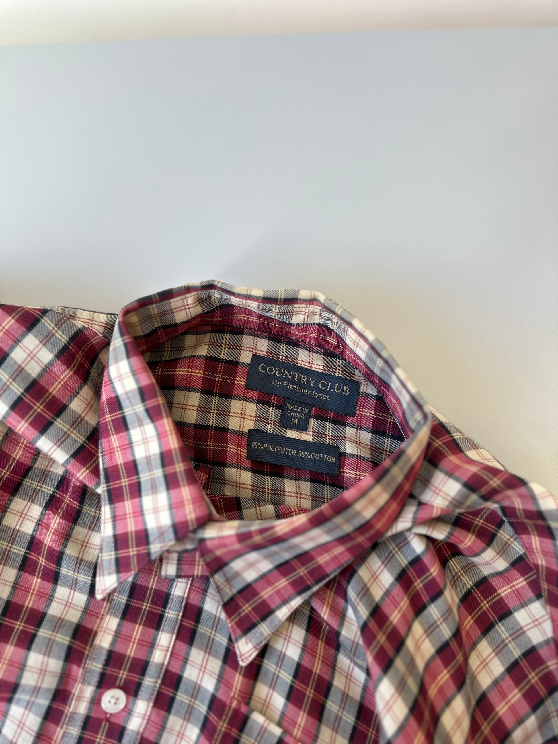 description. a fantastic red, cream and yellow crosshatch pattern, classic cotton country button up style