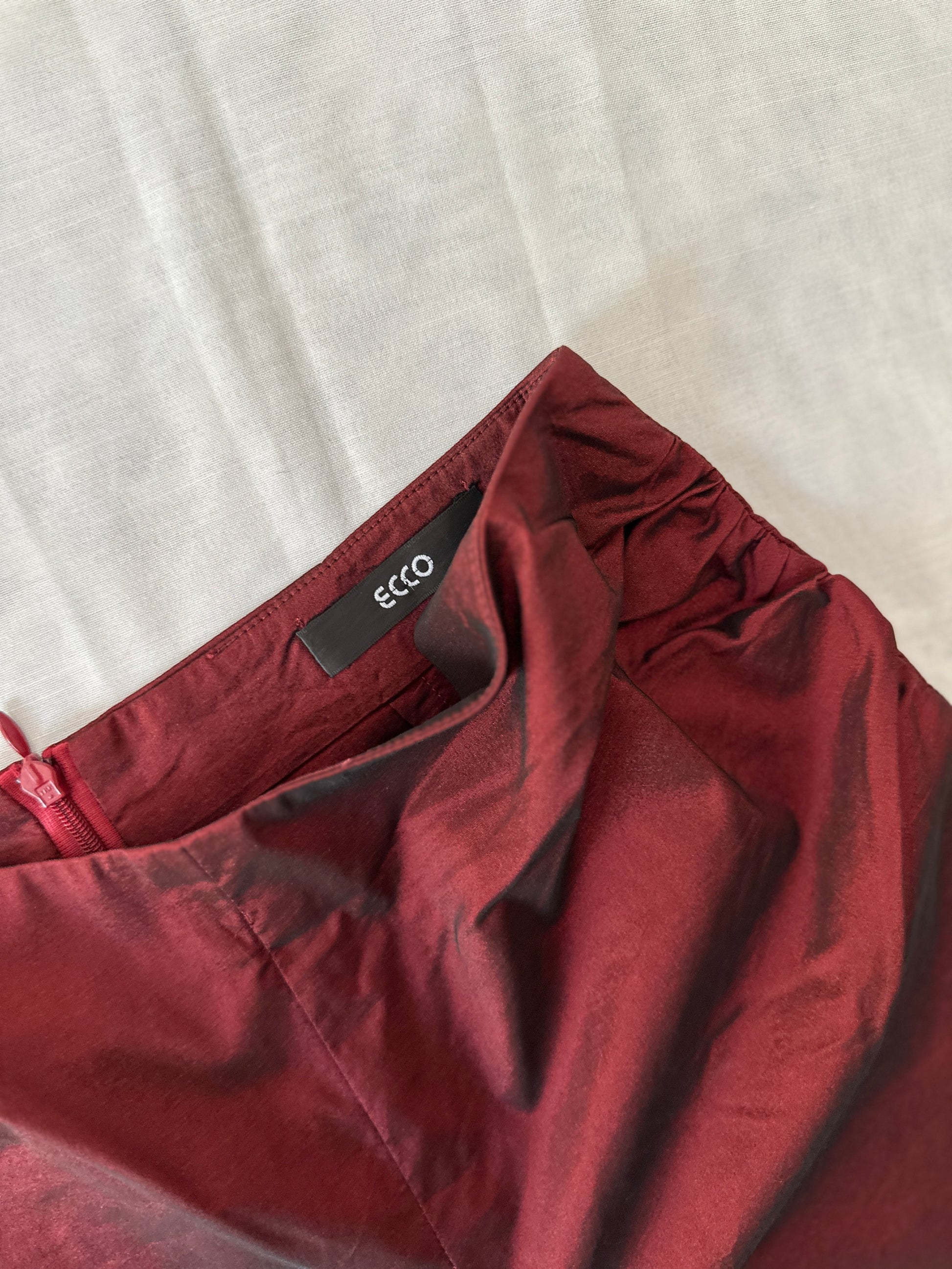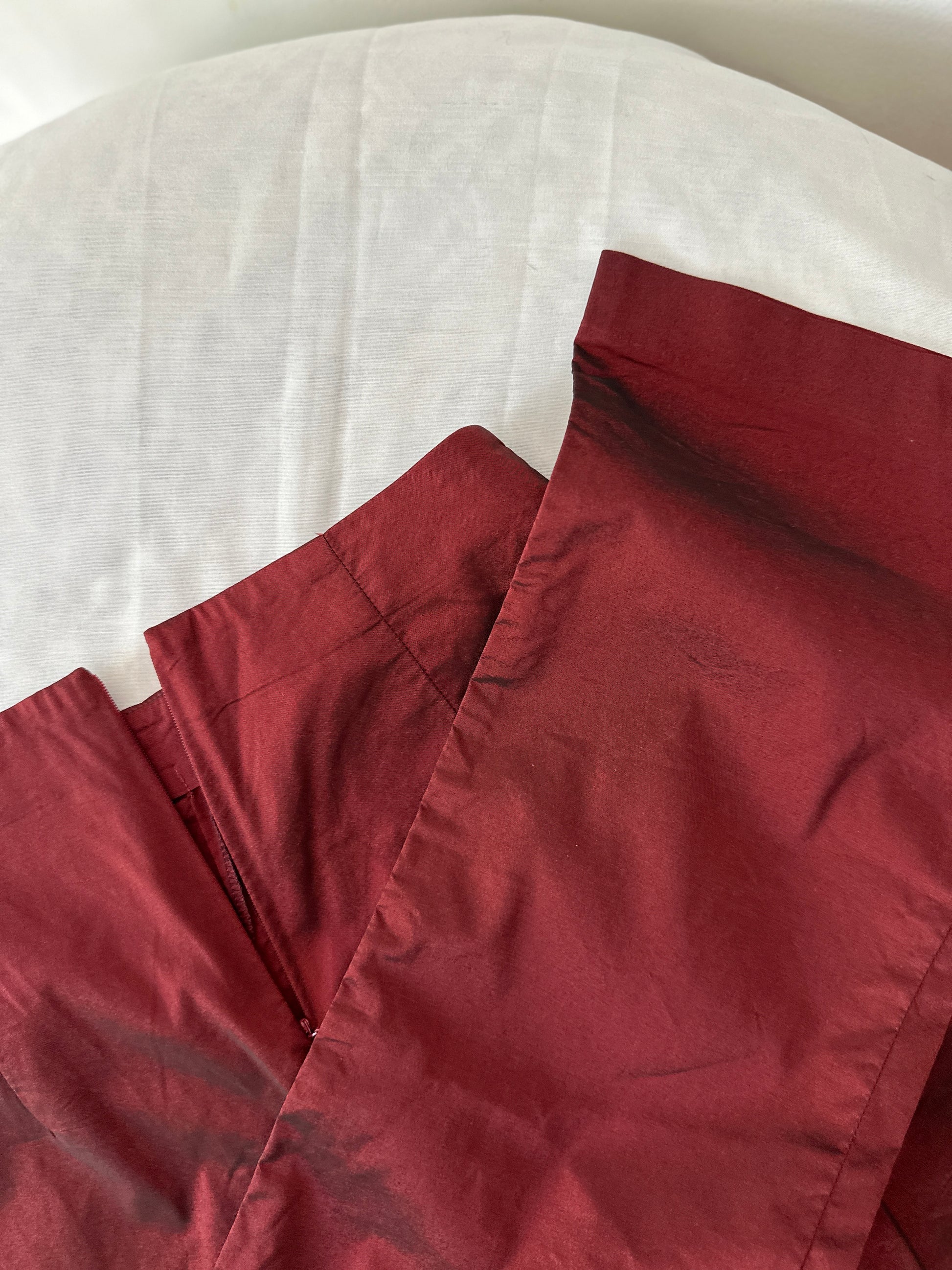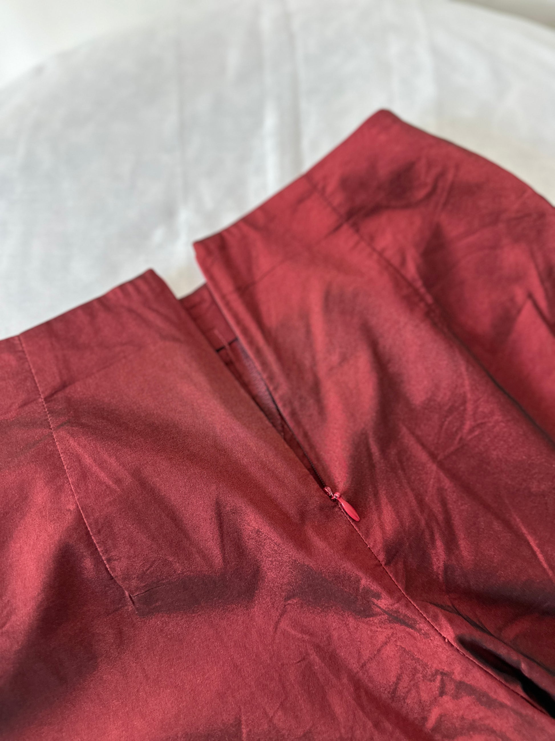 description. a stunning red opaque pair of high waisted dress pants. there is a slight flare to the shape, and touching on the sides where the hips sit. the zipper on the back allows for the front of the pant to accentuate the shape of the wearers body- there is matching jacket that goes perfectly with these pants in the jacket collection