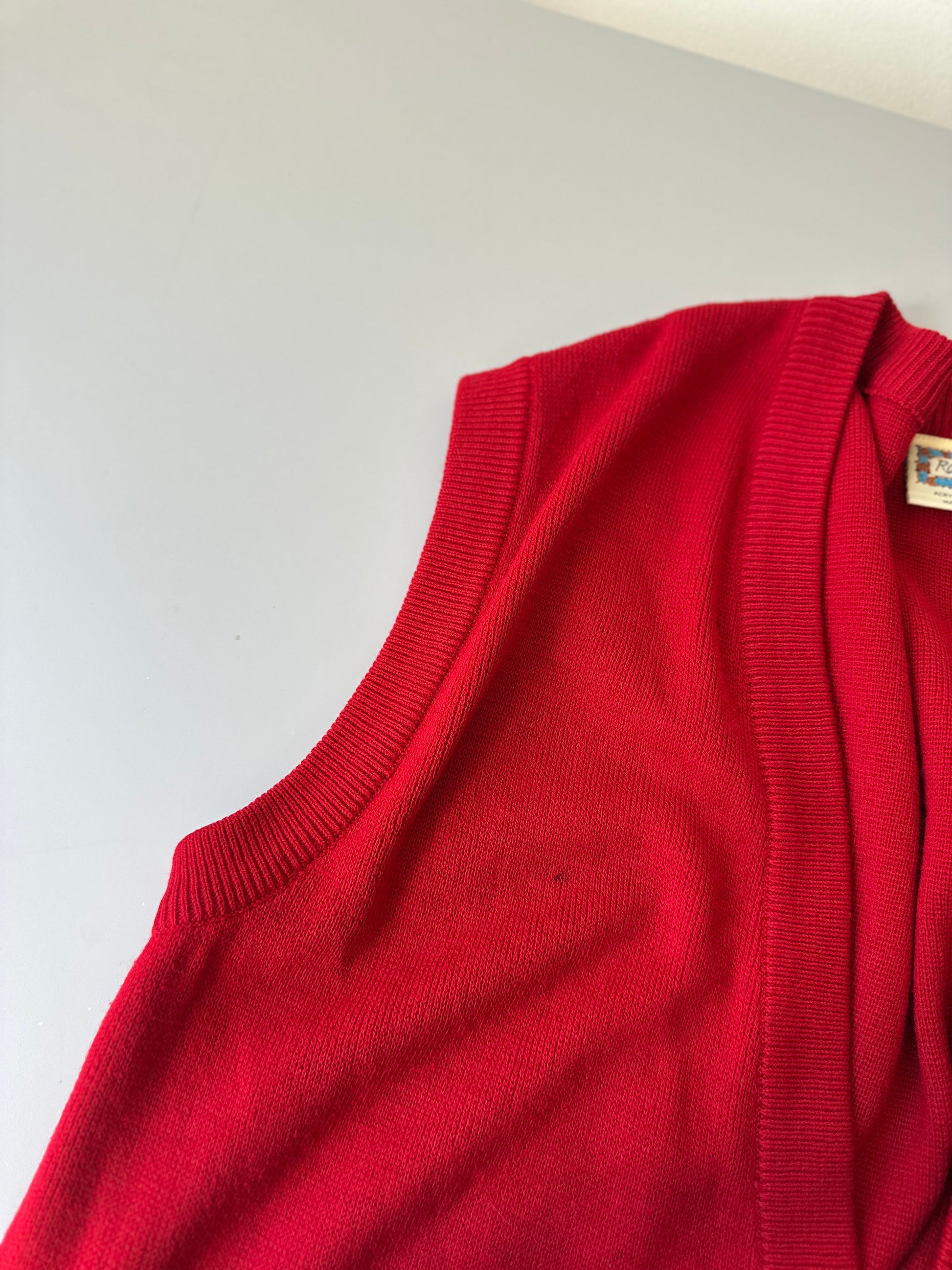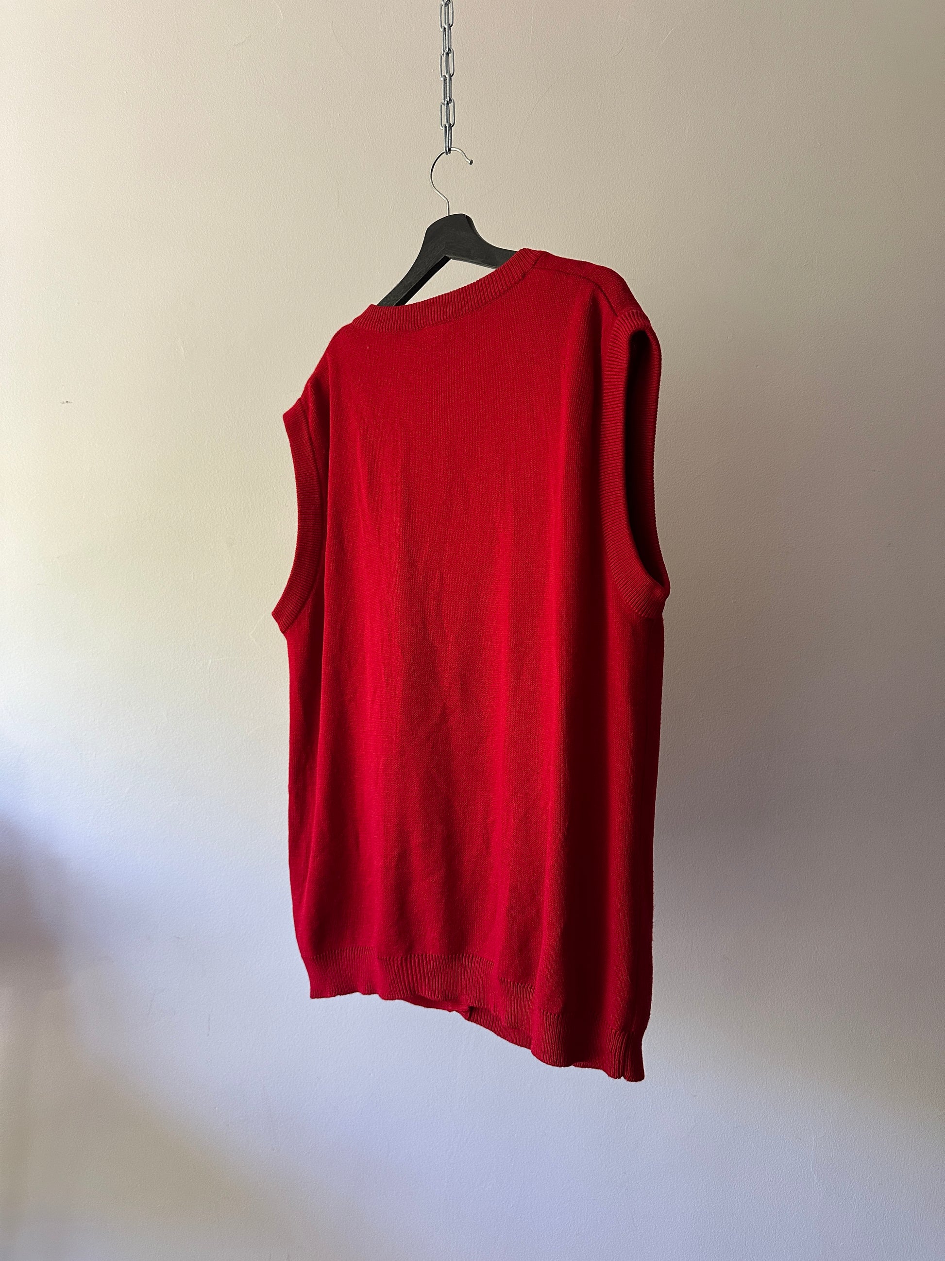description. a beautiful vibrant red woollen style button up vest with gold/brass buttons and two front pockets