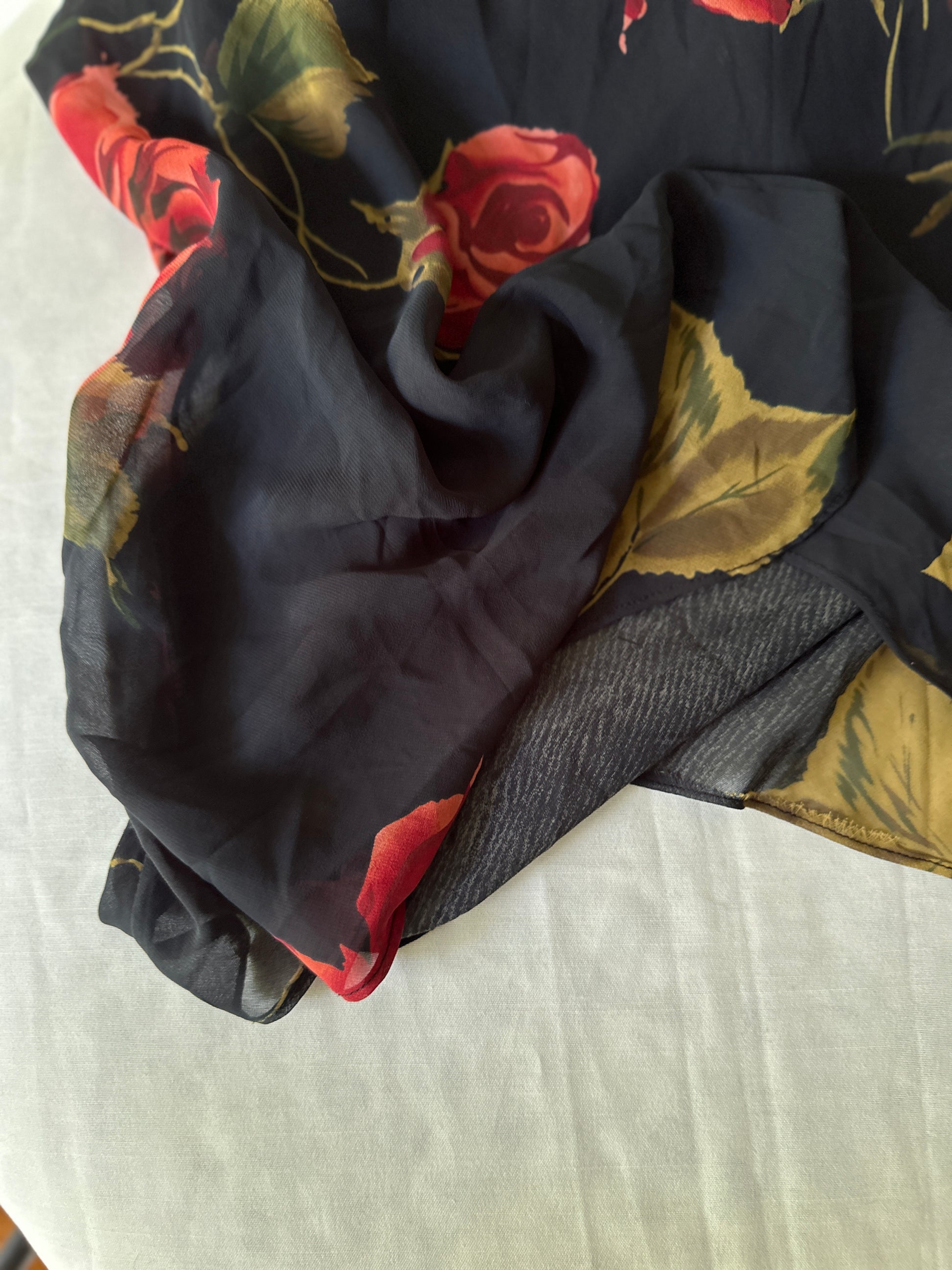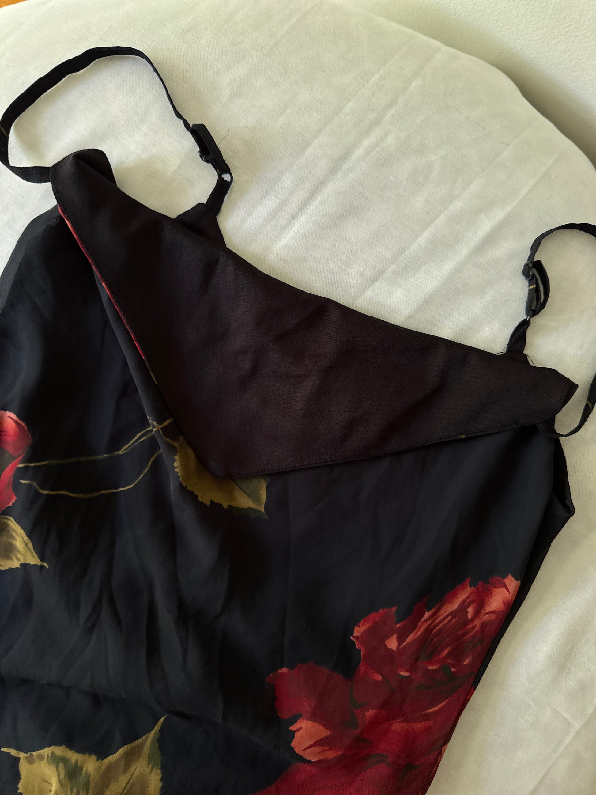 description. this is legit my FAVOURITE dress I have ever found. it is stunning, with a bias cut it fits the body so perfectly. the rose pattern is so subtle, and the cowl neck just makes it such a beautiful piece for anyone who needs a cocktail dress for any occasion