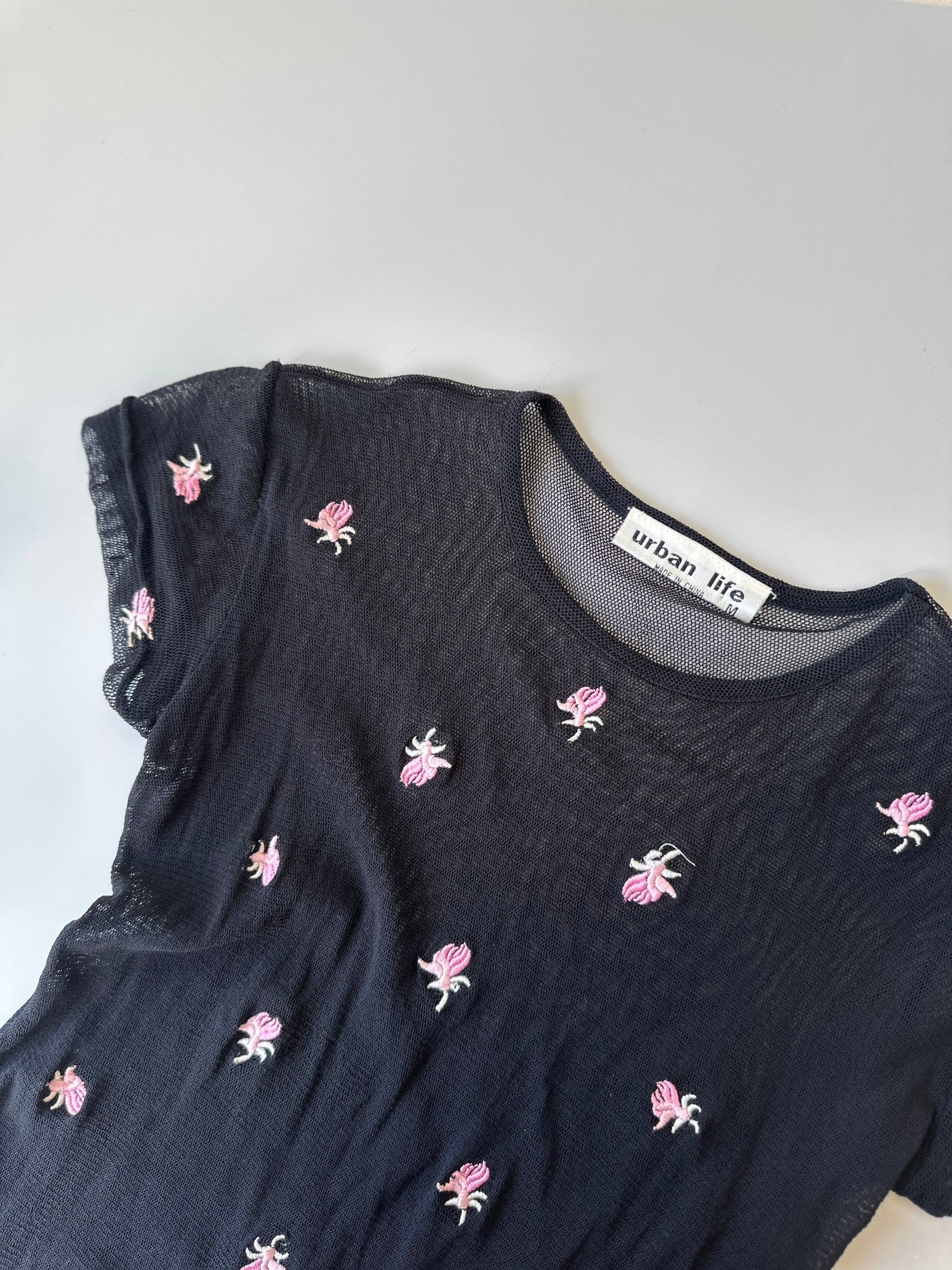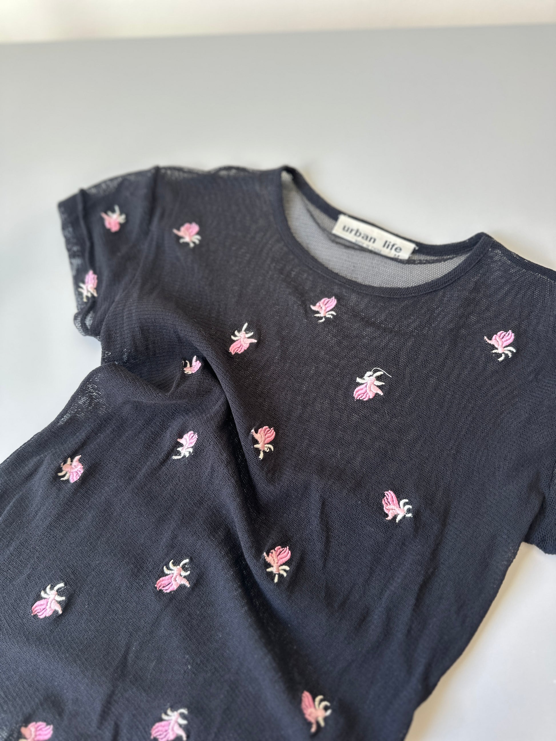 description. a cute babydoll tee, sheer material, suuuuuper stretchy, with pink flowers all over the front of the tee.