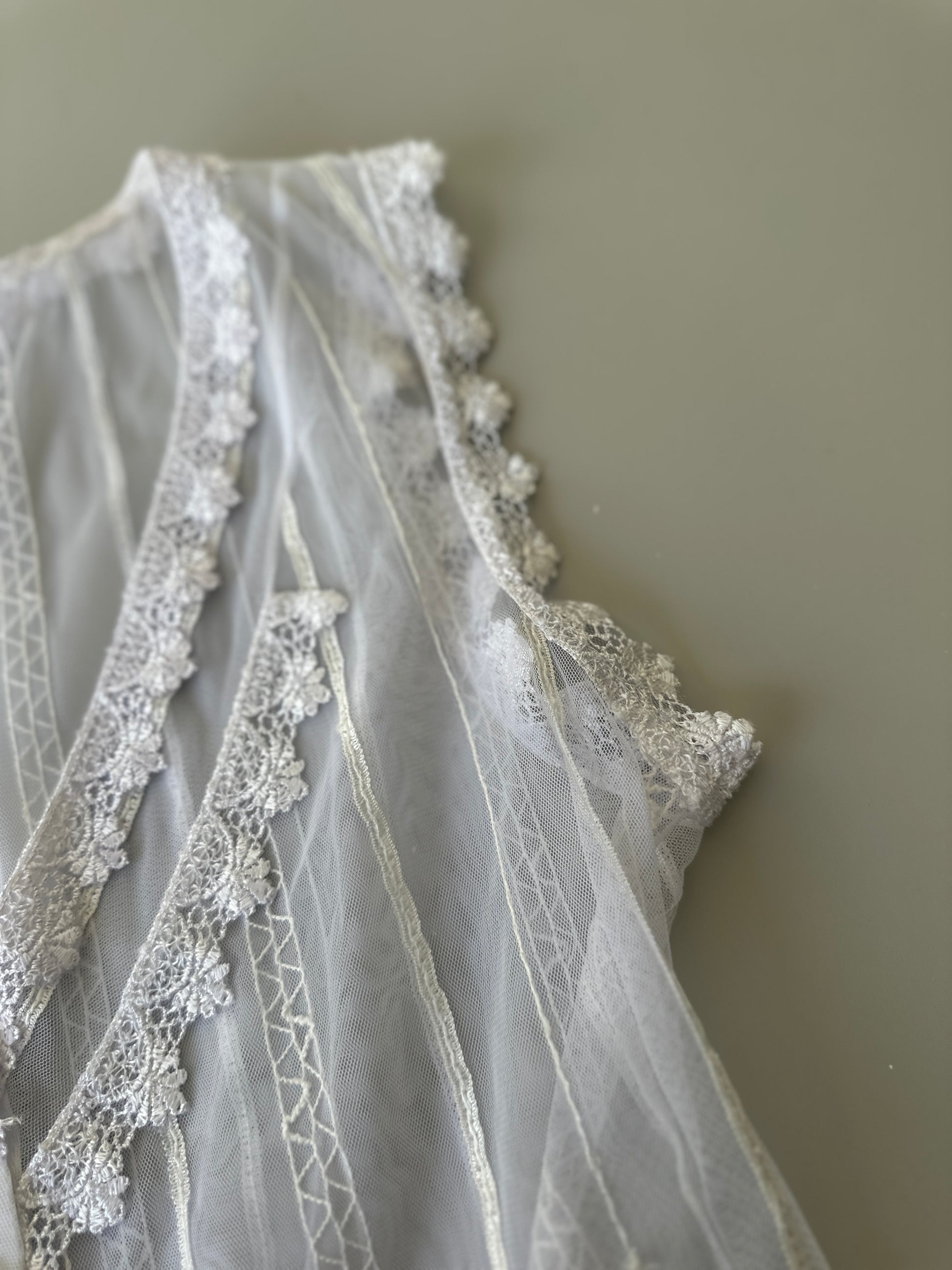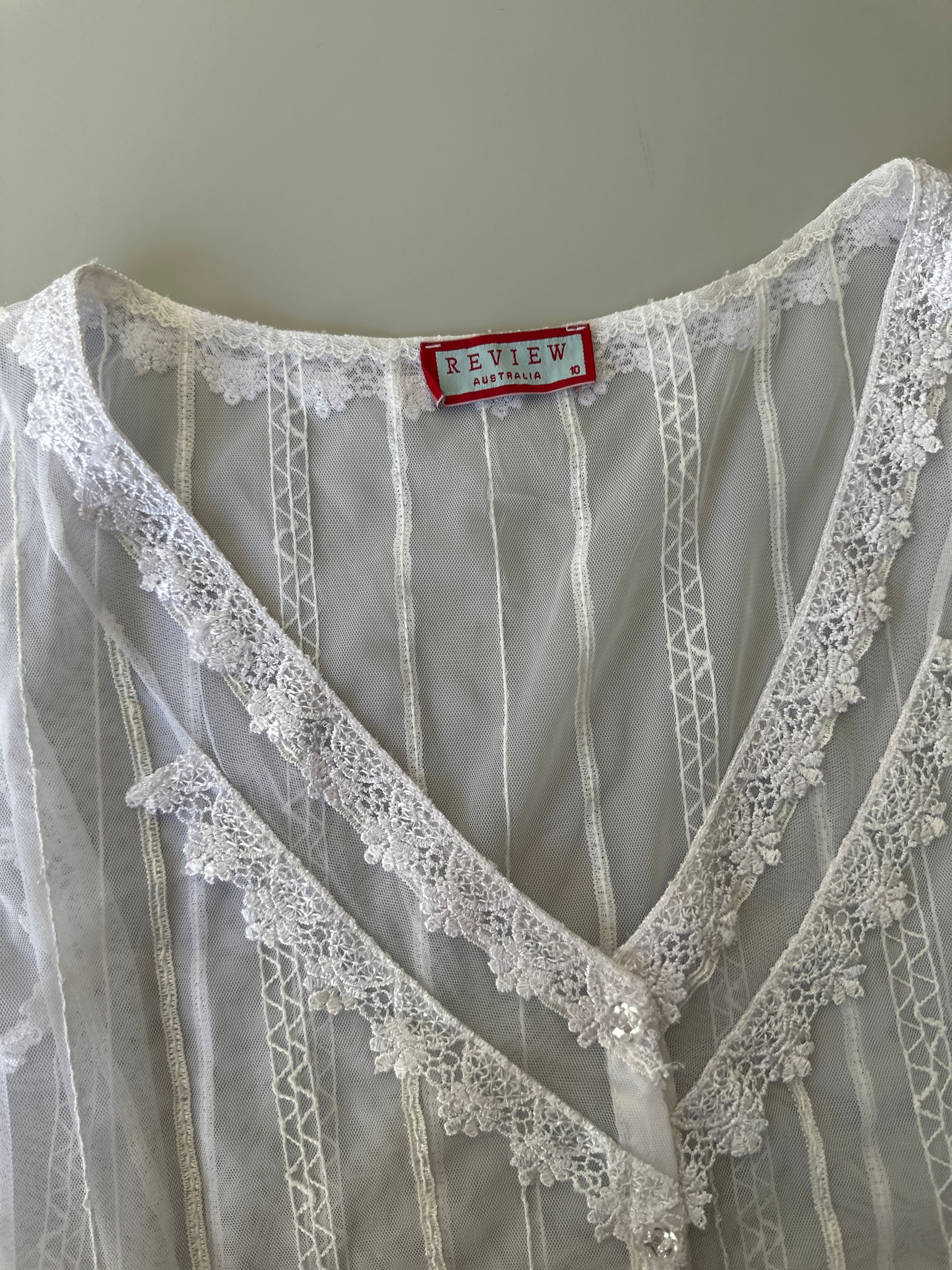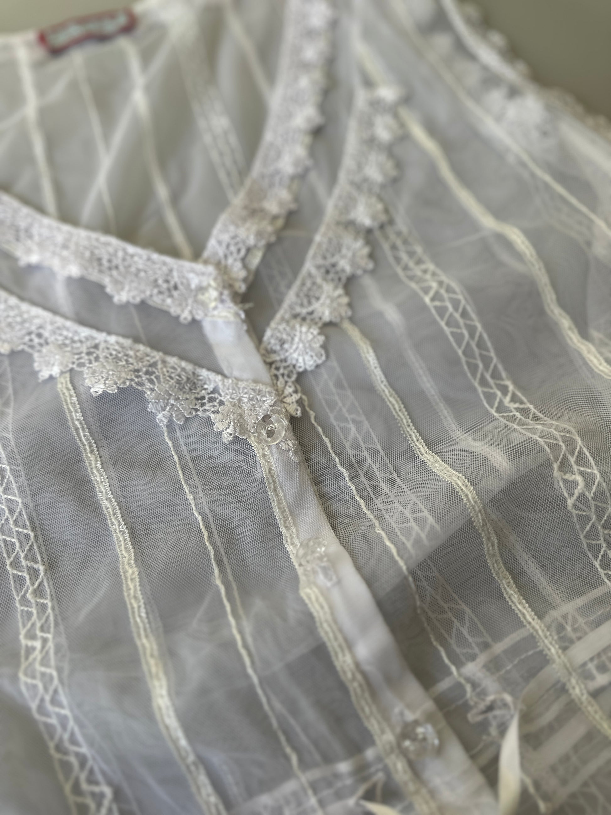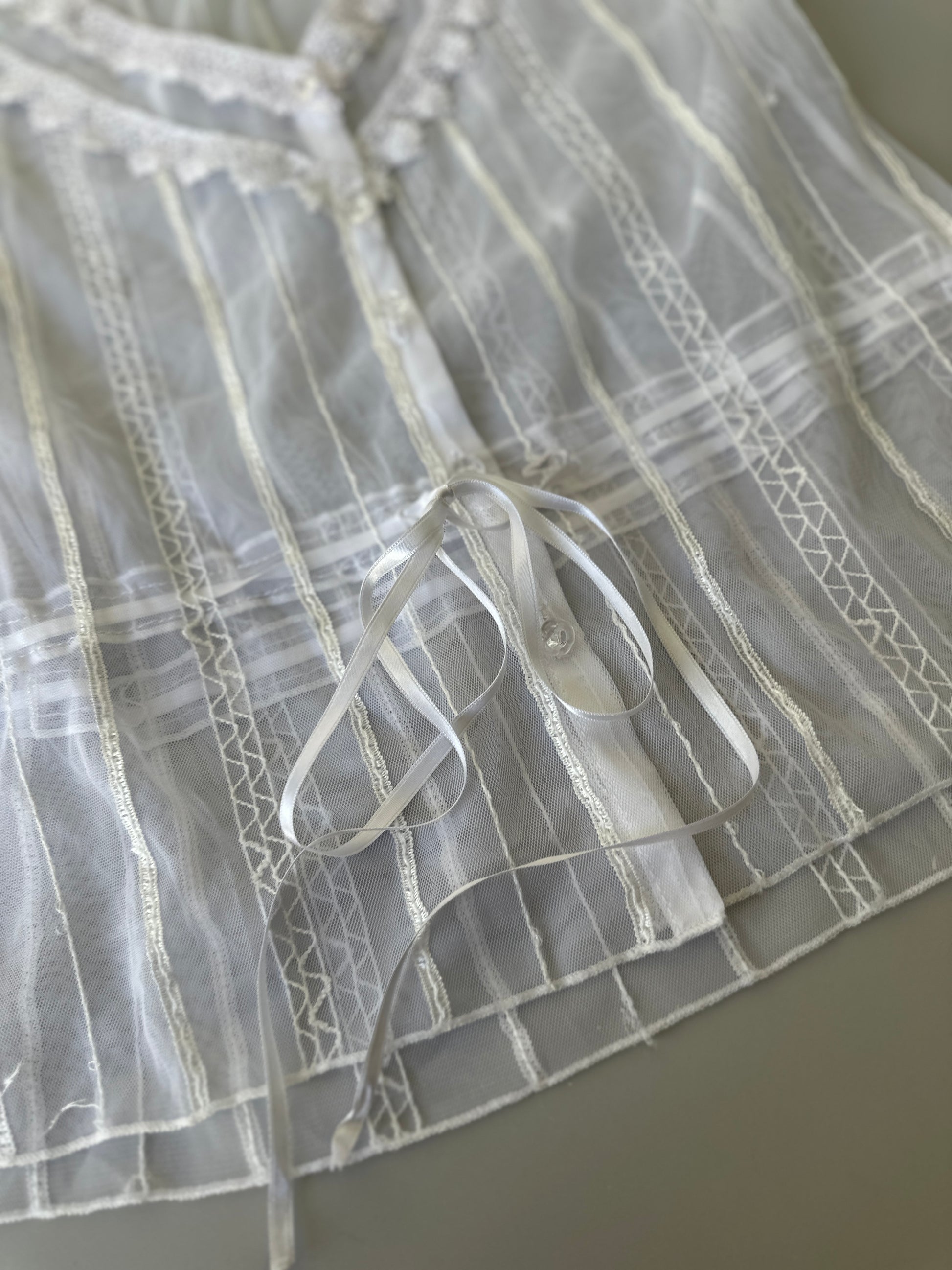 description. the sweetest sheer white blouse with lace detailing over the entire piece, as well as clear sequins that add some sparkle in the light. there is a ribbon drawstring around the waist to tighten the blouse and wear it multiple ways, there is also some stretch to the material