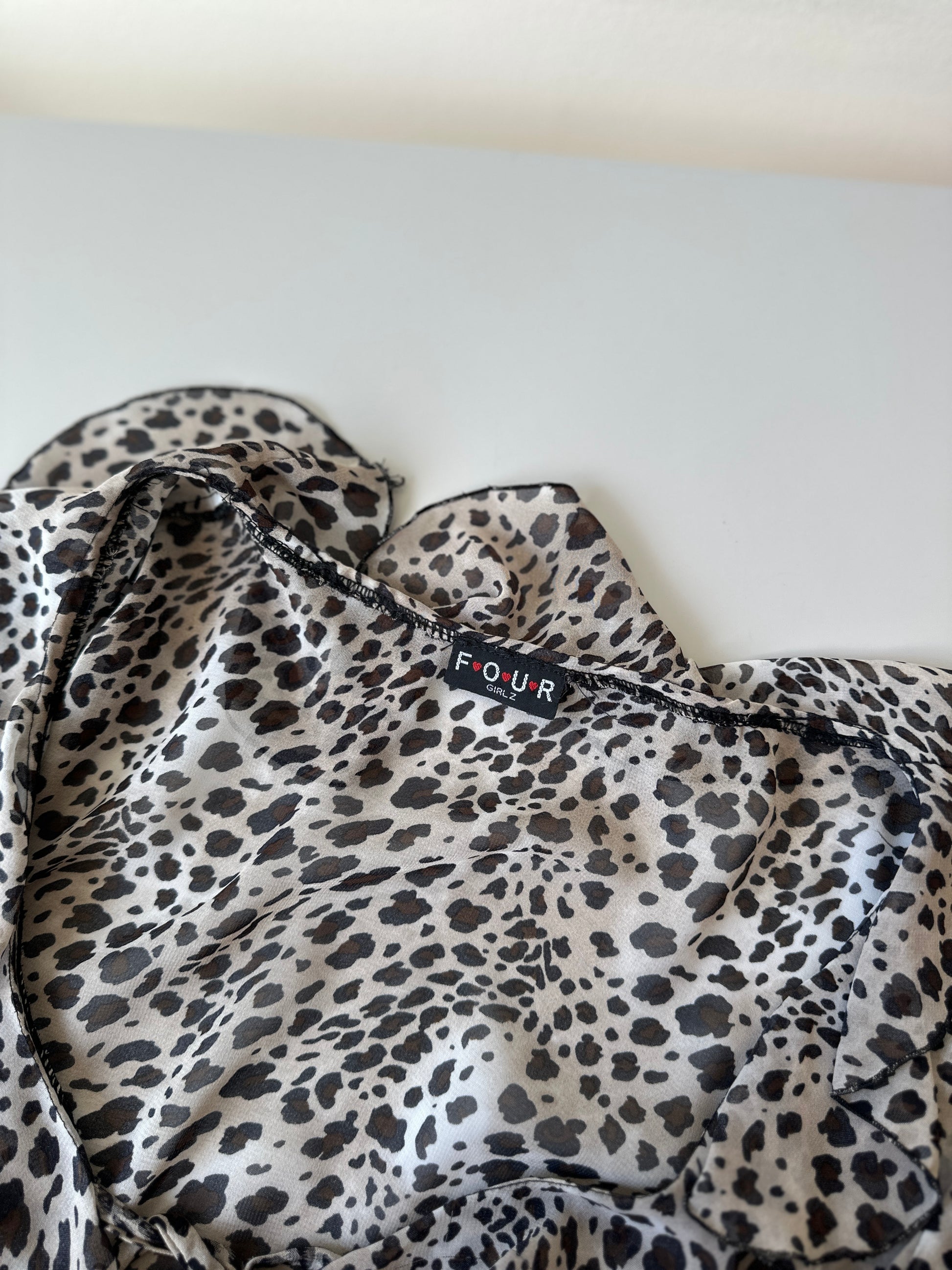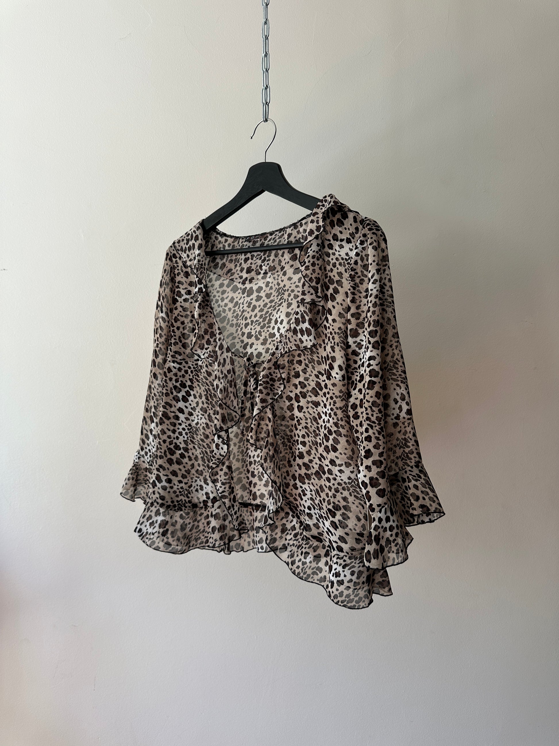 description. a very 90s sheer leopard print top with ruffles around the entire inner hem and mid length sleeves. with a single front tie, this is perfect for your closet