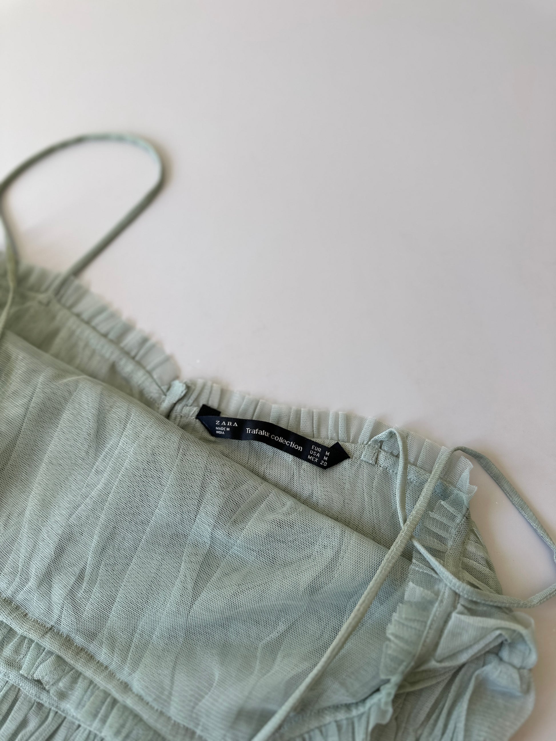 description. the sweetest little spaghetti strap ruffled soft tulle top
