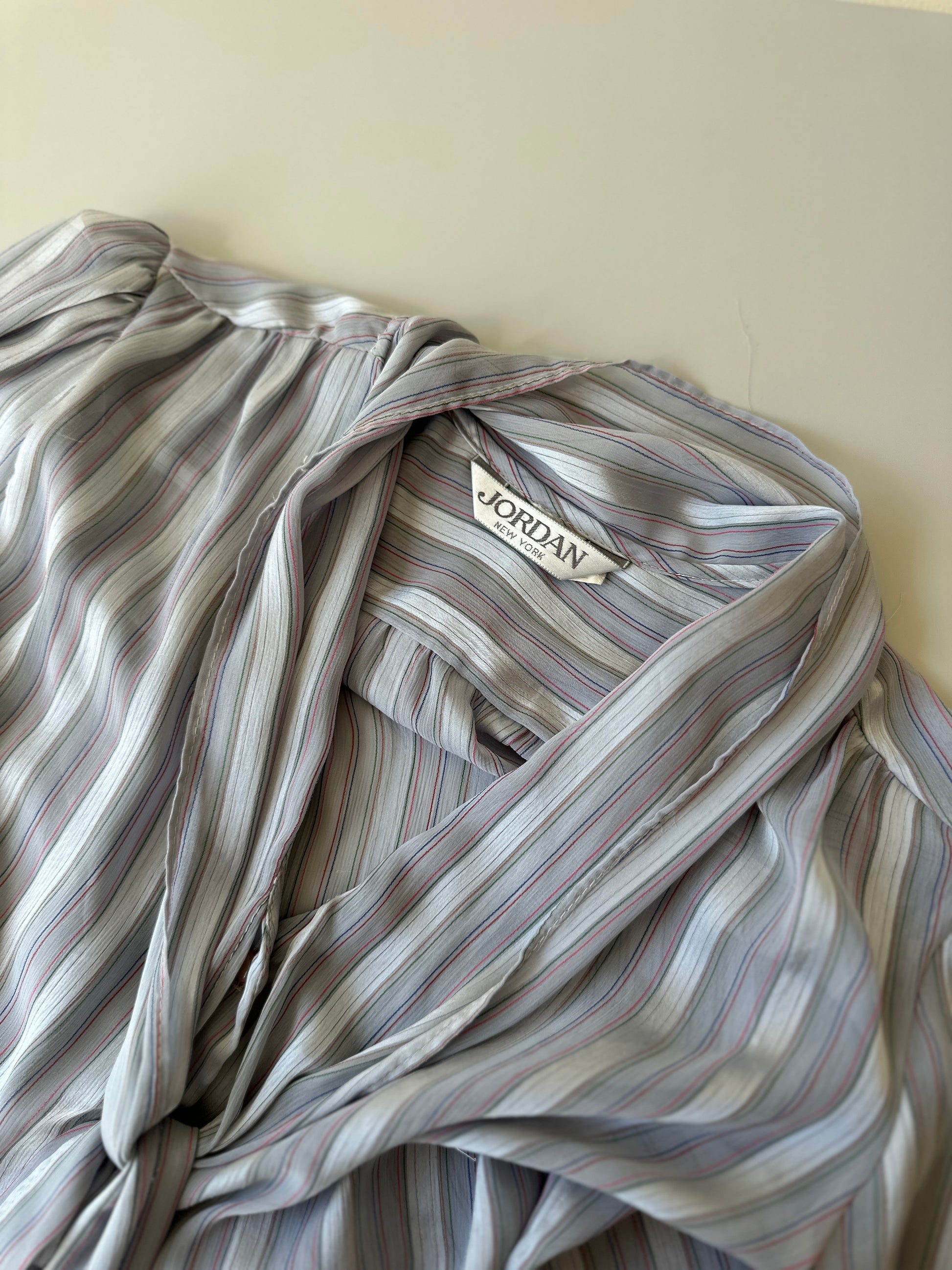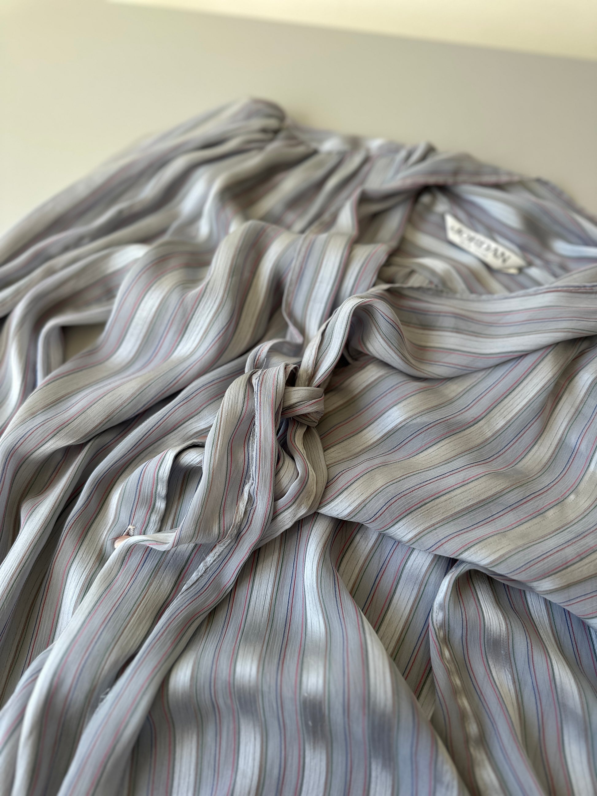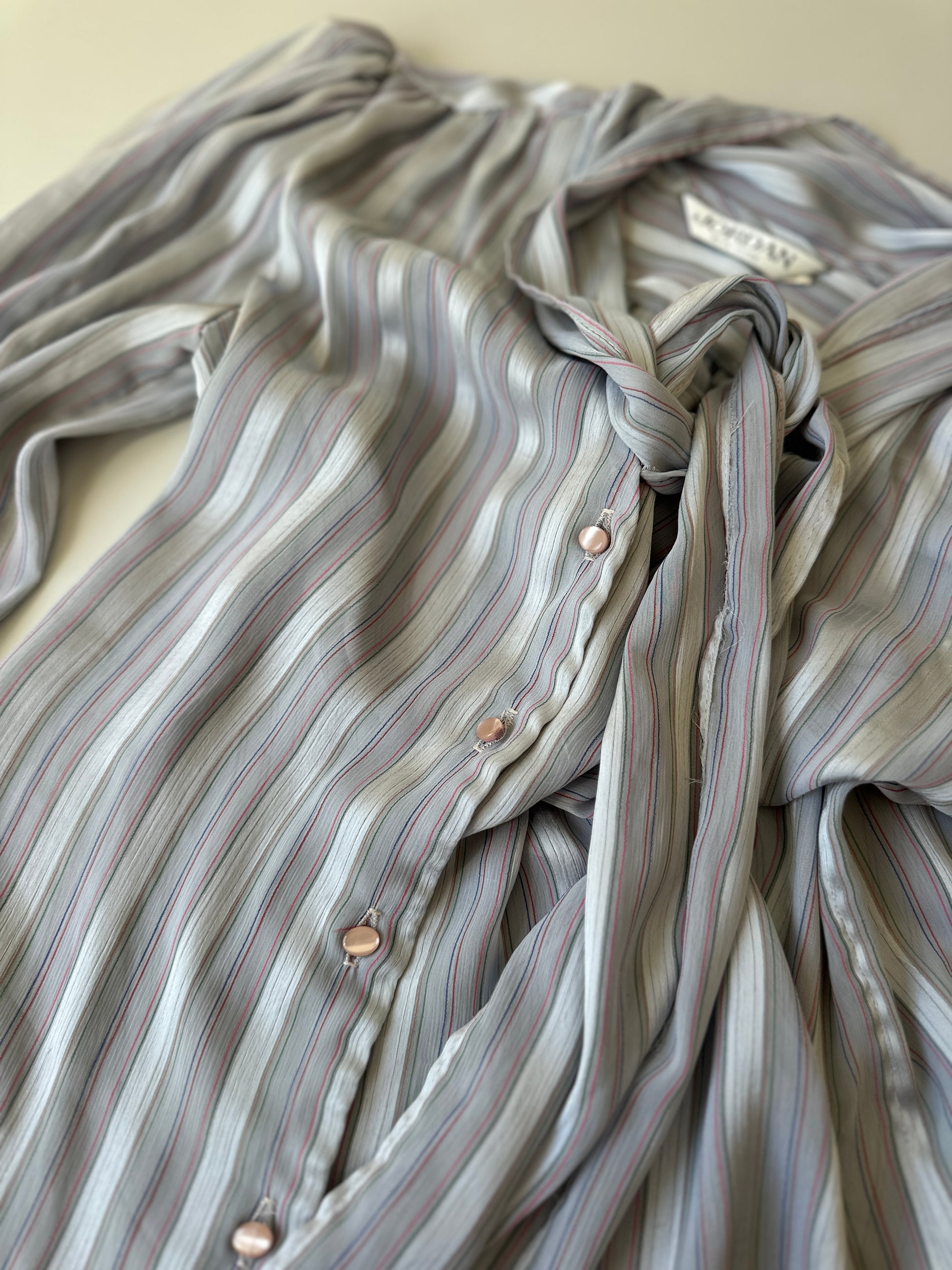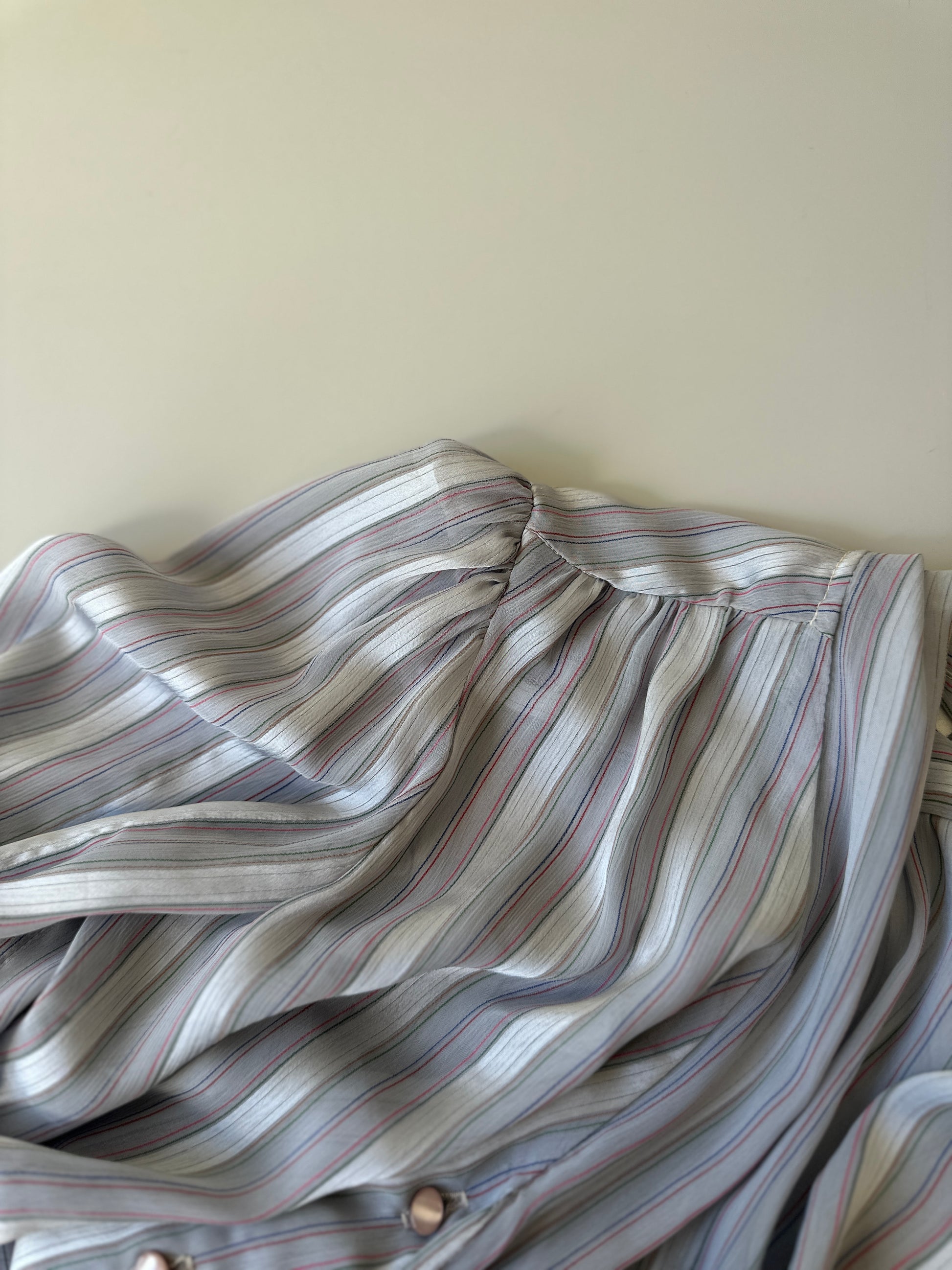 description. my absolute favourite thing about this piece is the pinstripes, all different colours. pink, red, blue, green and orange. it's a weird mix but looks so sweet on the sheer grey material, with ruffled sleeves and a slight shoulder pad. finished off with a button up as well as a tie front