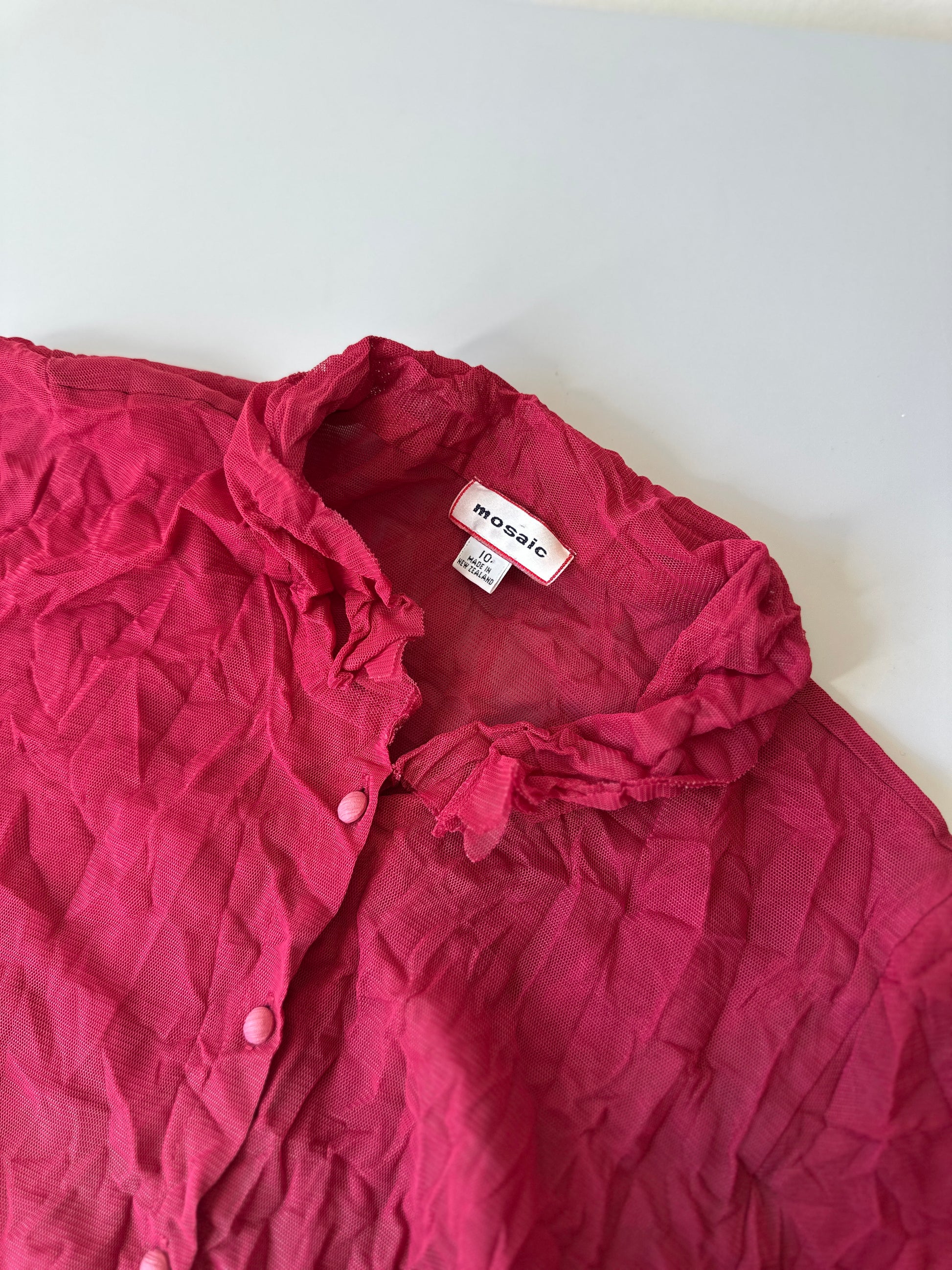 description. a sheer soft tulle-like material, that has a permanent crumple to it. in the a muted maroon colour way, with the same fabric buttons, collar, and a slight stretch