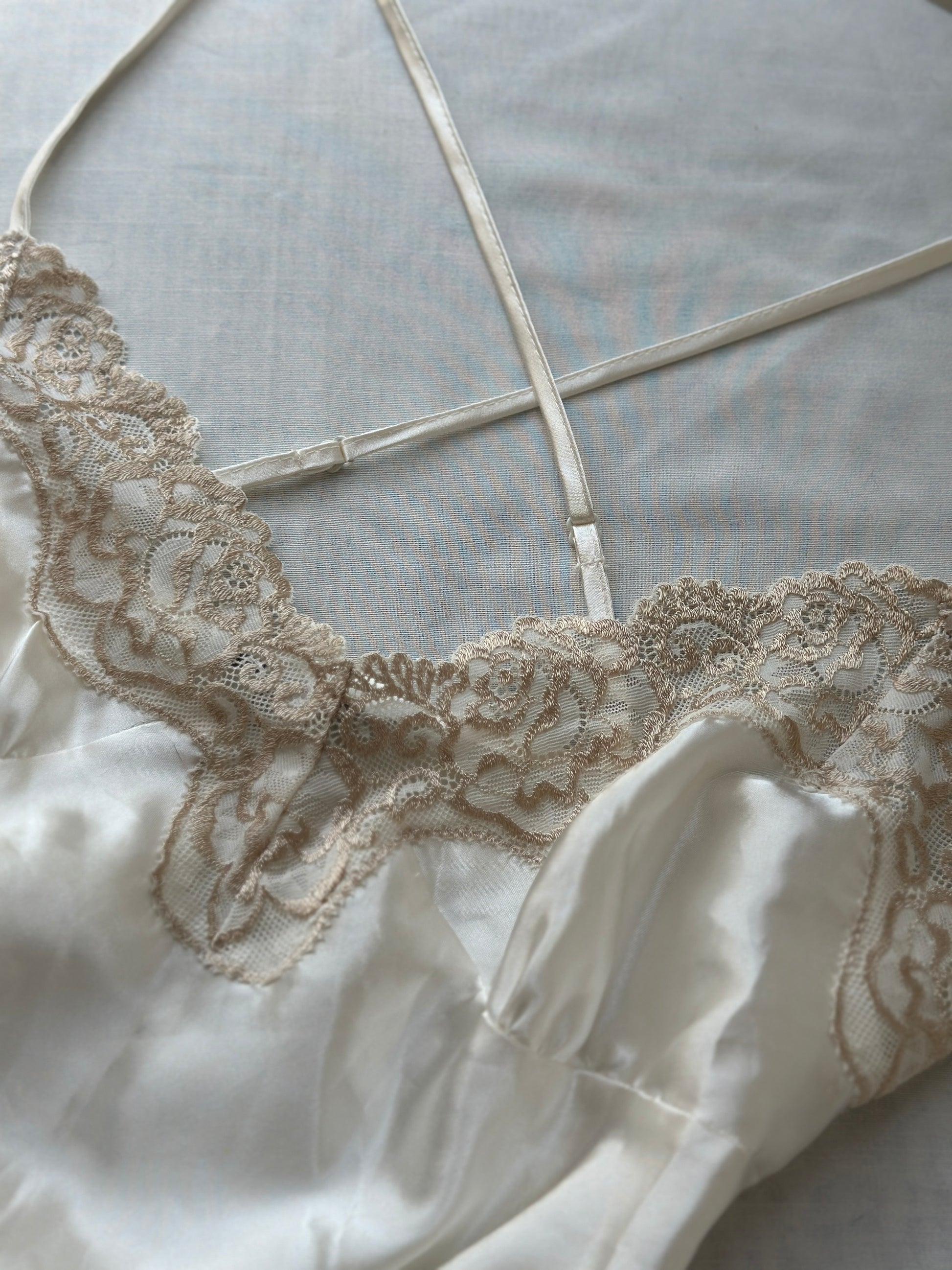 description. a beautiful white silk night gown, with faded cream lace details over the v neck bust and left side slit. the piece is cut on a bias giving room for many different body shapes regardless of the measurements, the straps also cross over on the back adding an extra element of fun