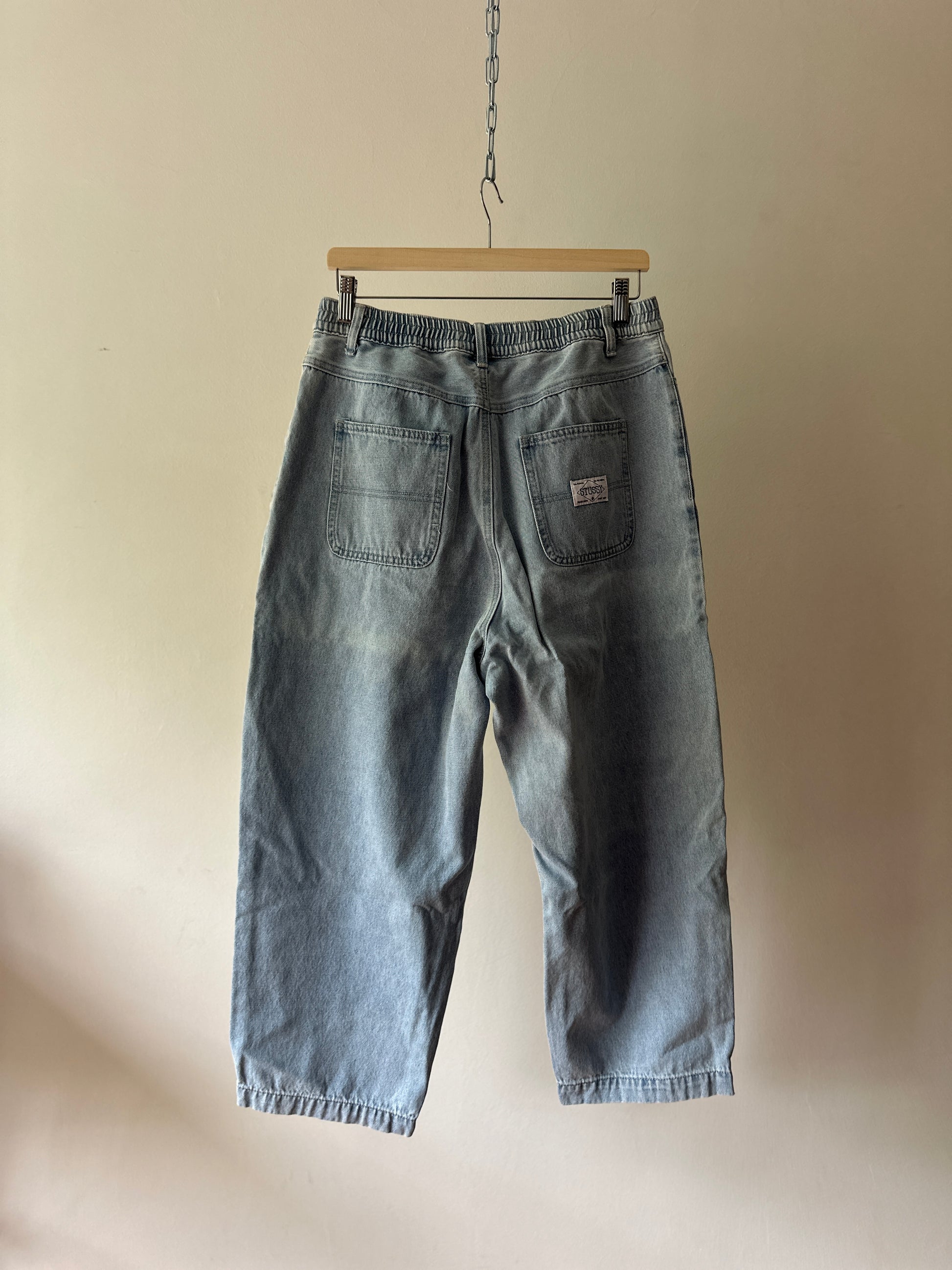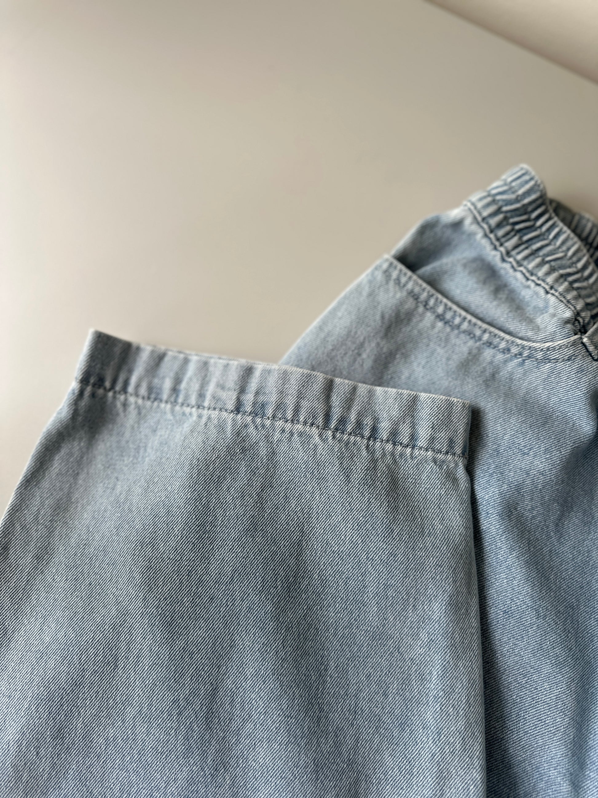 description. light blue denim with an elastic waistband. and gaucho shaped pant, widening at the hips and tapering toward the ankle