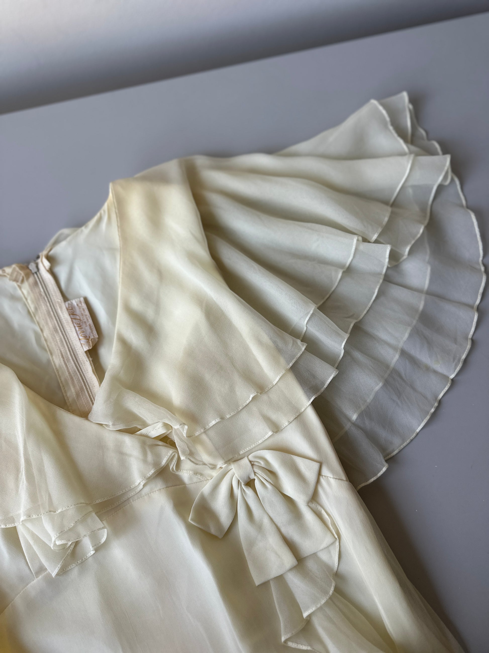 description. THE MOST BEAUTIFUL DRESS EVER- this is from my personal collection but unfortunately does not fit me anymore. on the right person, for the right event, this dress is honestly so fucking stunning.... it's butter yellow, with flows ruffled sheer sleeves, fitting the top and flowing down to more ruffles on the bottom of the skirt. honestly. this dress deserves a home