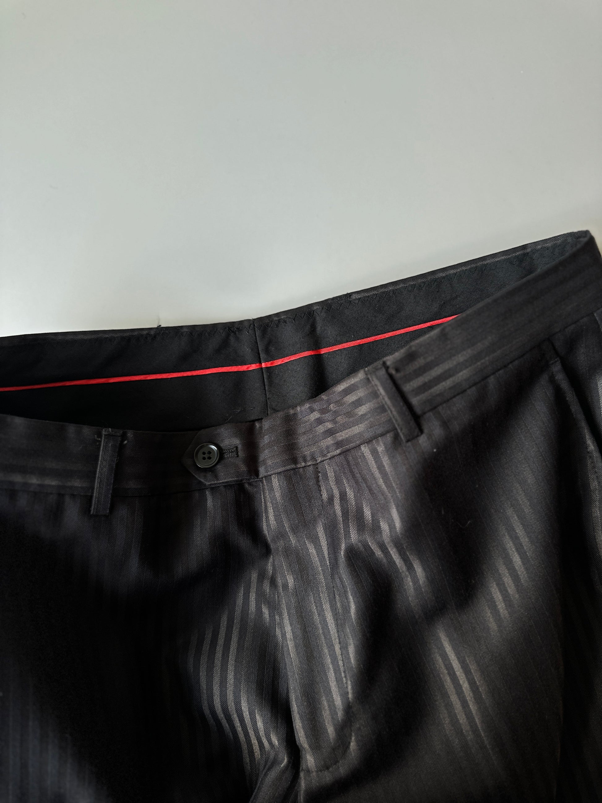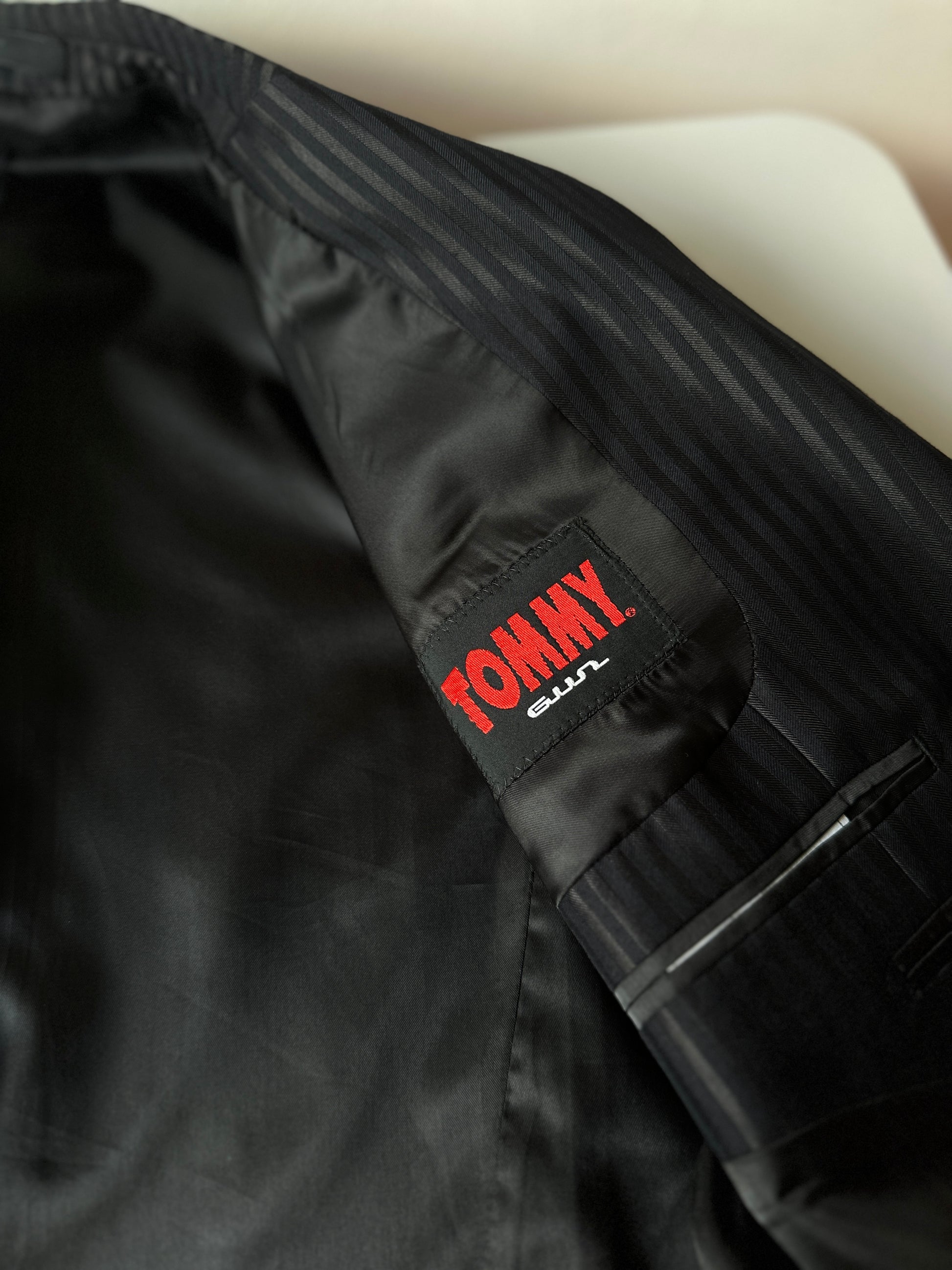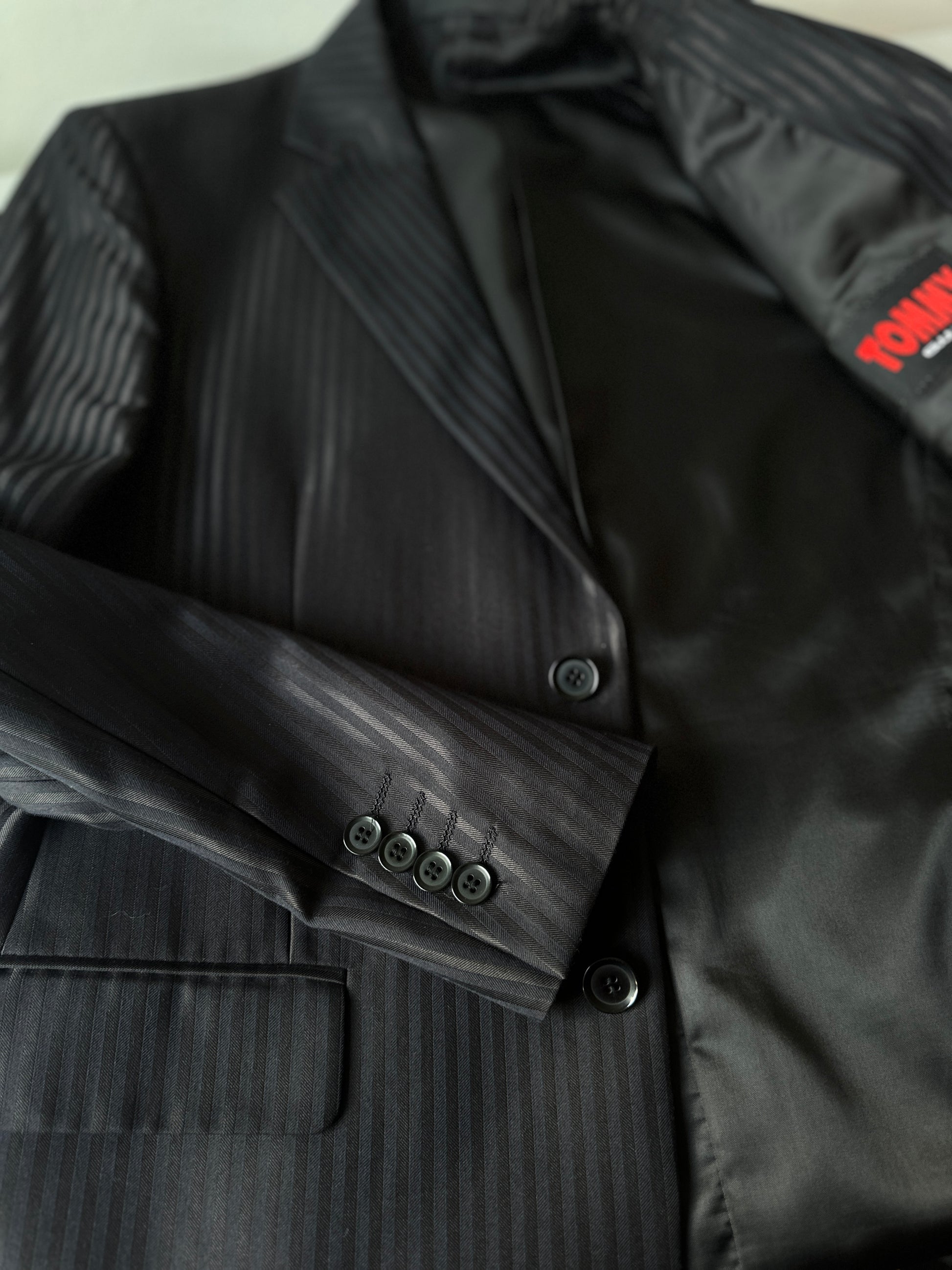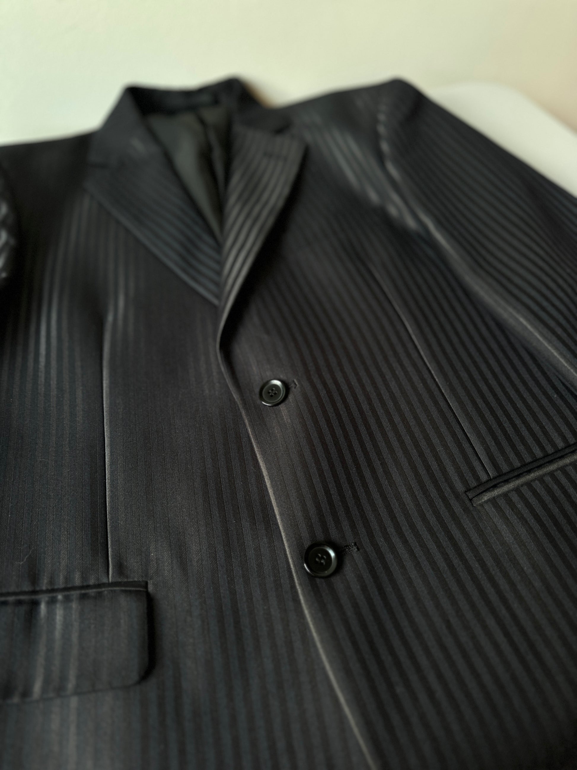description. I lowkey think this is a costume suit, but it's a tailored great and has a nice black pinstripe fabric, would look awesome on a night out with a simple white button up and thin black tie (also you can find on QUTE.)