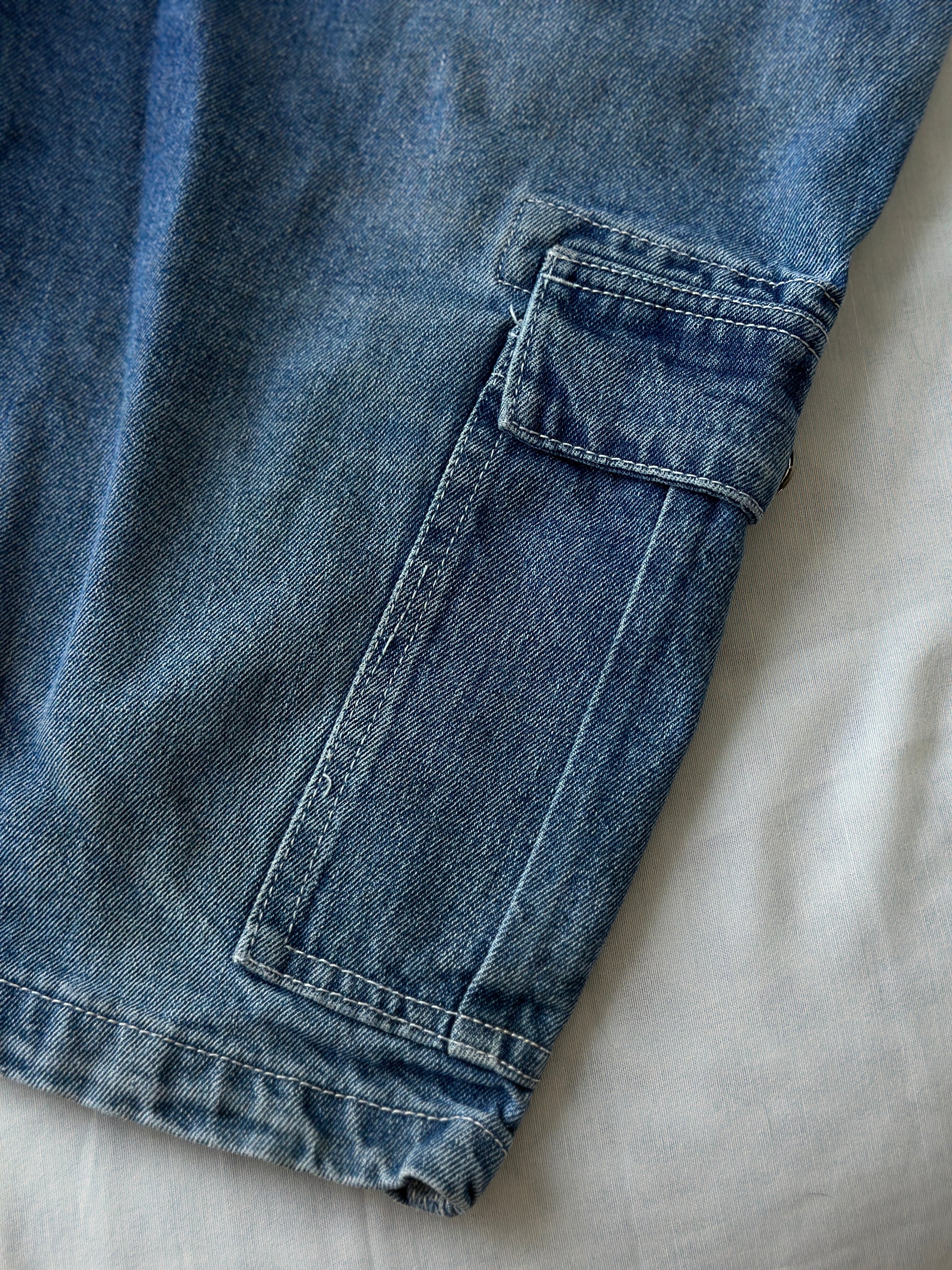 description. a great pair of blue denim shorts, they're giving carhartt vibes with the side pockets and workwear aesthetic. I really like these and think they would look great on someone, low waisted and baggy