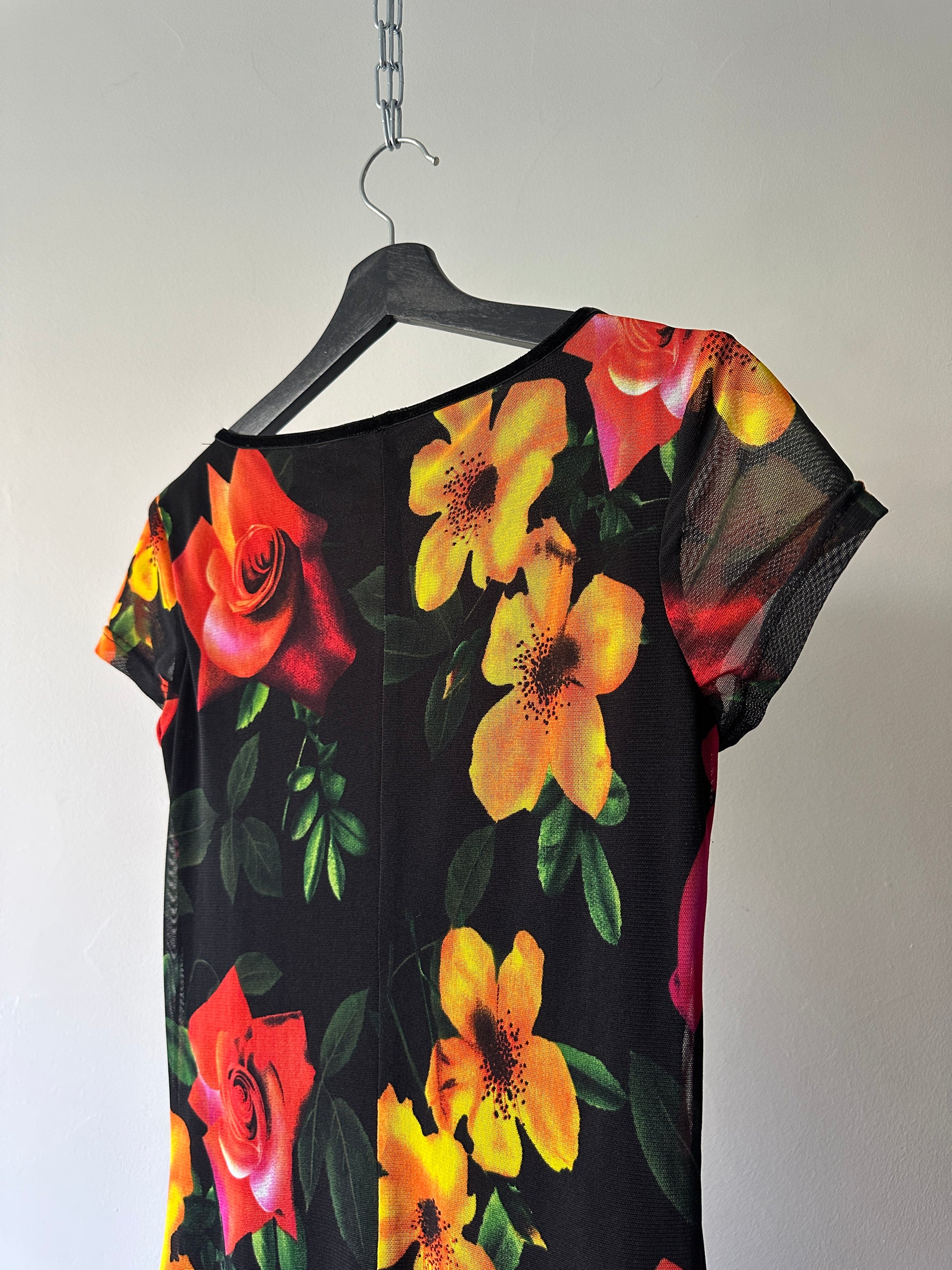 description. an iconic 90s Australian dress, with the tropical floral mesh print and black lining, not to mention a velvet line around the scoop neck. this will look super cute with some Mary janes or platforms.. make a statement!