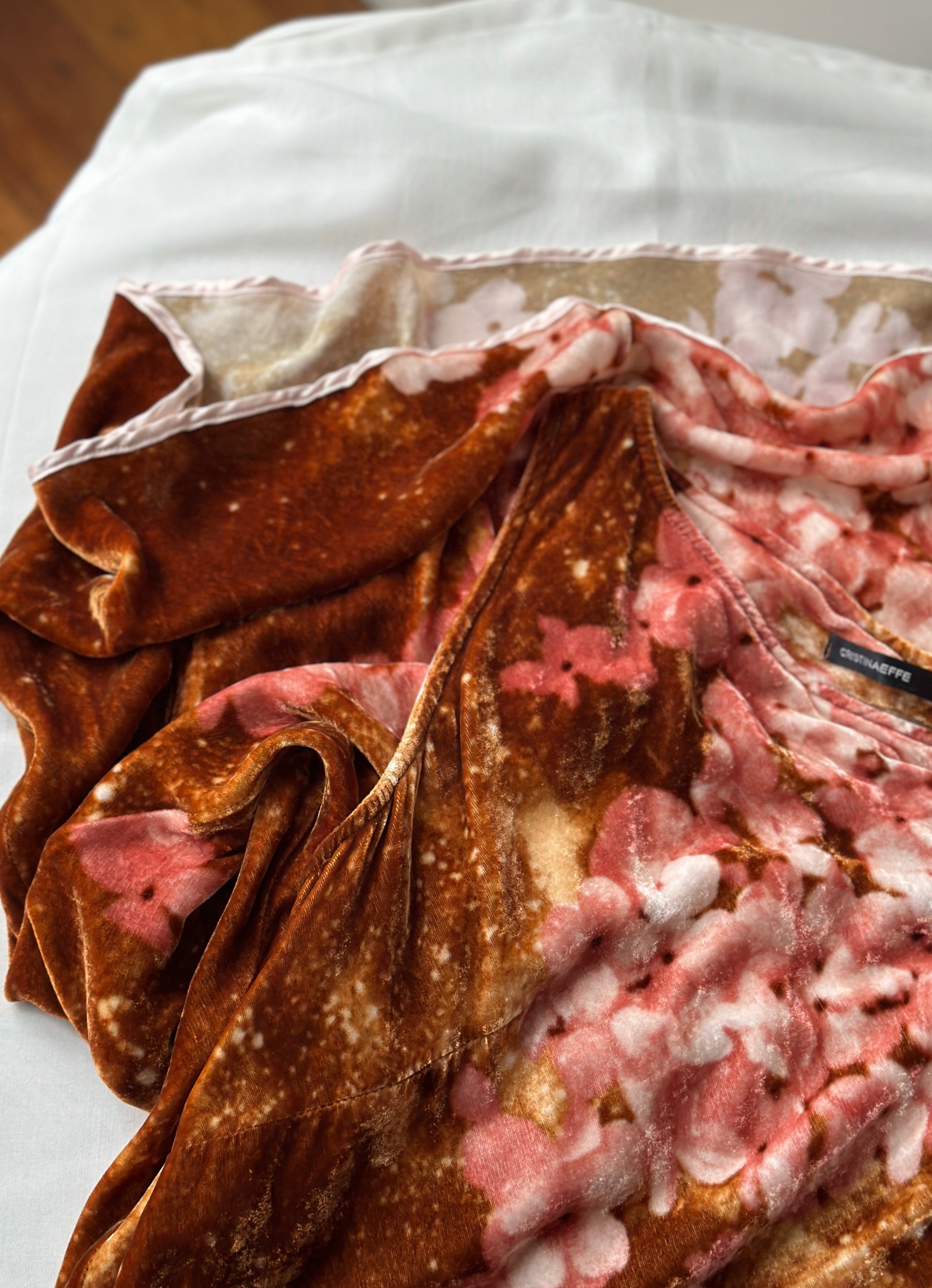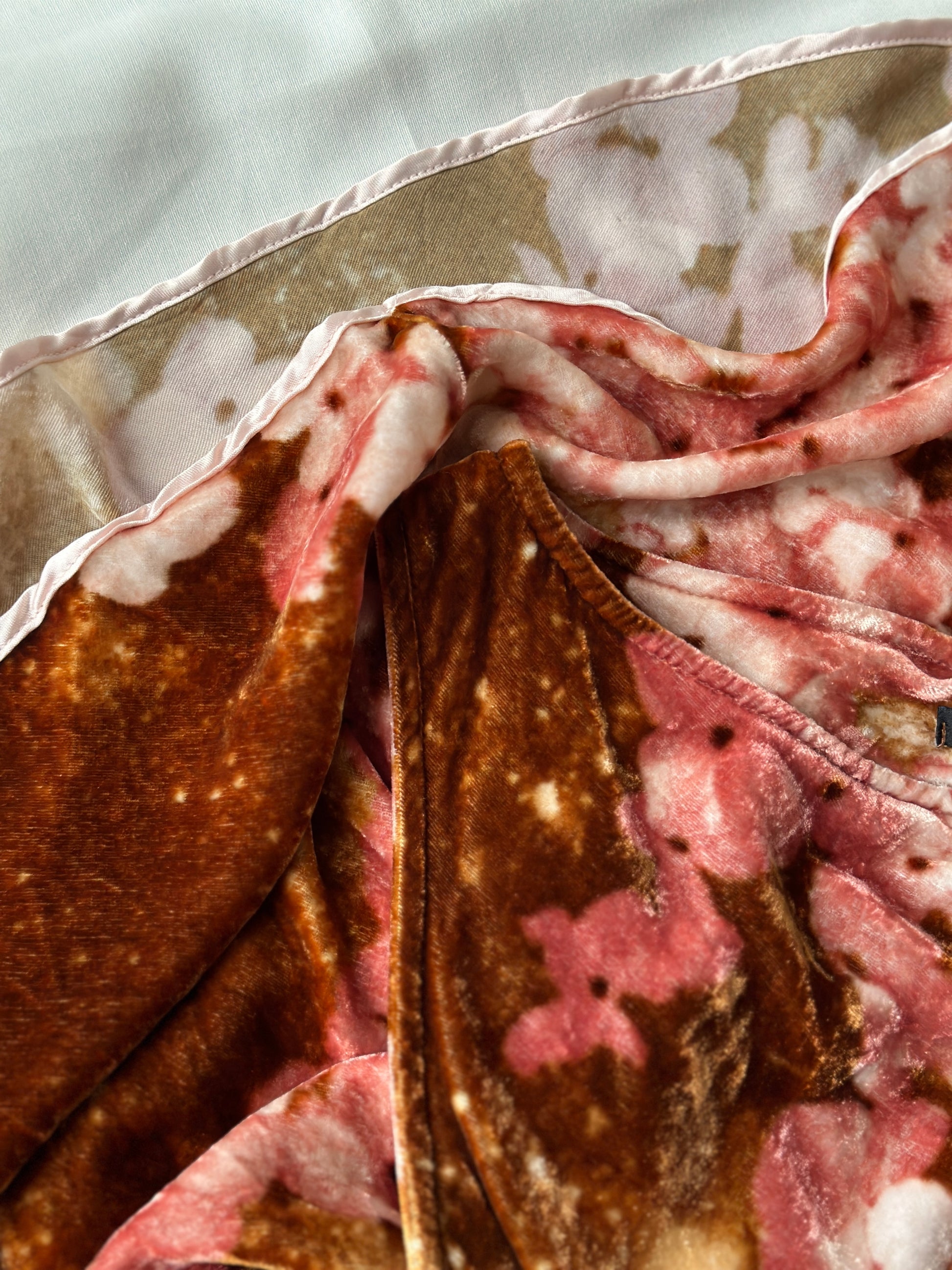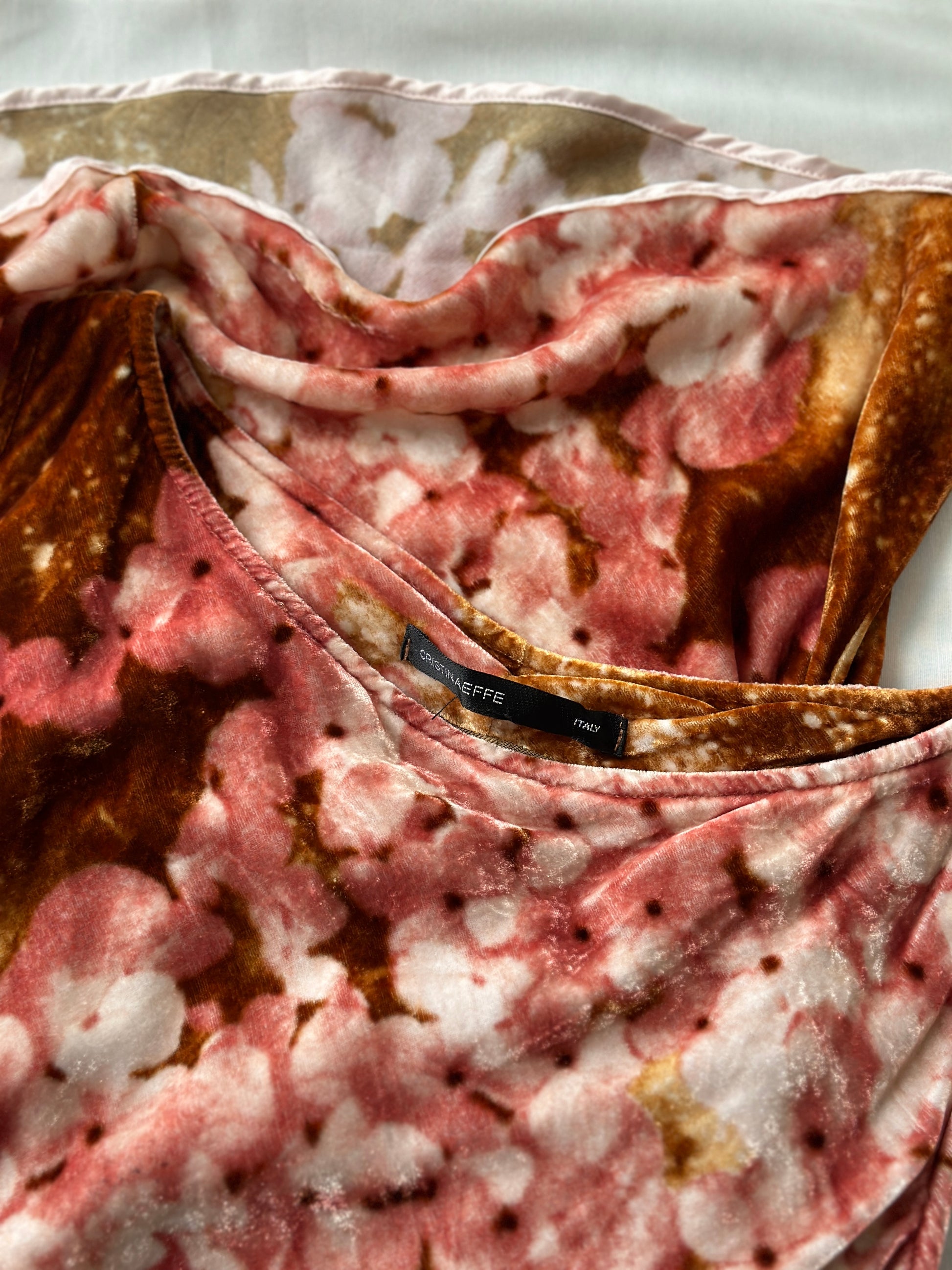 description. an absolutely beautiful silk and velvet bias-cut Christina Effe dress with a ribbon trimming, and a wonderful brown and pink floral print that look very similar to cherry blossoms. made in Italy