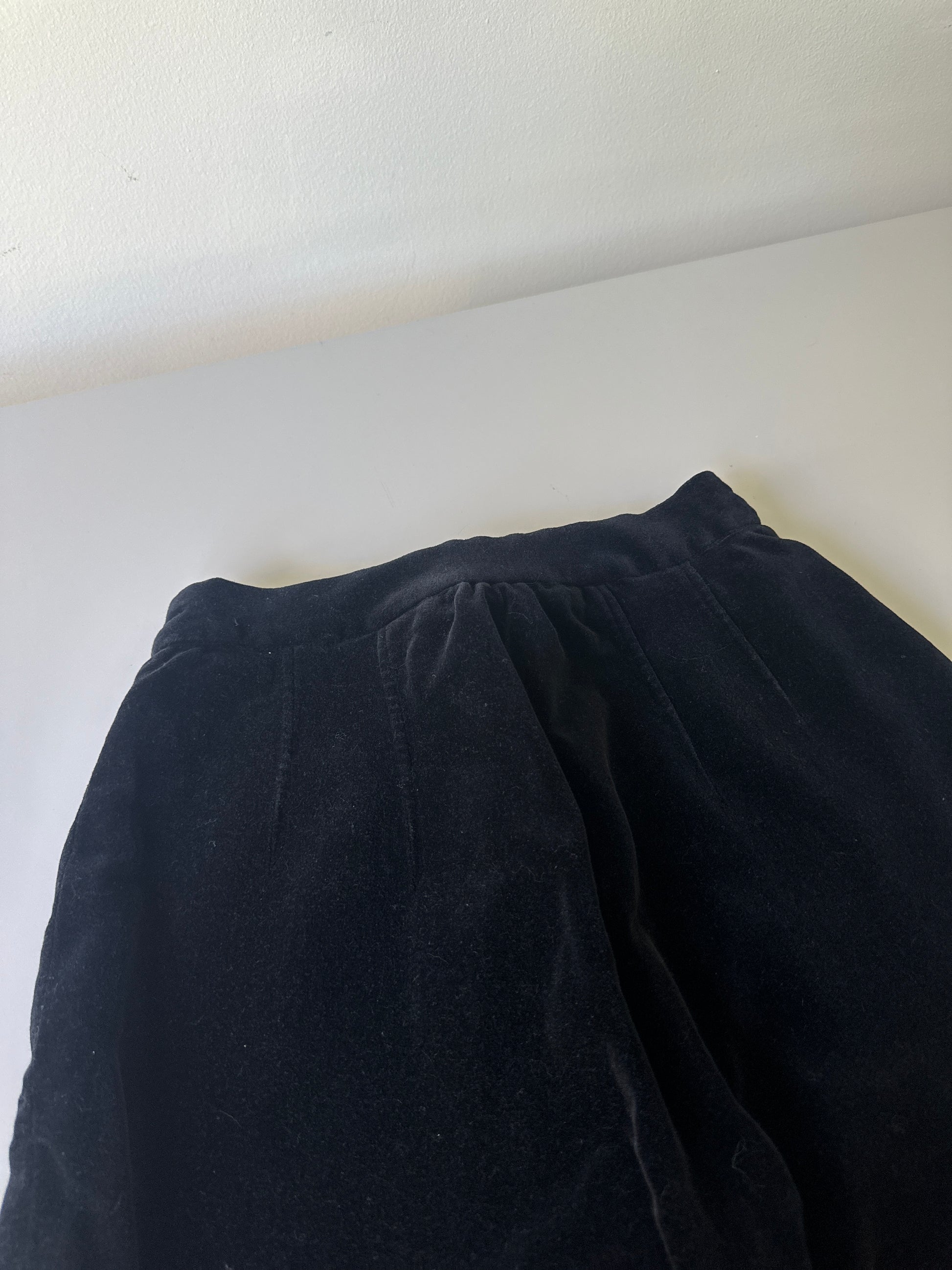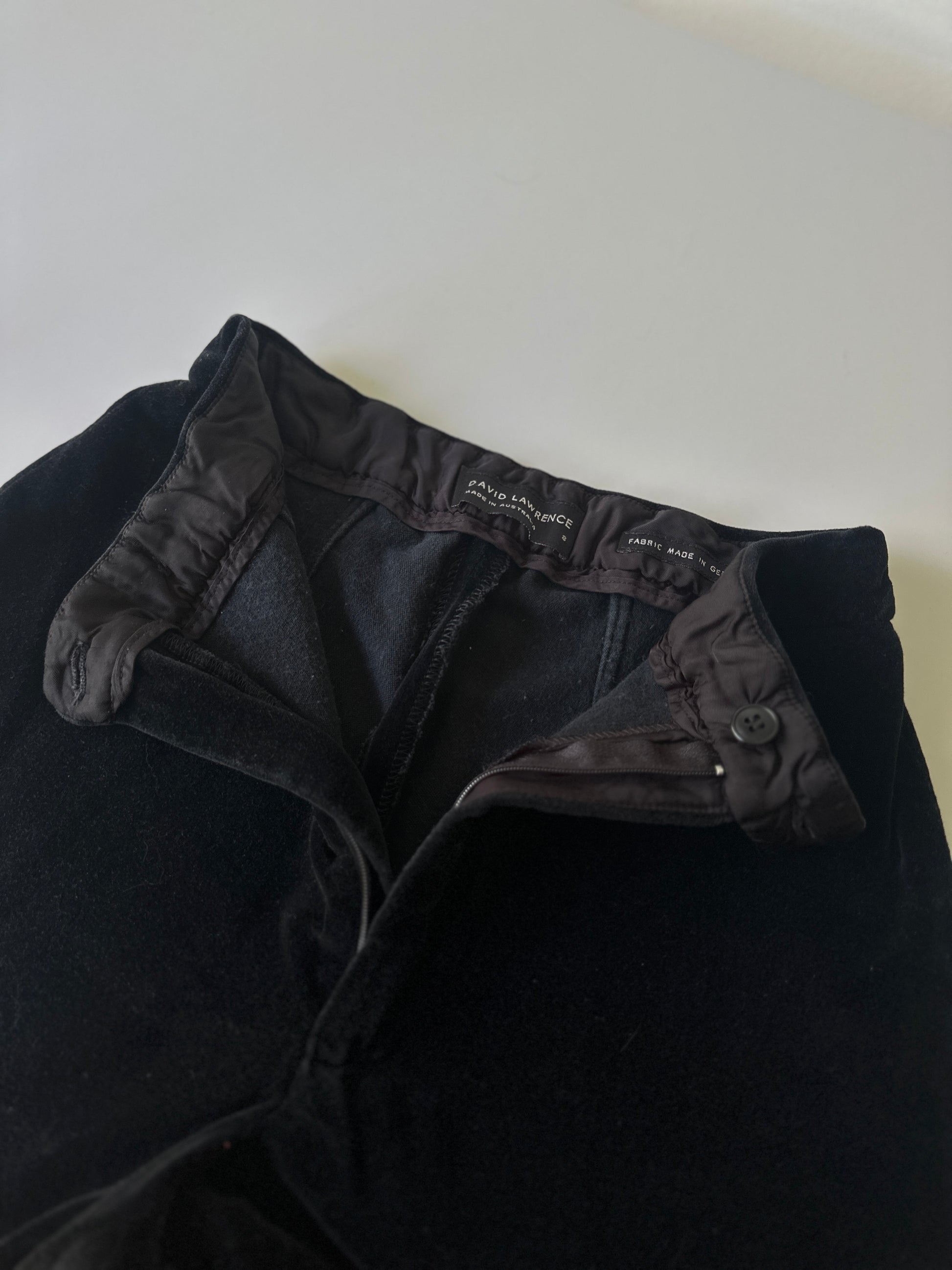 description. Made in Australia. black velvet high waisted fitted trousers, with pleats at the front- no pockets at all, but paired marvellously with a QUTE bag..