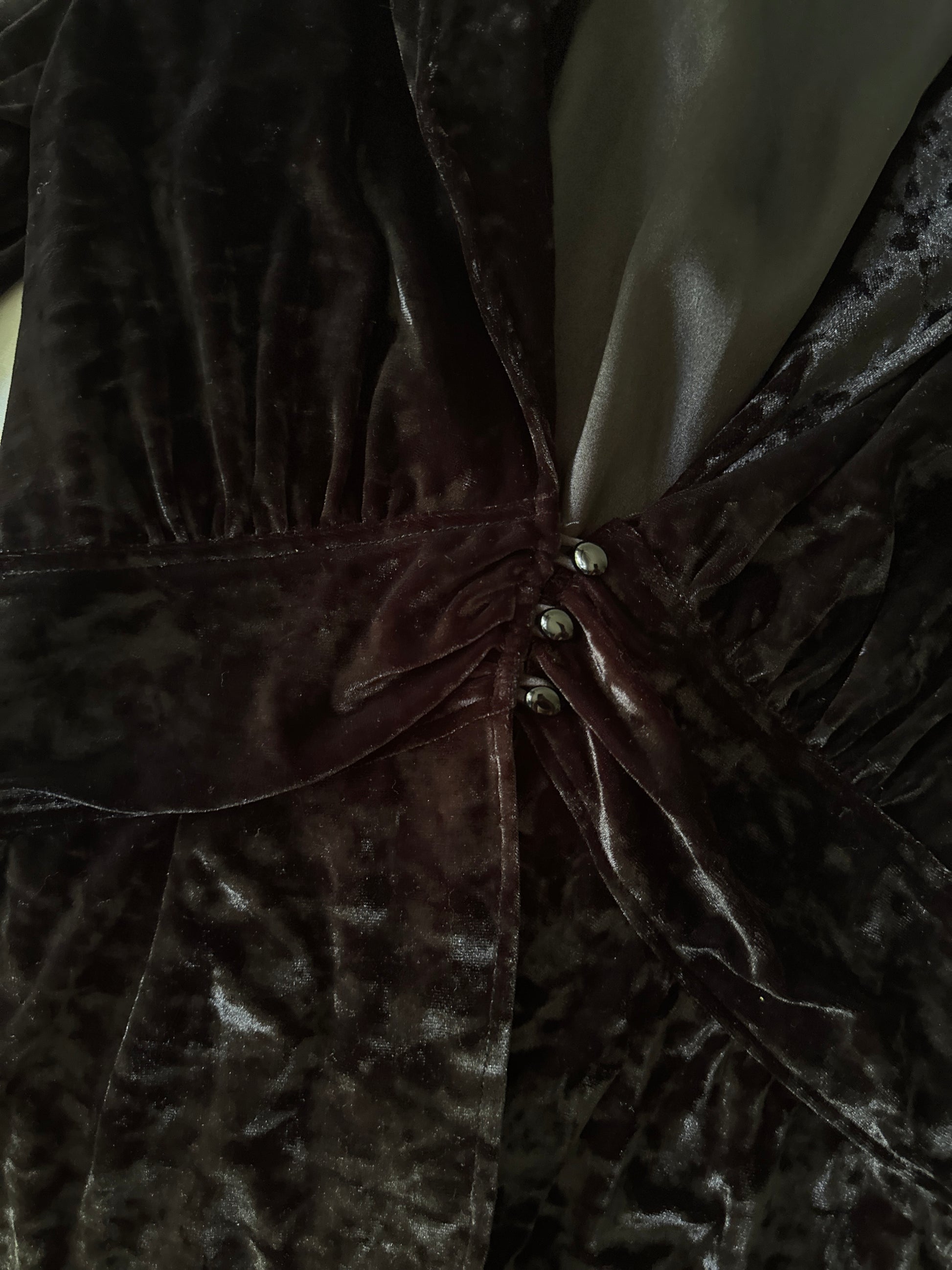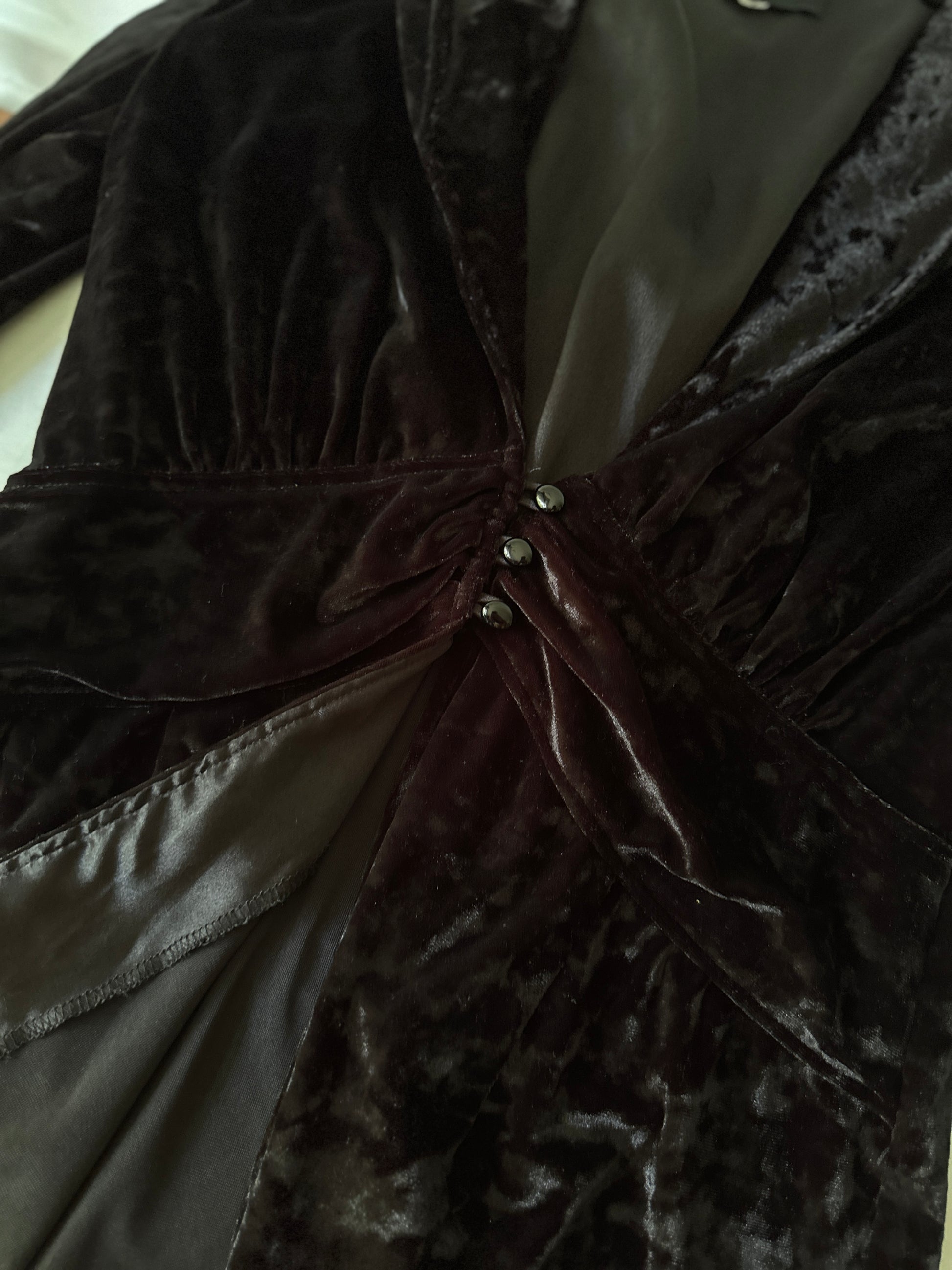 description. the fit of this blouse is to die for, on the right person it will honestly make you feel like a vampire queen. it has a stunning neckline, and we can't go past the fact that it's velvet with just a couple of buttons doing up the front. the touched breast area and flared waist really makes it such an iconic 90s blouse that was worn by any and every whimsical goth up until now