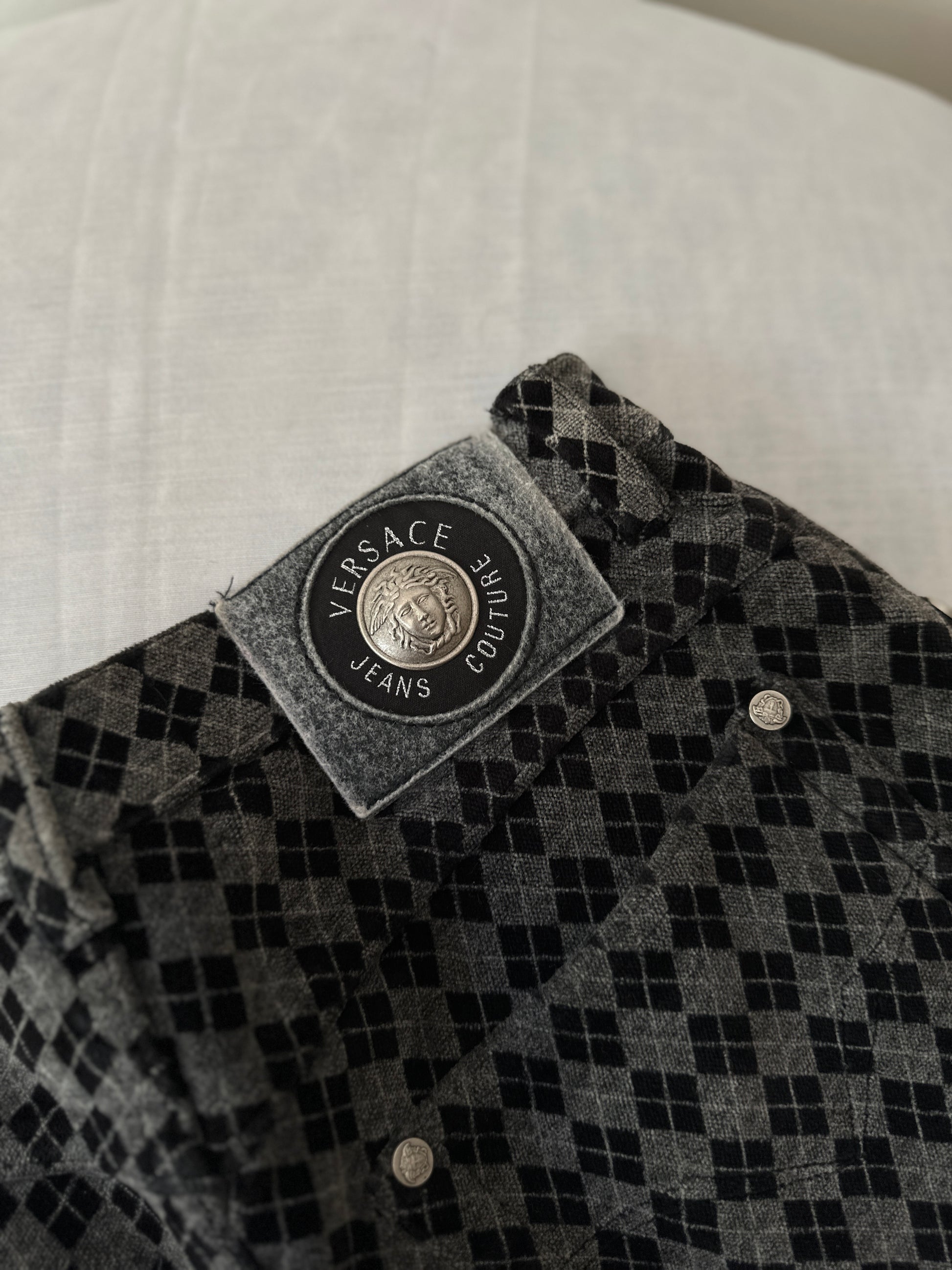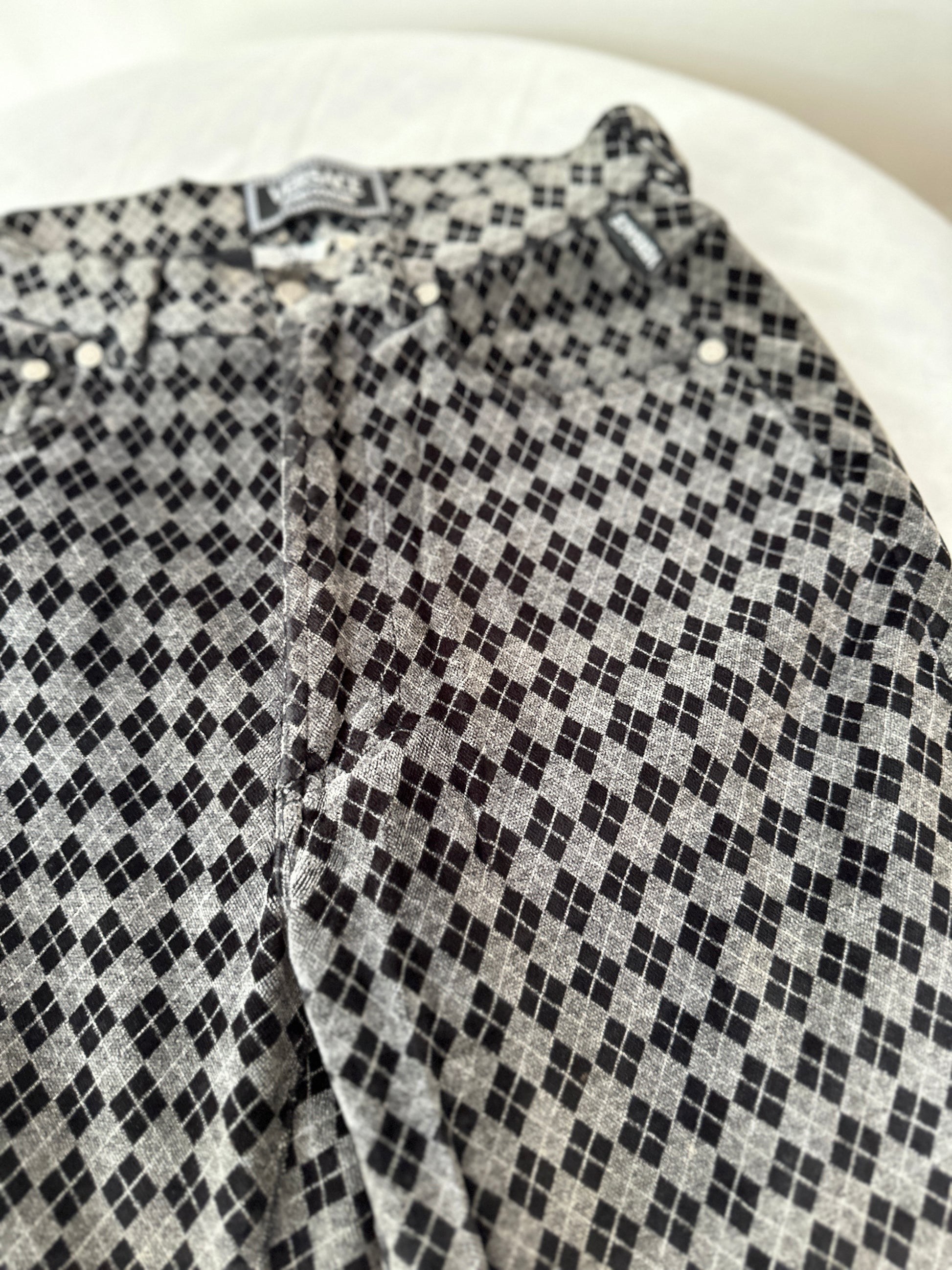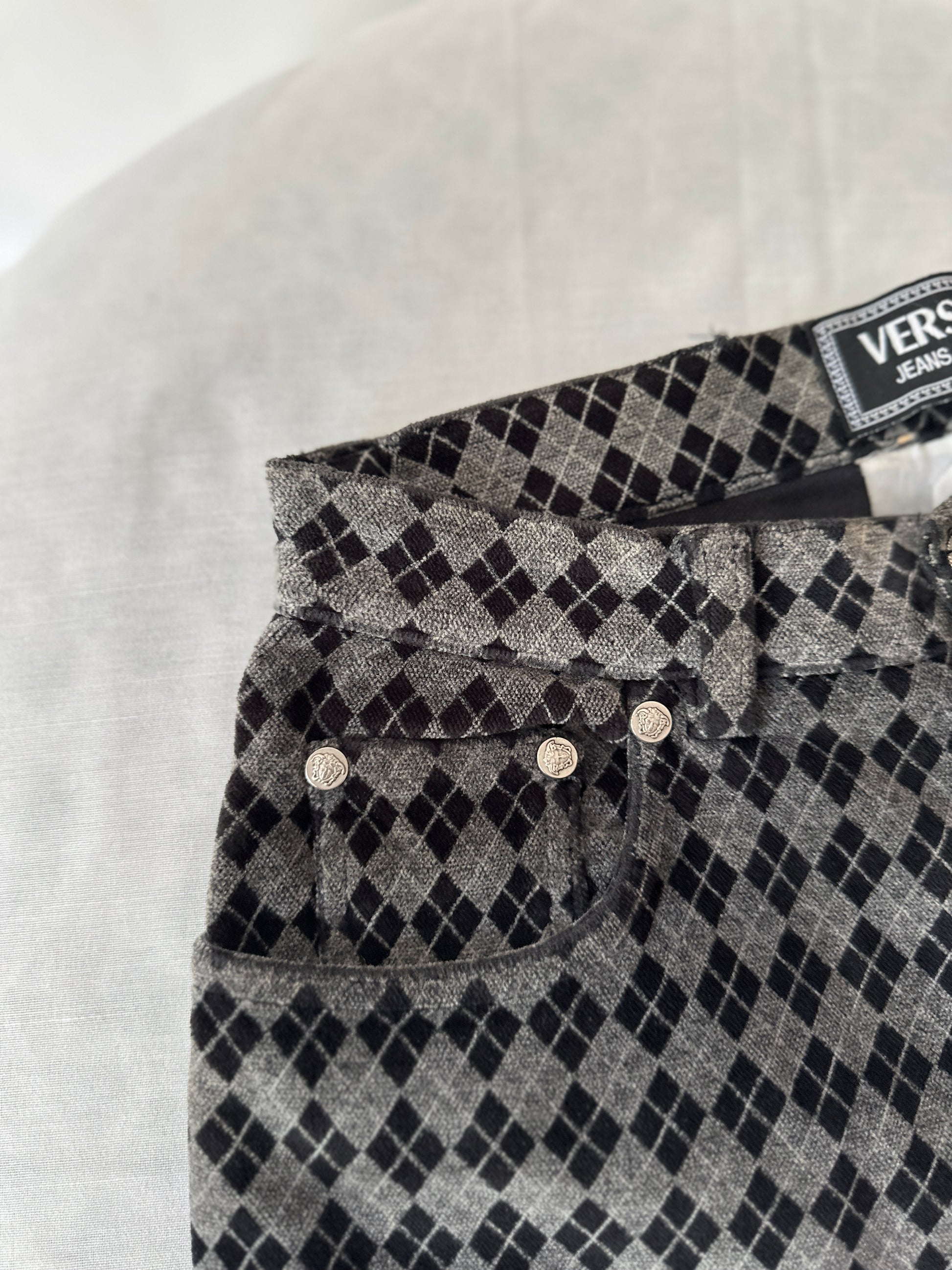 description. I spent years thinking about these pants when I first saw them in a tv show and then found them online for sale one day and purchased them straight away. unfortunately they do not fit my anymore so they are leaving my closet and going into the QUTE. one- they deserve a new home because they are THE most incredible pair of high waisted pants. the pattern alone, plus the velvet fabric and monochromatic colurway, but they are 90s VERSACE