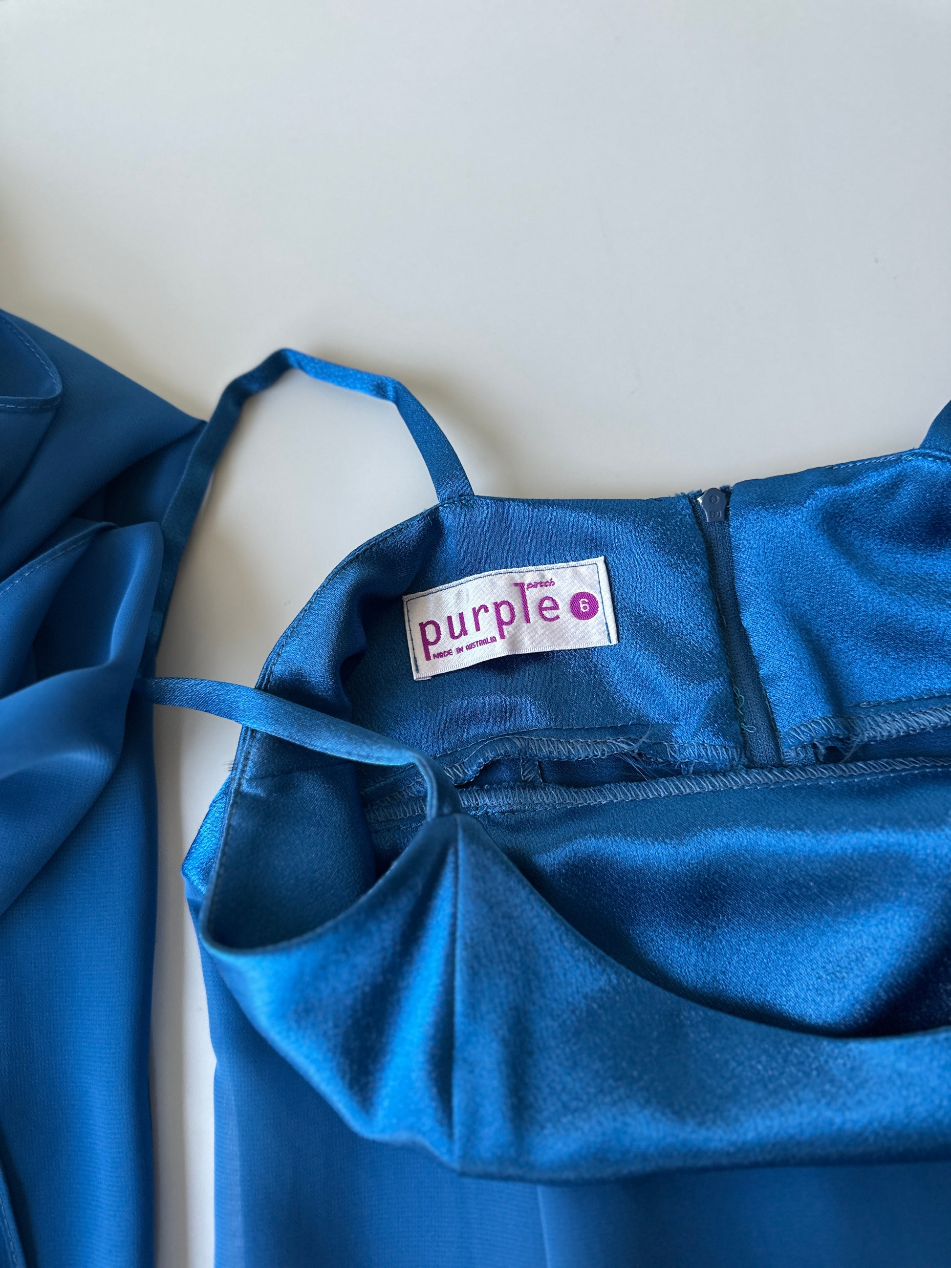 description. a STUNNING vibrant blue formal dress. this is the sweetest 90s-00s dress with a shiny silk-like bust and skirt, an overlay of soft mesh AND a neck scarf to top it off. this NEEDS to be someones formal dress