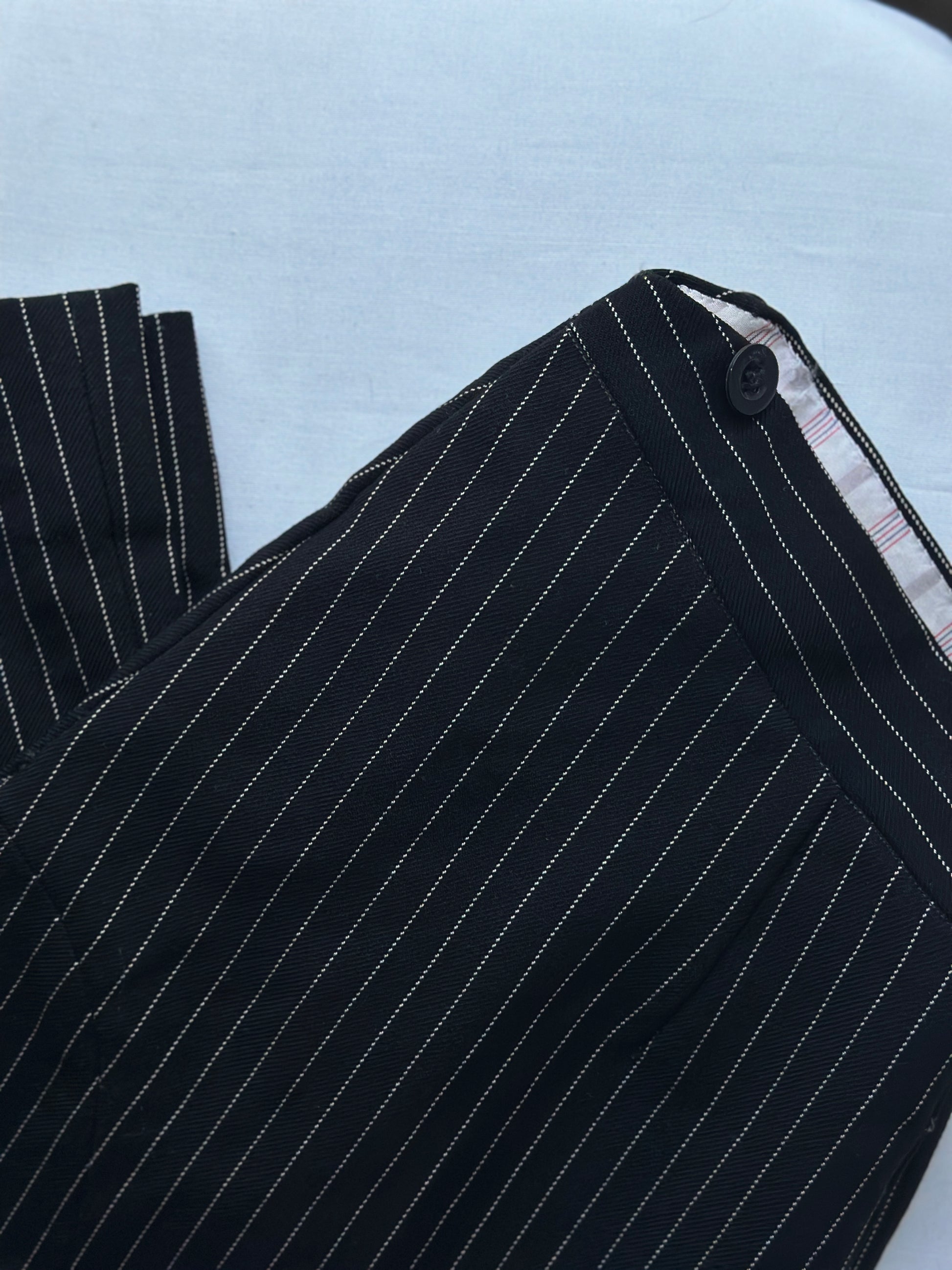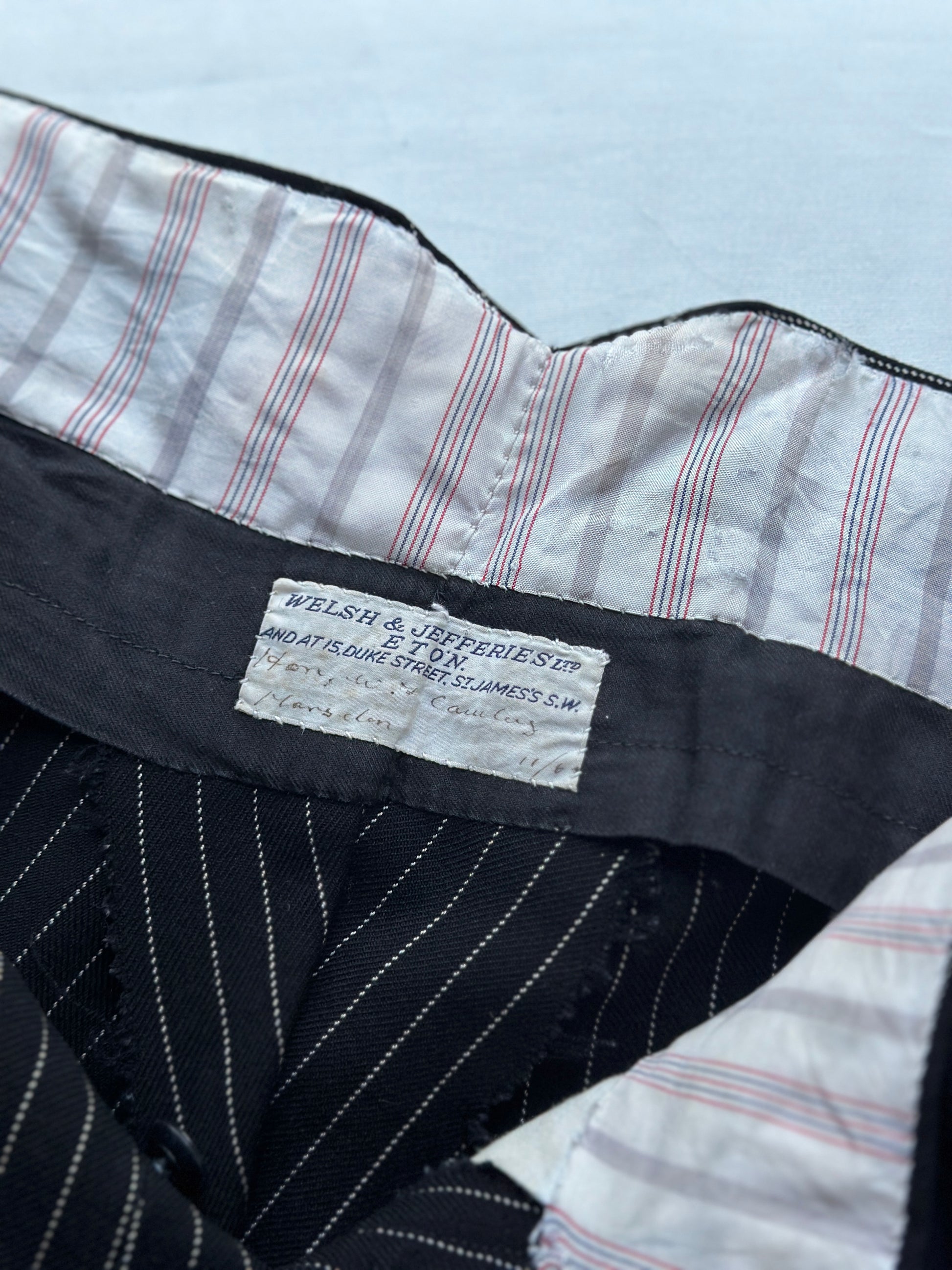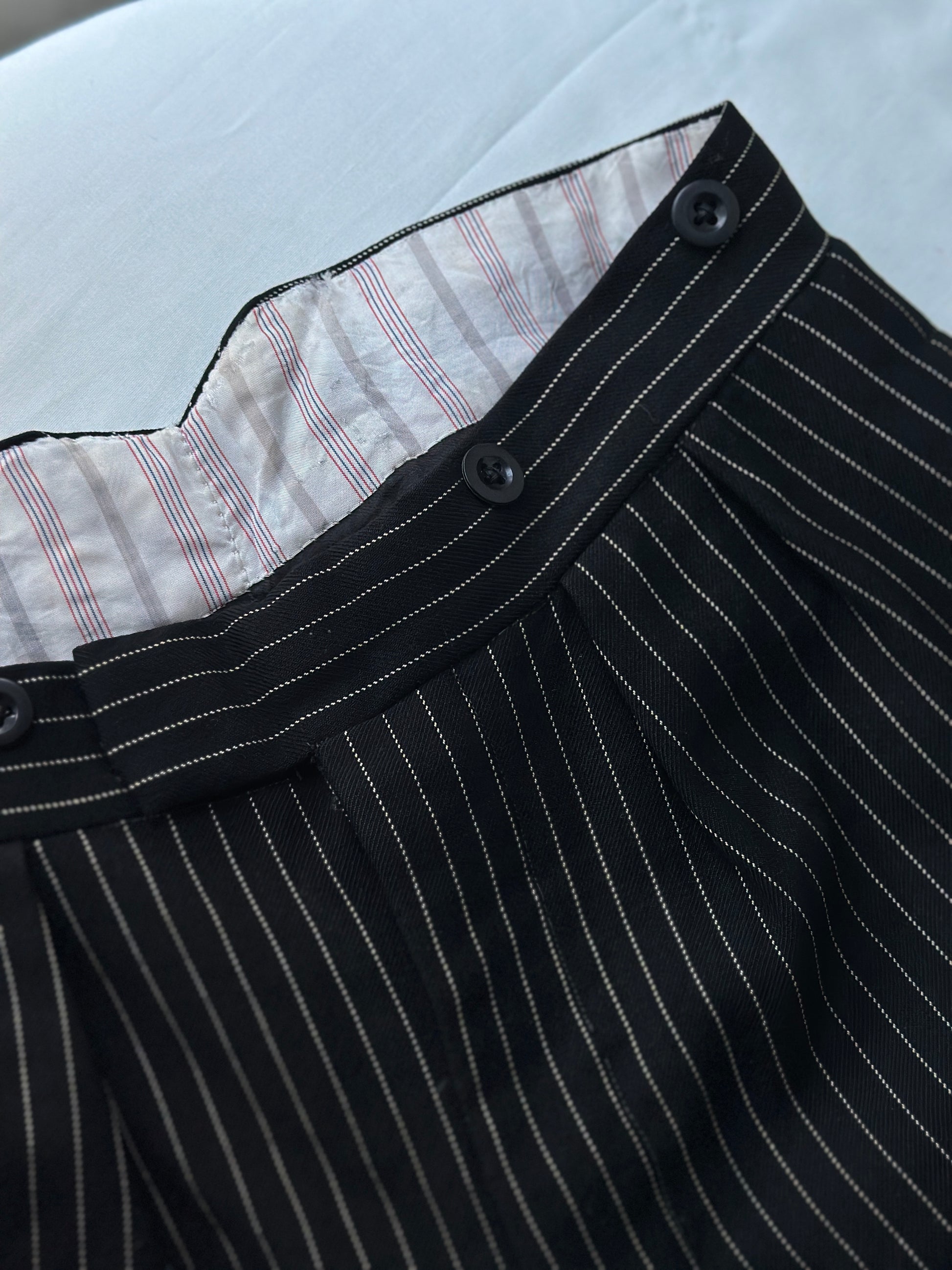 description. these vintage pin striped trousers are a fantastic piece of history, I would assume close to 1950s. there are also suspender buttons on the front and back of the waistband