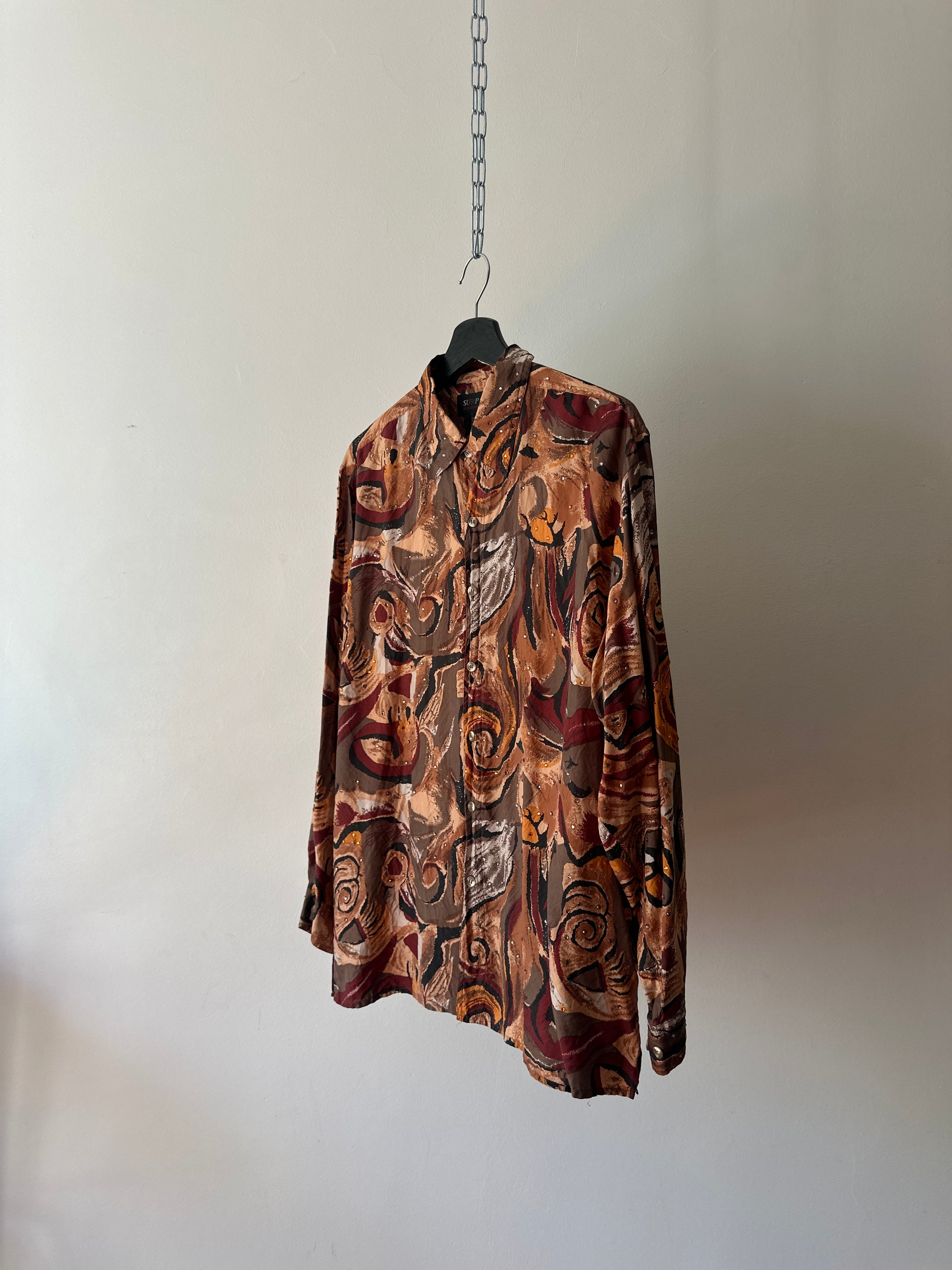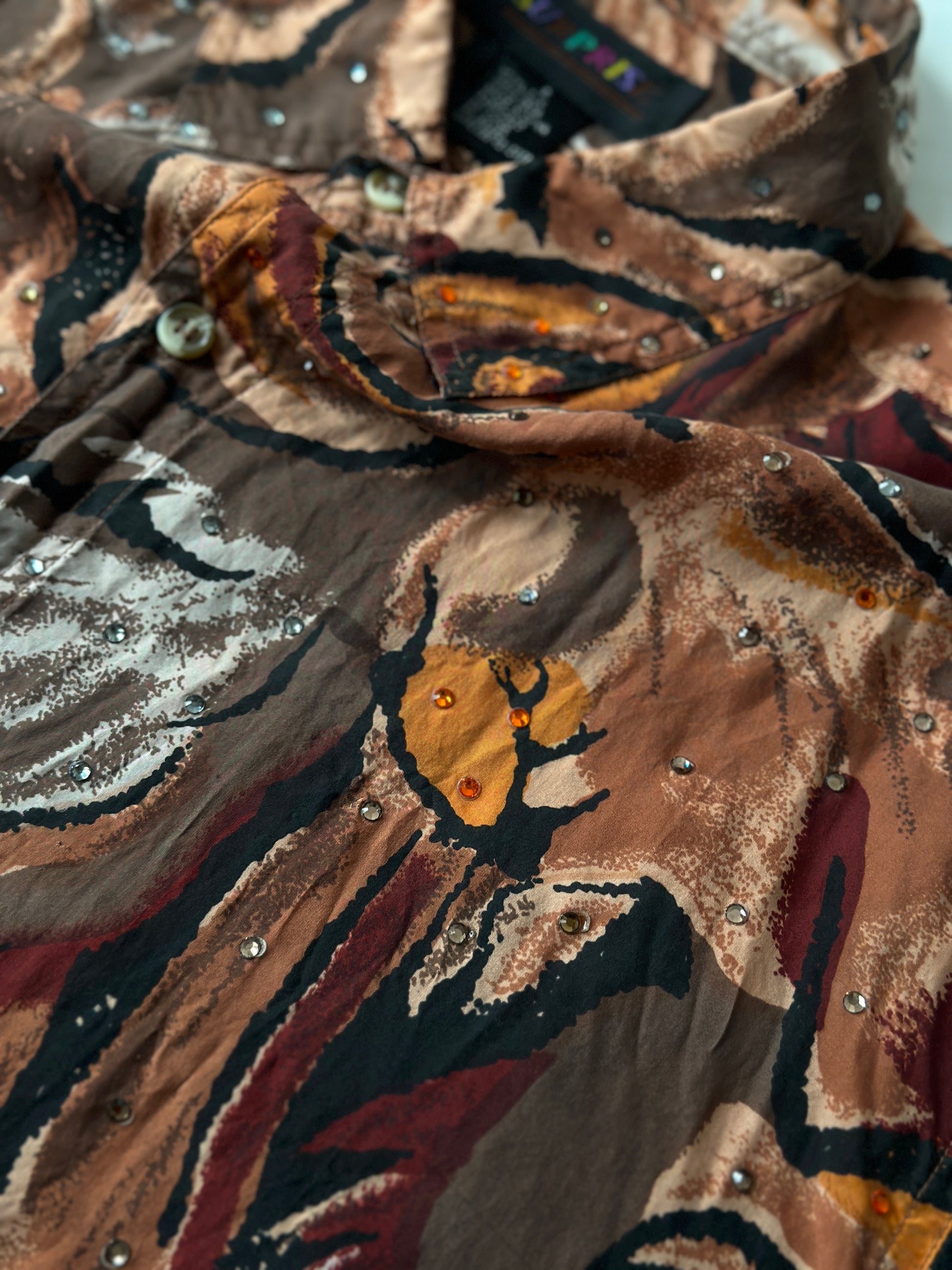 description. an absolutely wonderful silk shirt with THE coolest print AND gemstones stuck all over. the groovy vintage label 'surprise' adds another level of cool, this shirt is great for parties and just generally looking good in- no pockets unfortunately