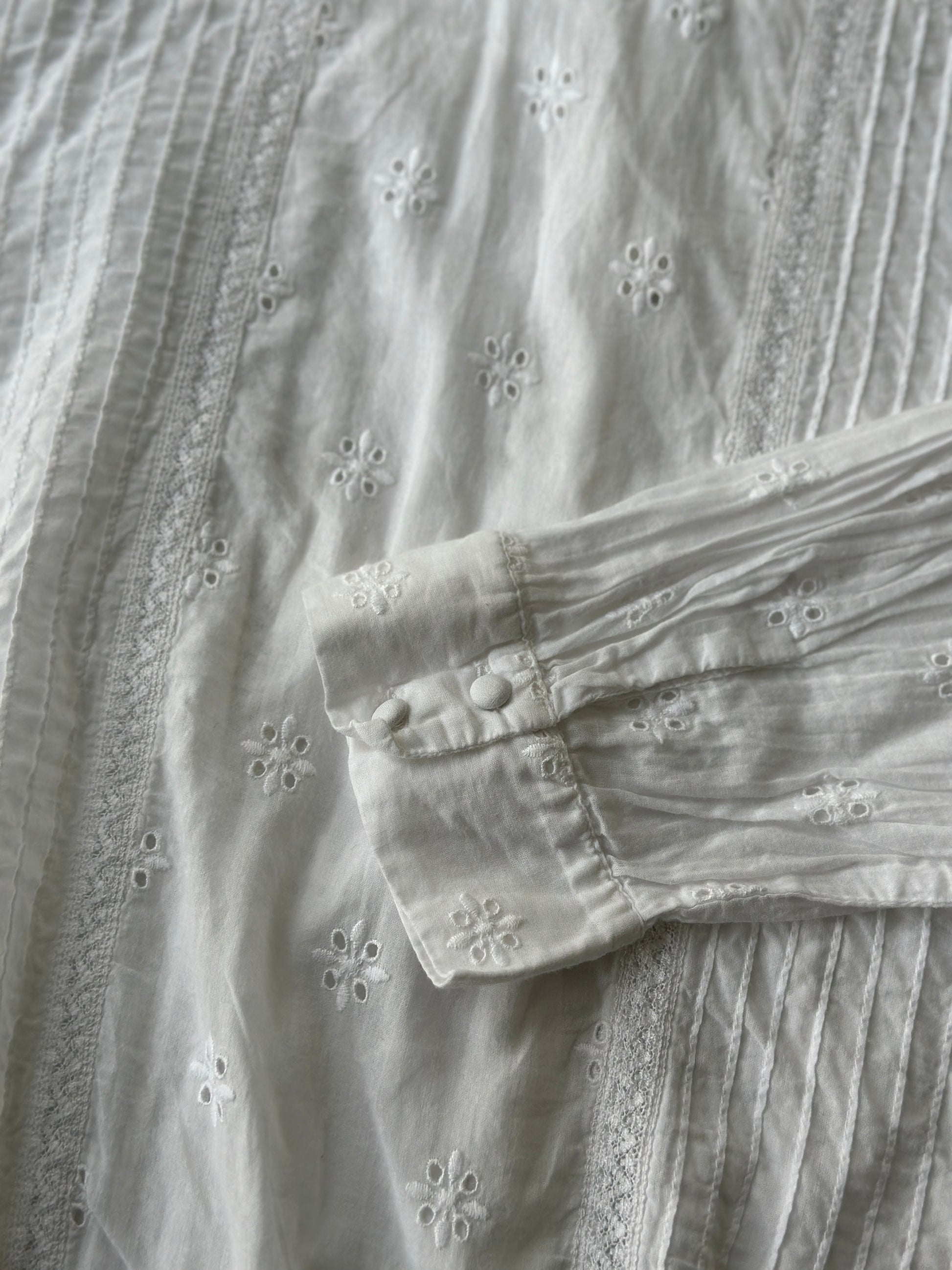 description. a very sweet cotton white embroidered blouse, the label is faded- the back is a full push button up