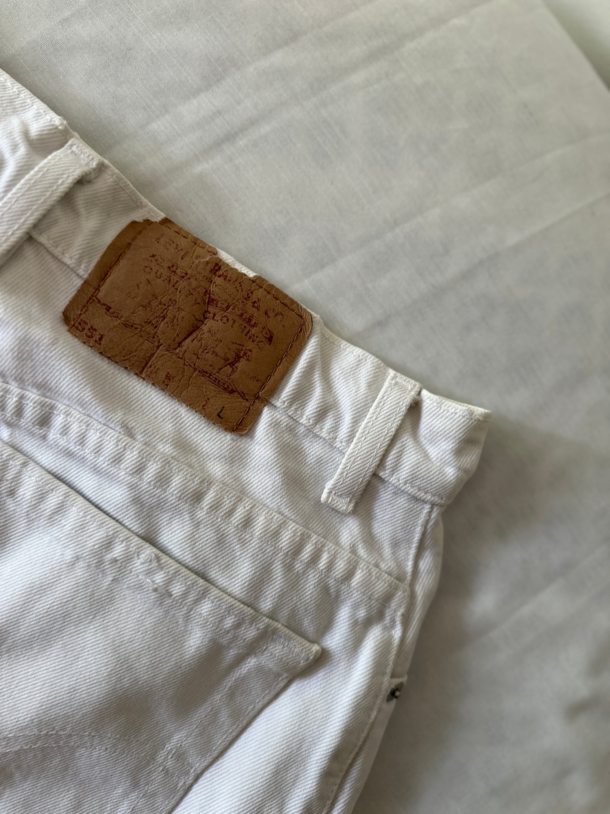 description. a fantastic pair of white Levi high waisted jeans, great for any wardrobe. unisex, jut check the measurements. the hem on the bottom of the jeans is frayed adding a vintage aesthetic and the back logo tab is worn out