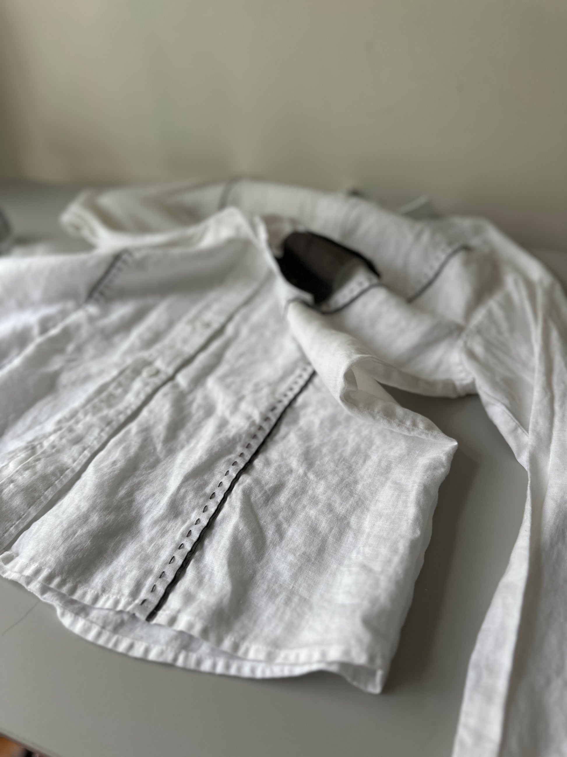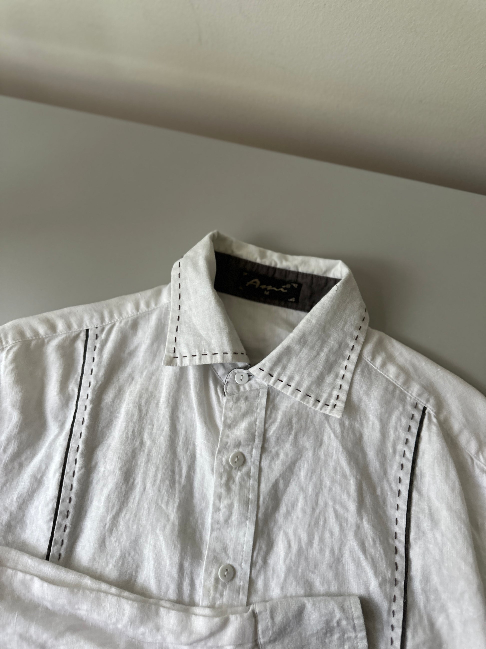 description. a fantastic white linen button up with brown stitching down the front of the shirt and edge of the collar