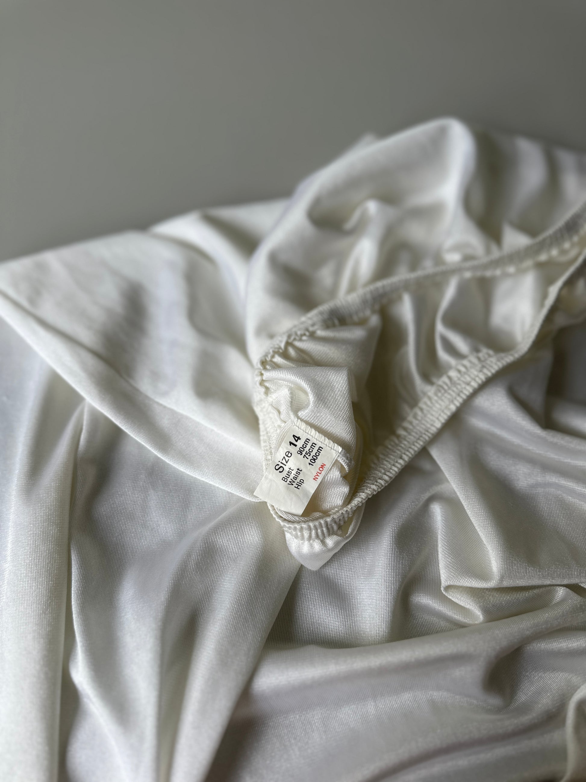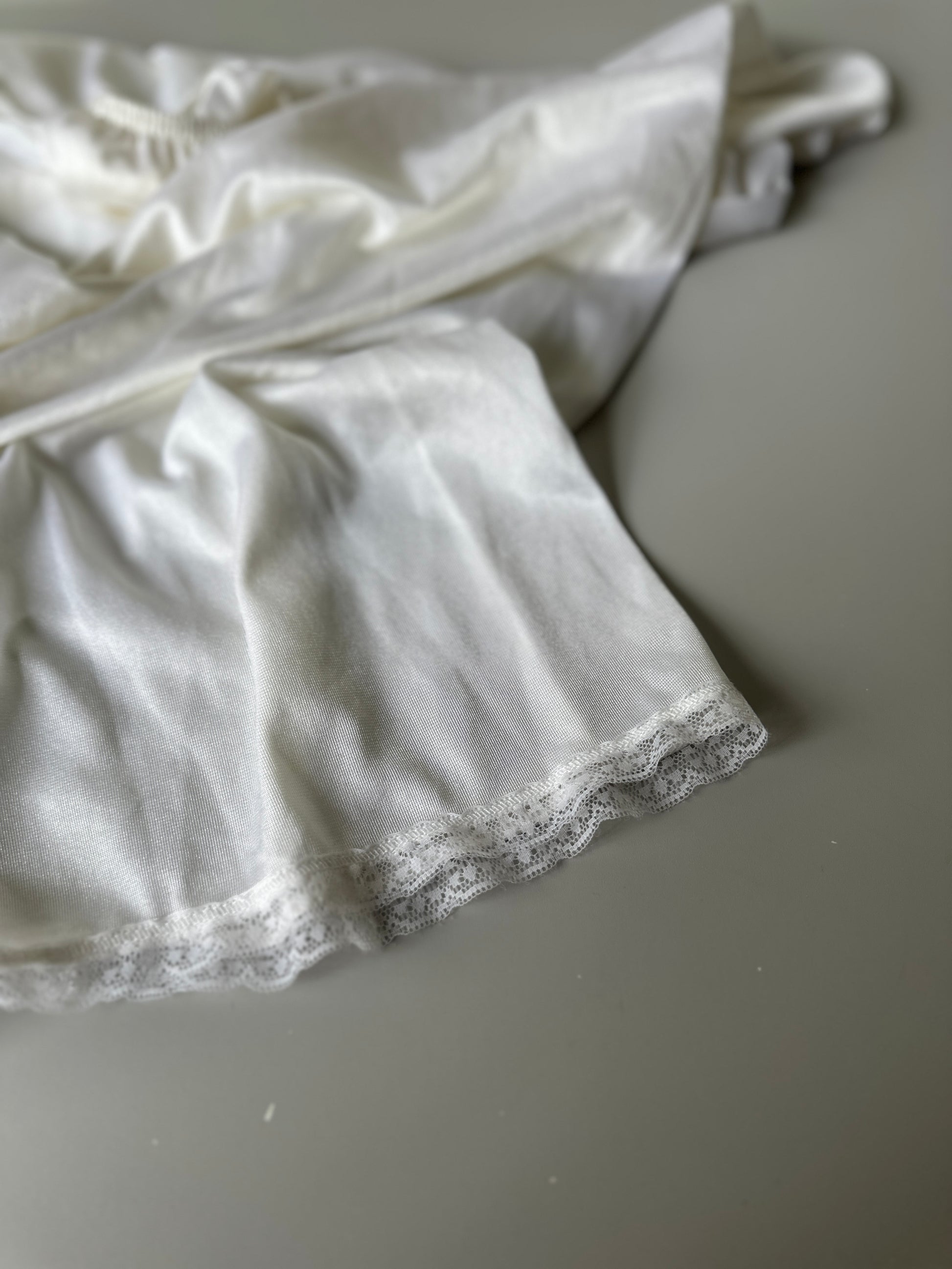 description. a white solid under garment slip skirt with small lace trim. Made in Australia